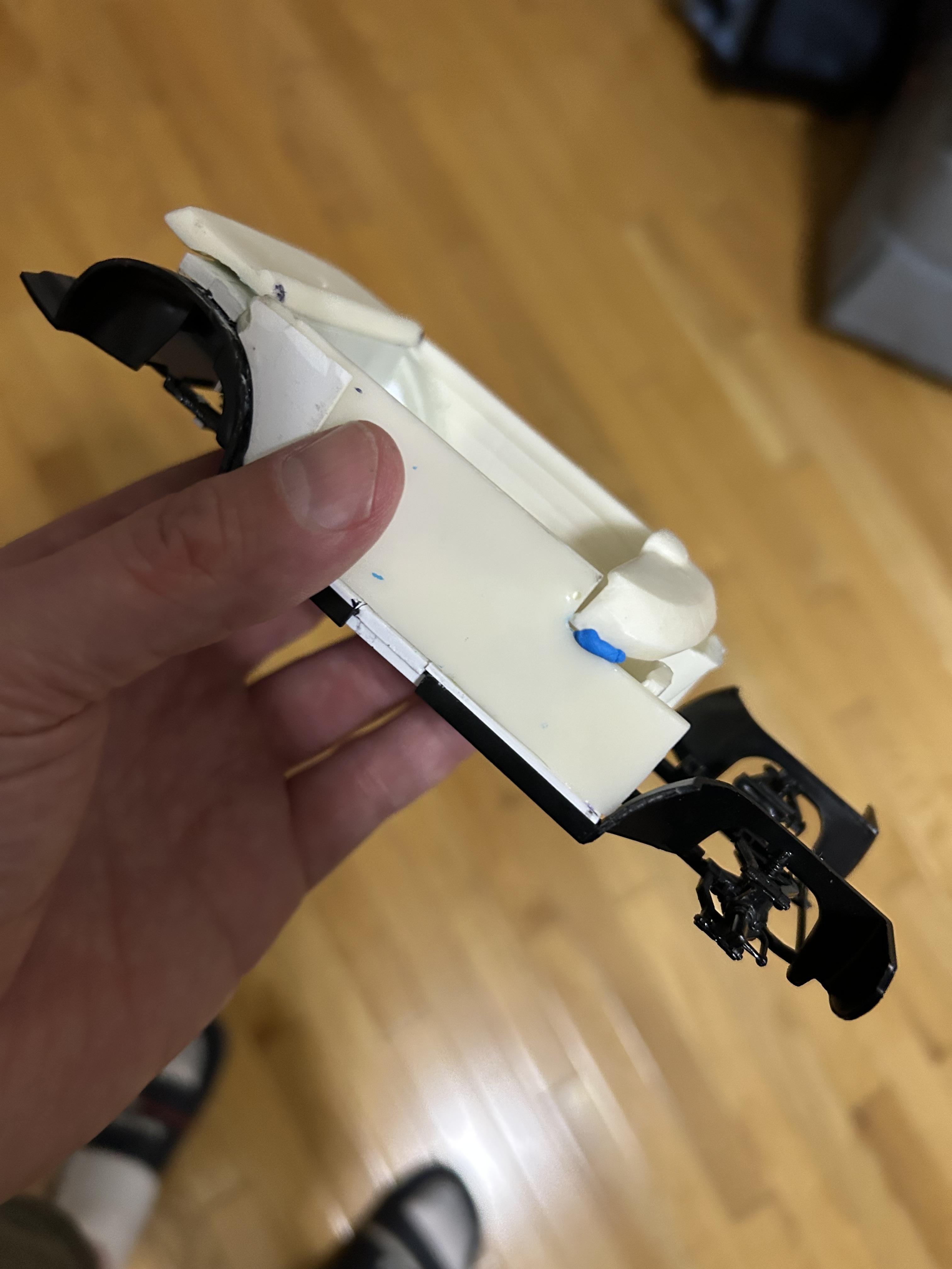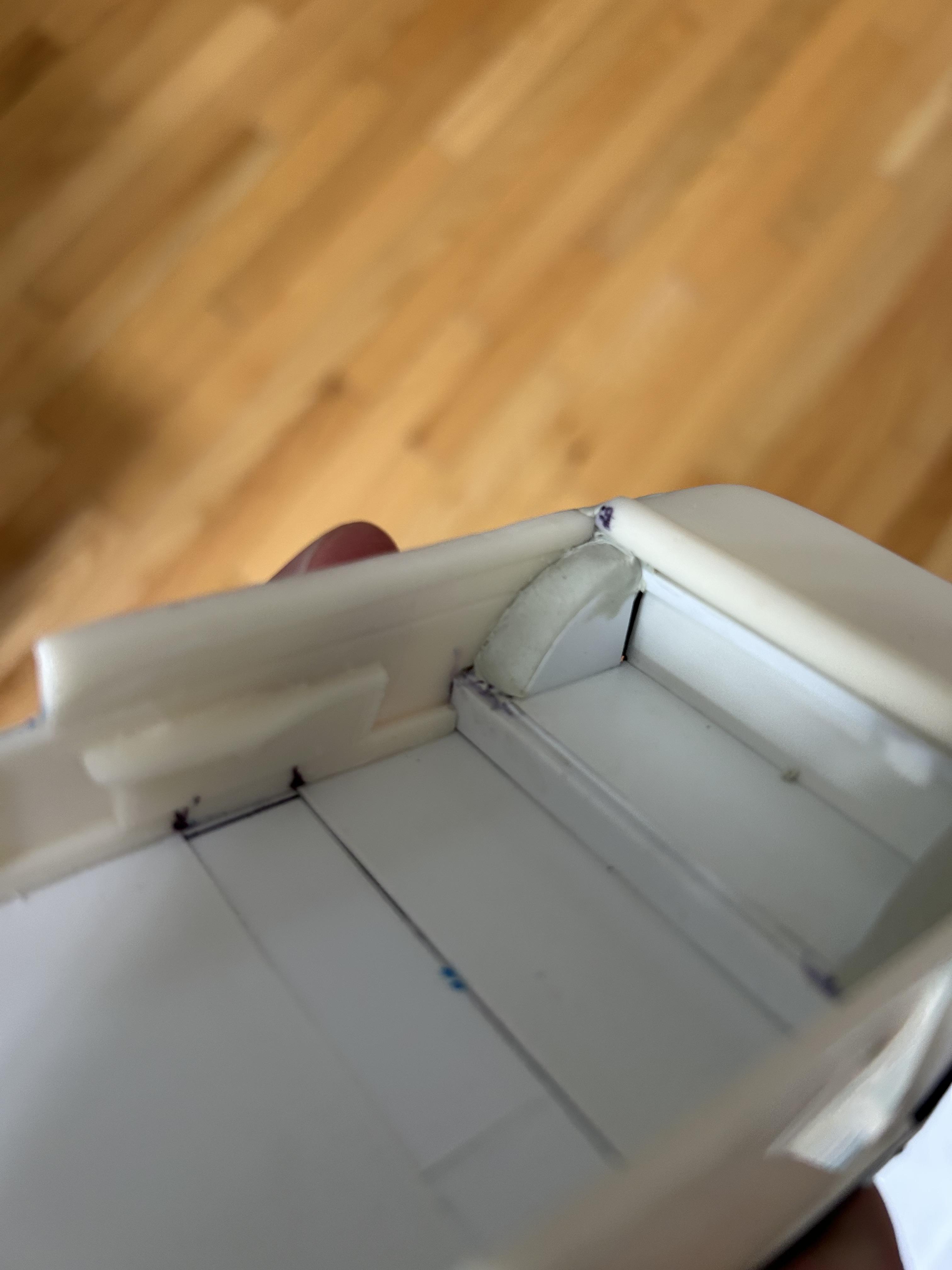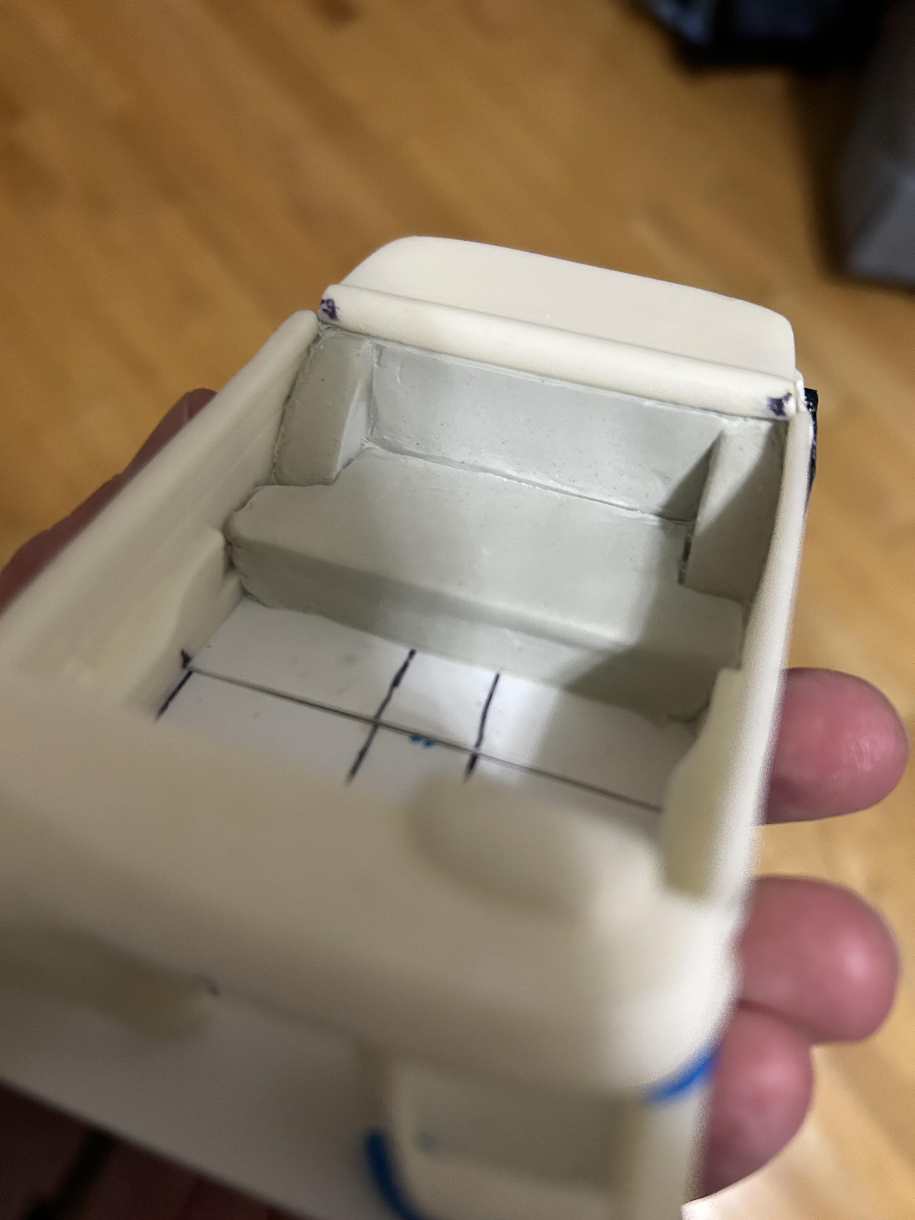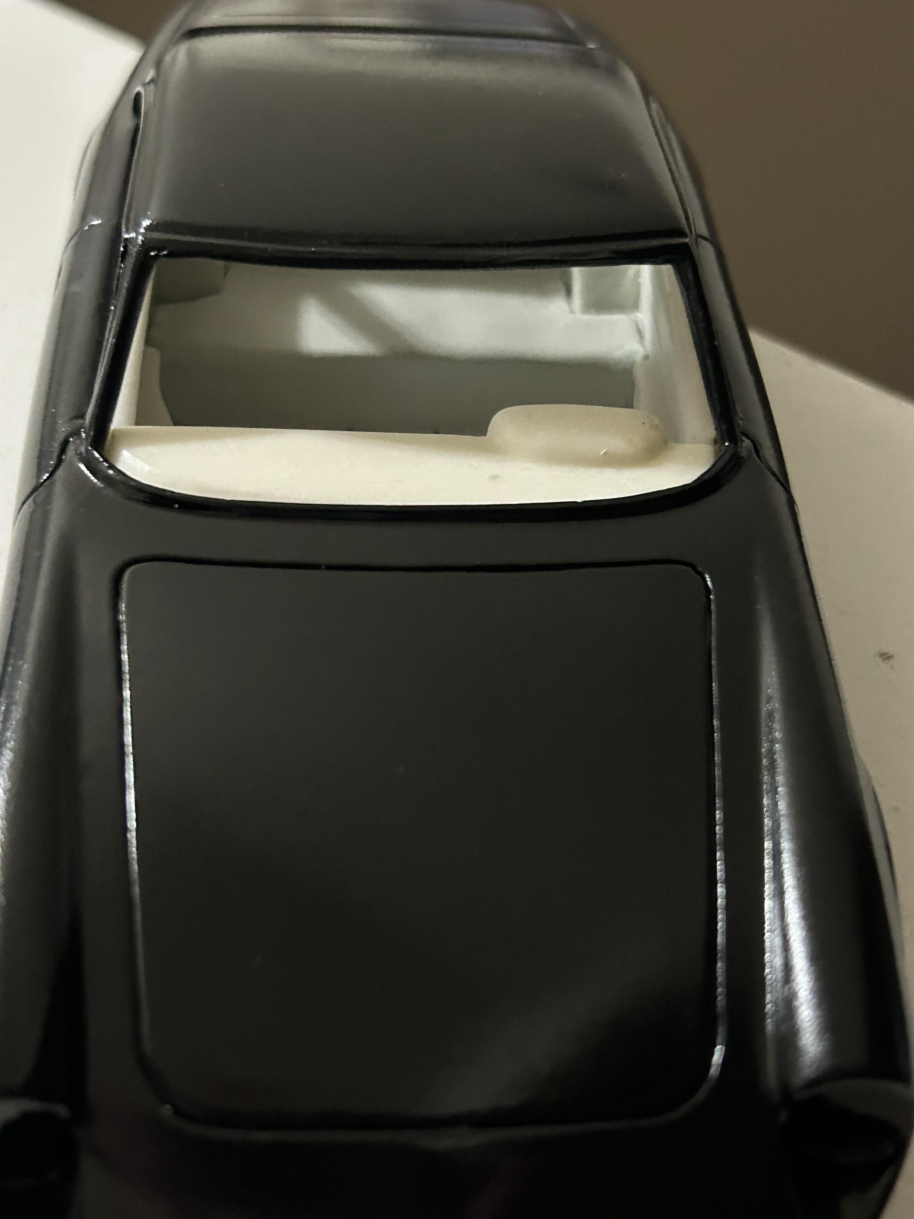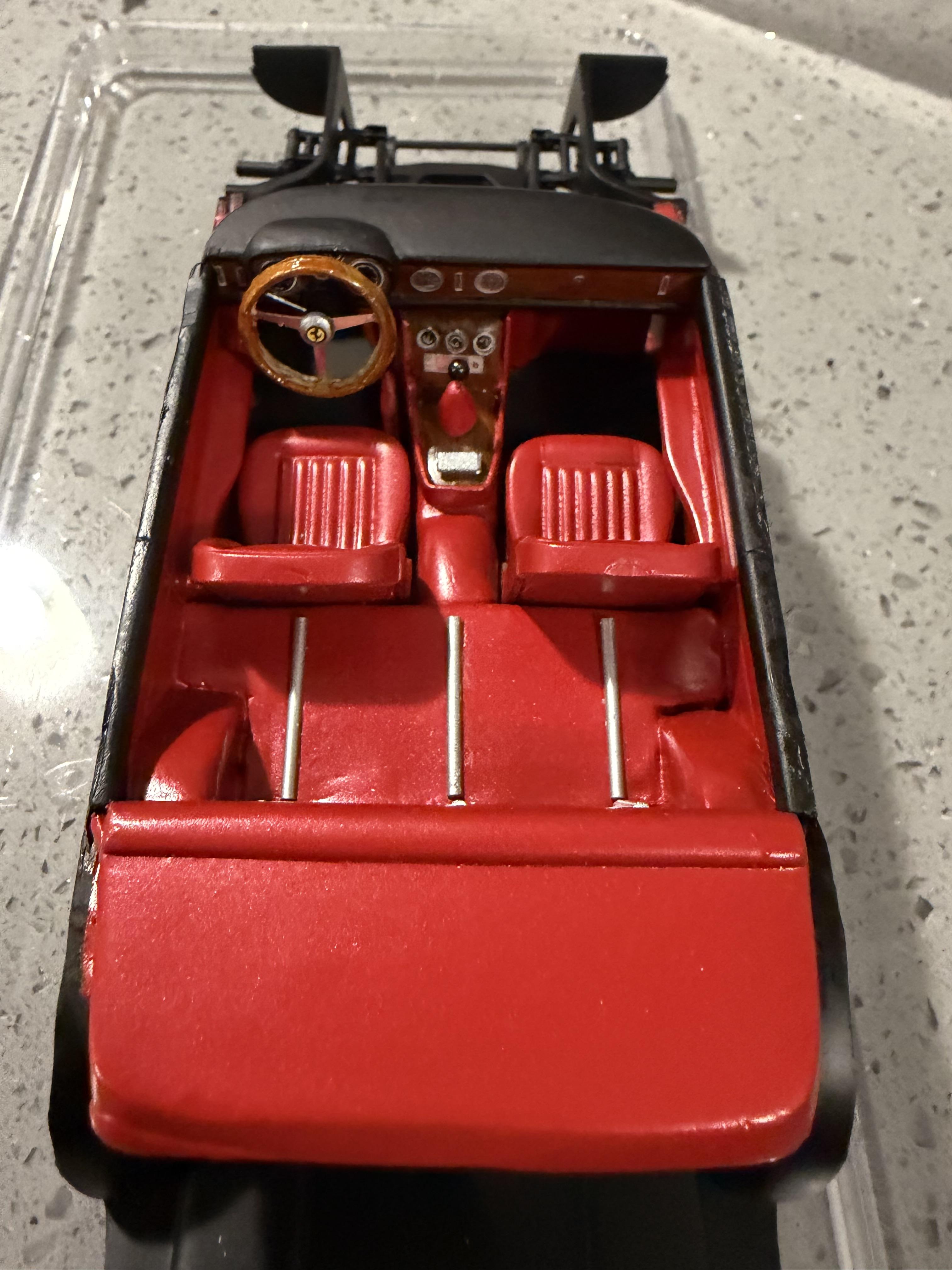 Air Trax kit that I’ve been working on over past few years. Was missing several parts including center console which I will try to make next. the chassis that came with my kit was not useable. I have chopped and stretched an italeri Ferrari Daytona chassis as a replacement. today boxed in the the rear parcel shelf, made new fender area and parcel shelf with polystyrene and apoxie sculpt Will like change color to metallic brown to replicate Peter Sellers car