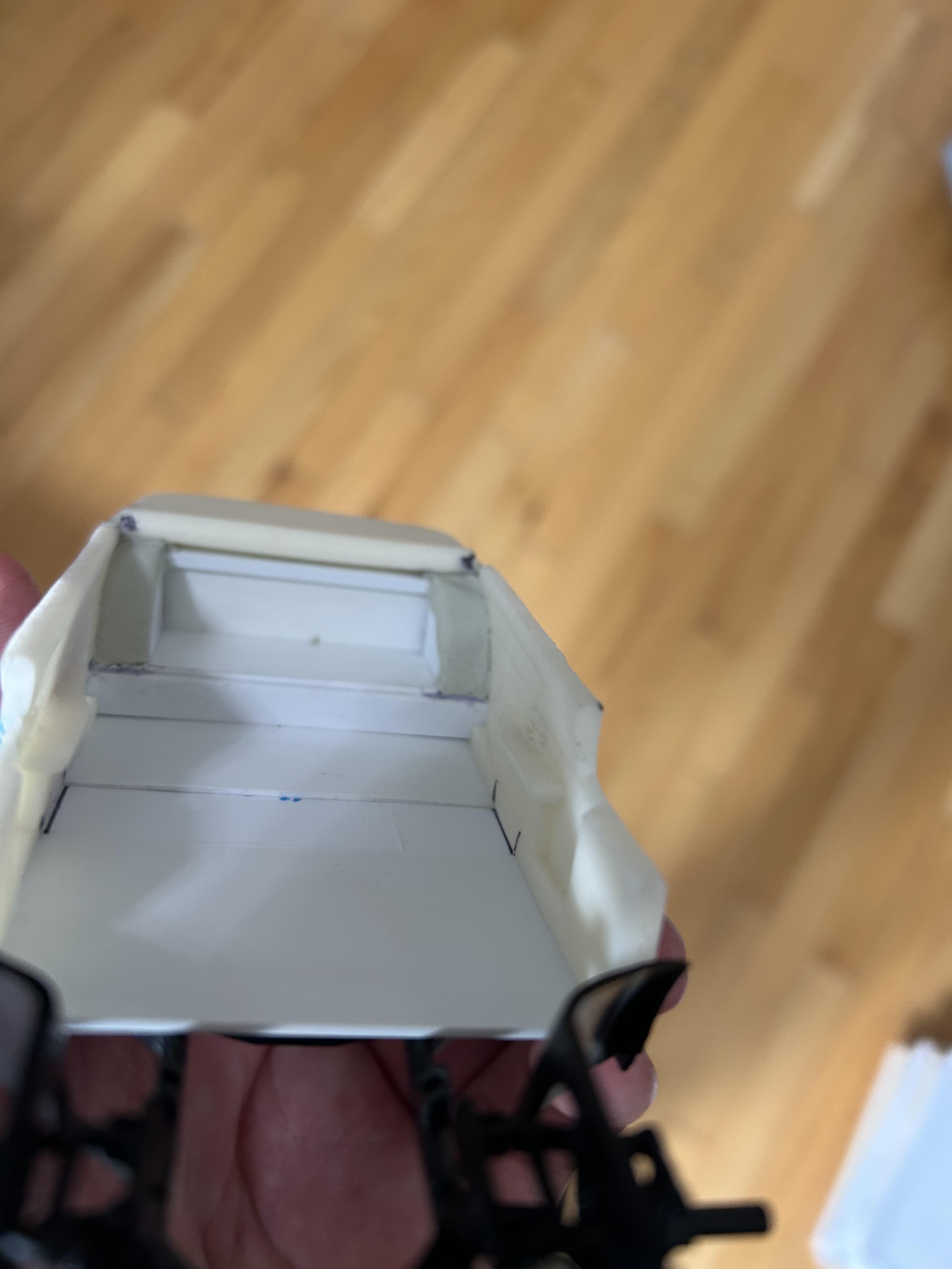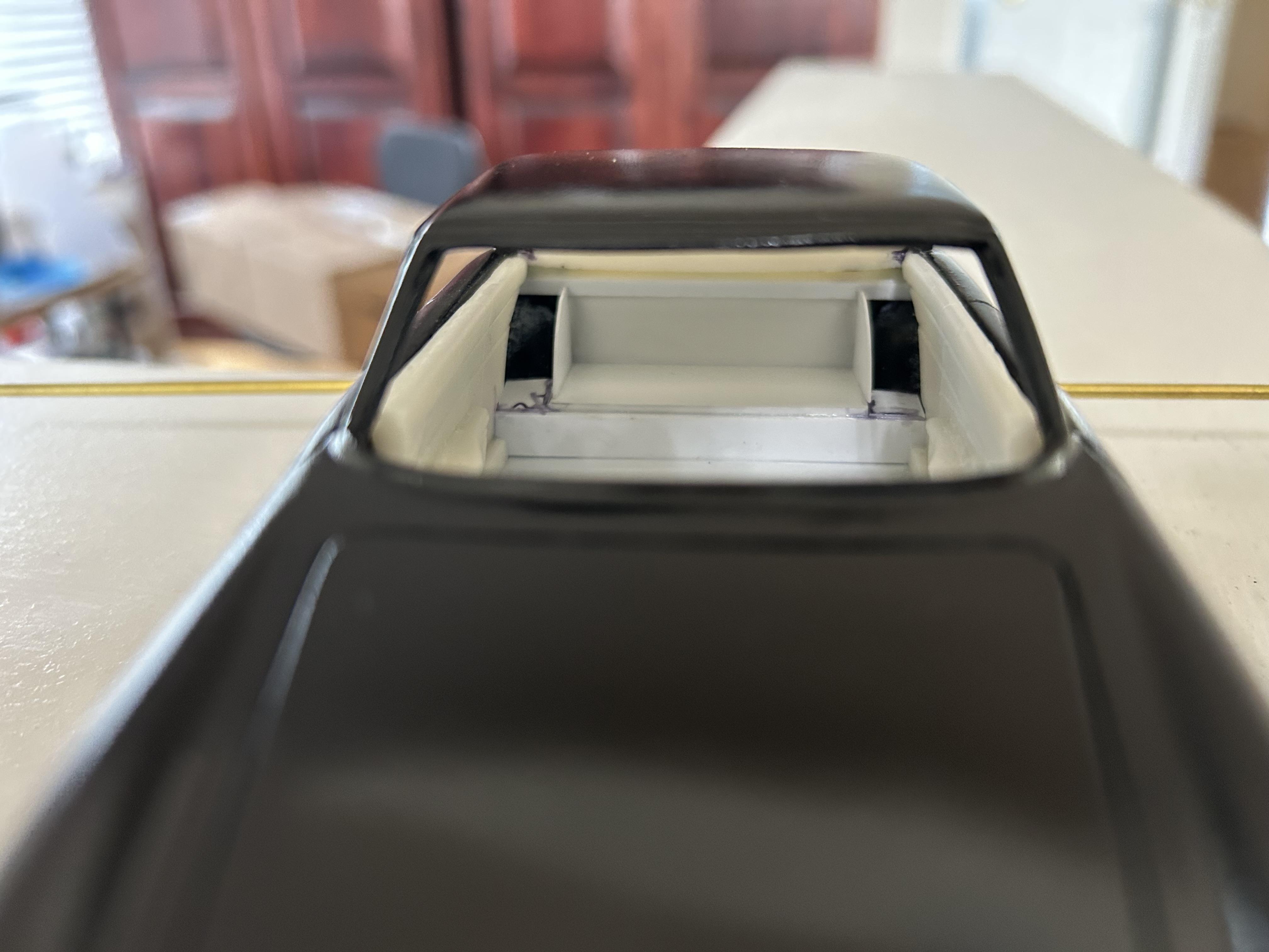 Windshields in. Had to make my own front windshield as couldn’t get the kit one to stay in place without interfering with dashboard. With progressive cuts to fir with dashboard no longer had enough material to secure in place. Replaced with .005 inch clear polystyrene sheet opting against side windows