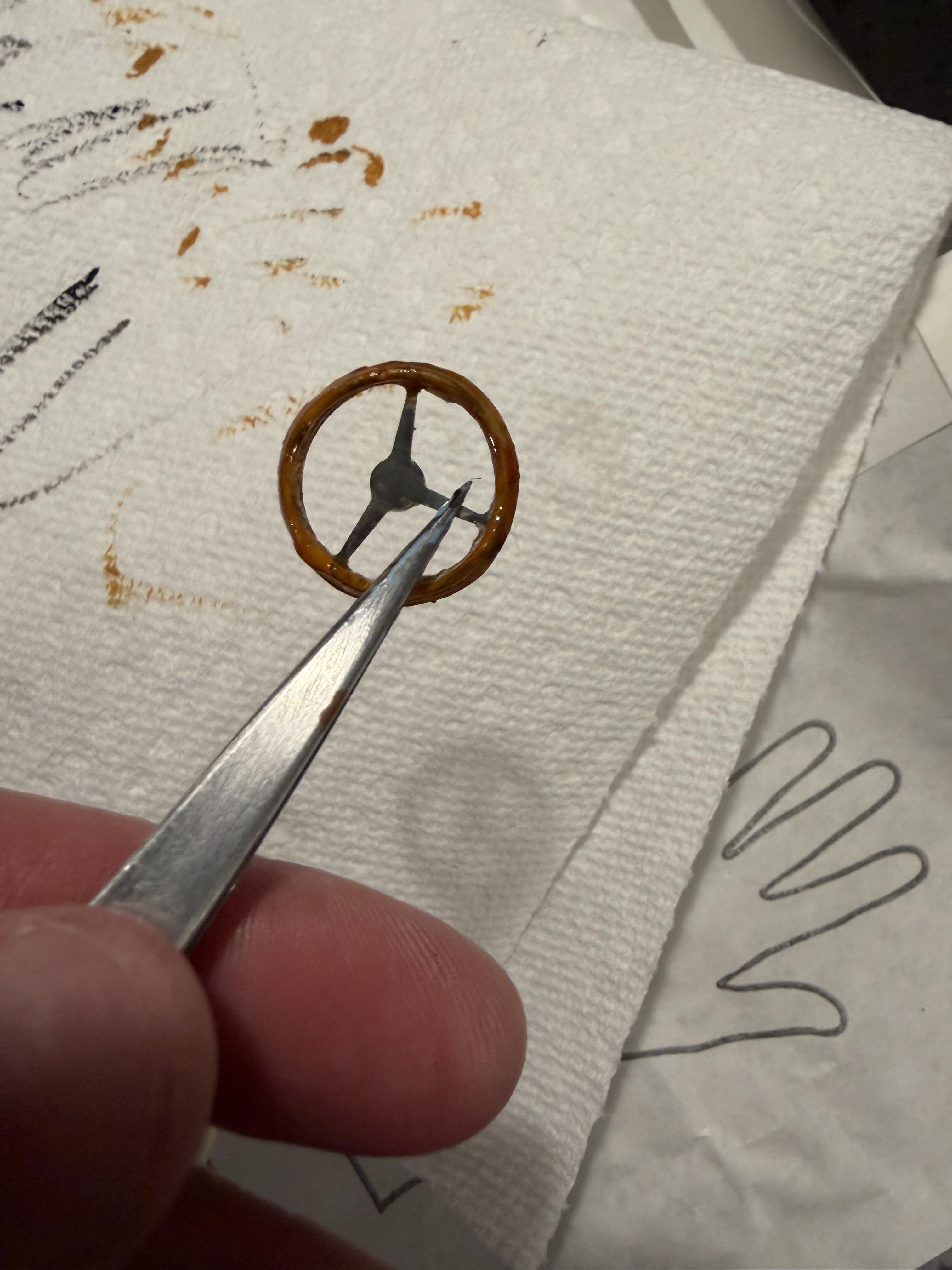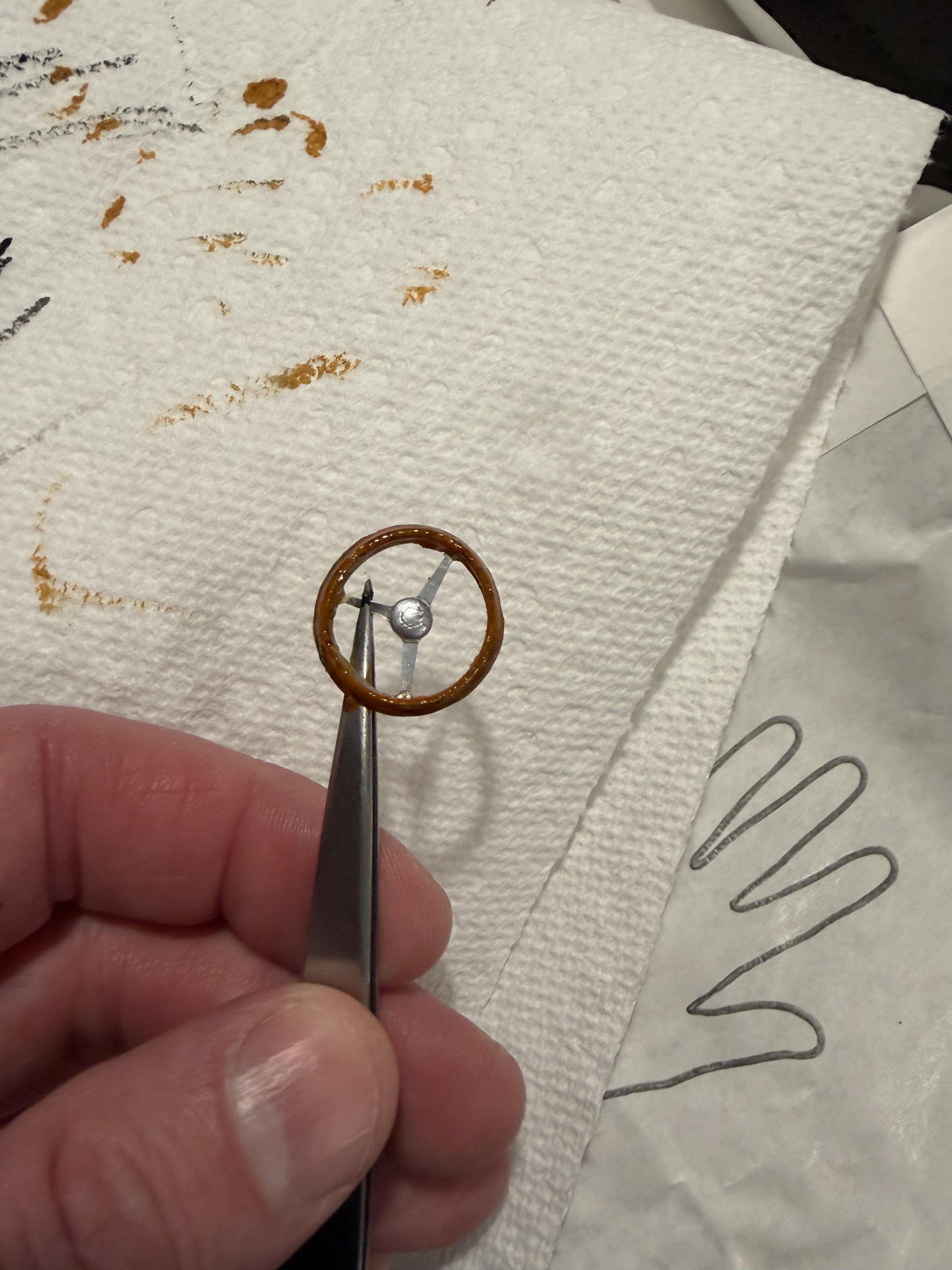 Steering wheel the kit only includes the photoetch ring to make the wooden rims I made a resin mold of the fujimi Ferrari 250 gto steering wheel. Then used clear uv resin to make 2 sides of wooden wheel and center horn button sanded and shaped and painted