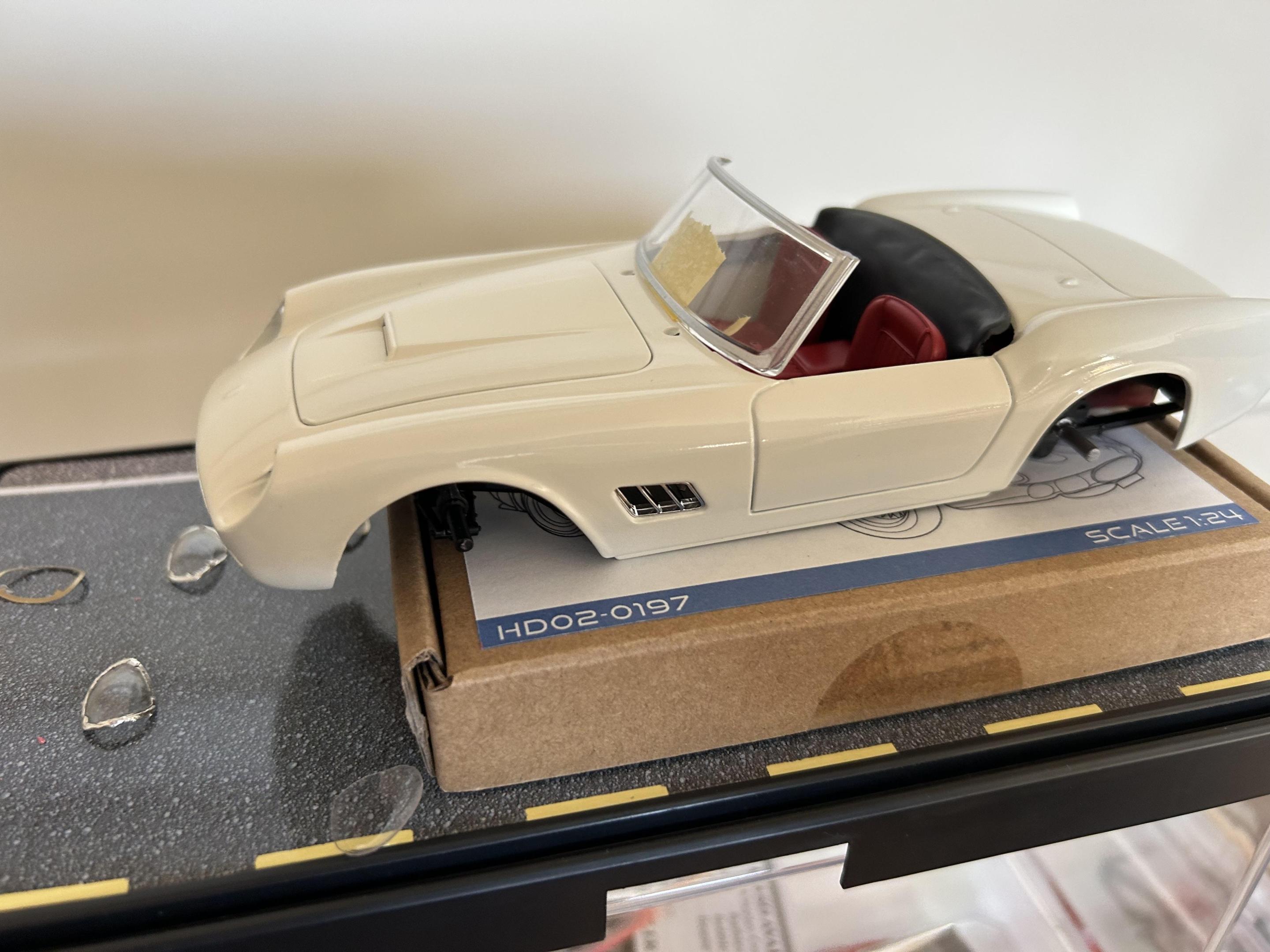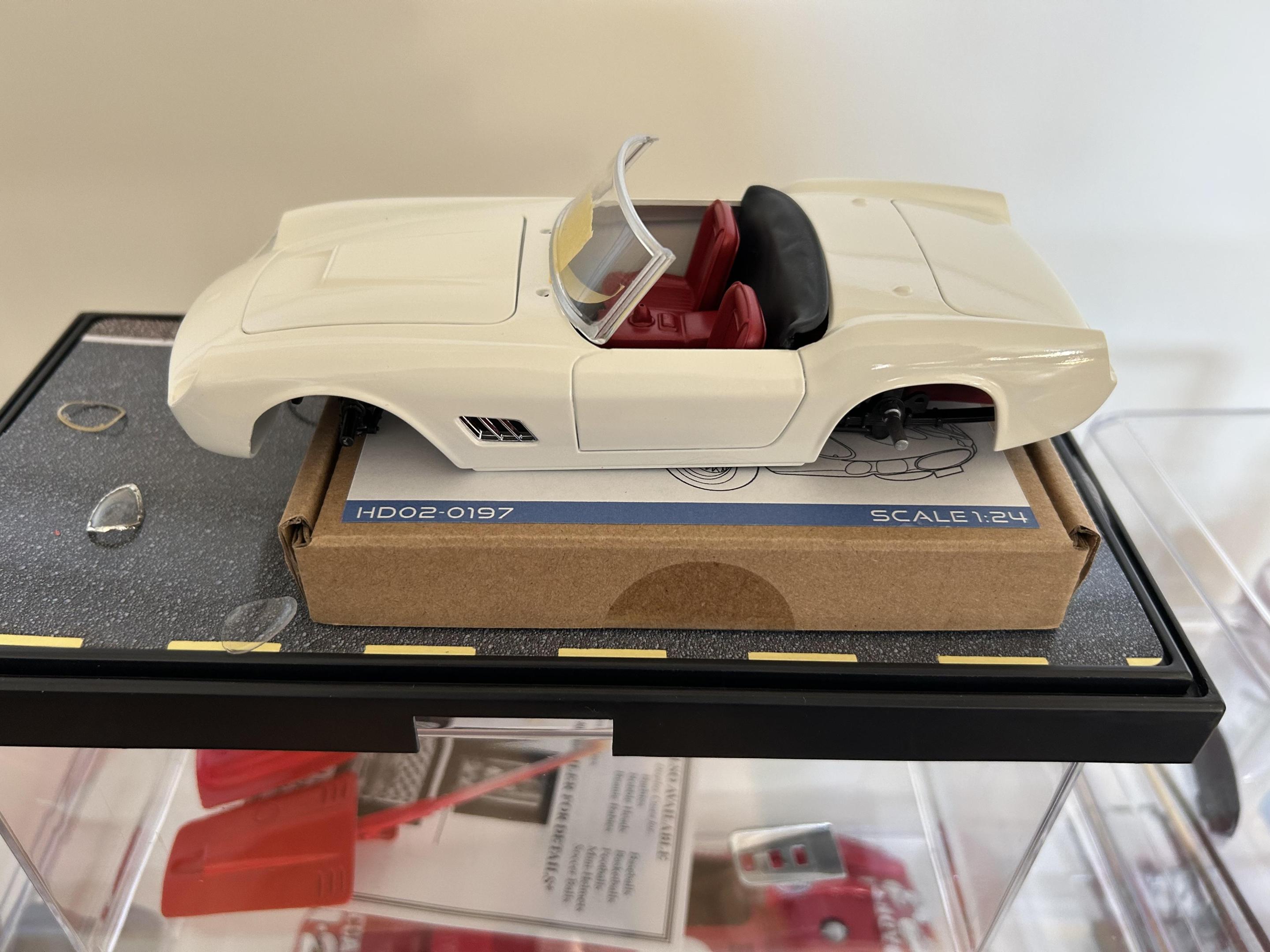 Italeri ferrari 250 Californias reshaped fenders, vacuum formed headlight covers. Aftermarket photoetch headlight cover surrounds for 250 gto, replicas and miniatures of maryland interiors, engines, and wood steering wheels. Windshields from 1/24 diecast Californias, photoetch wire wheels, various made parts
