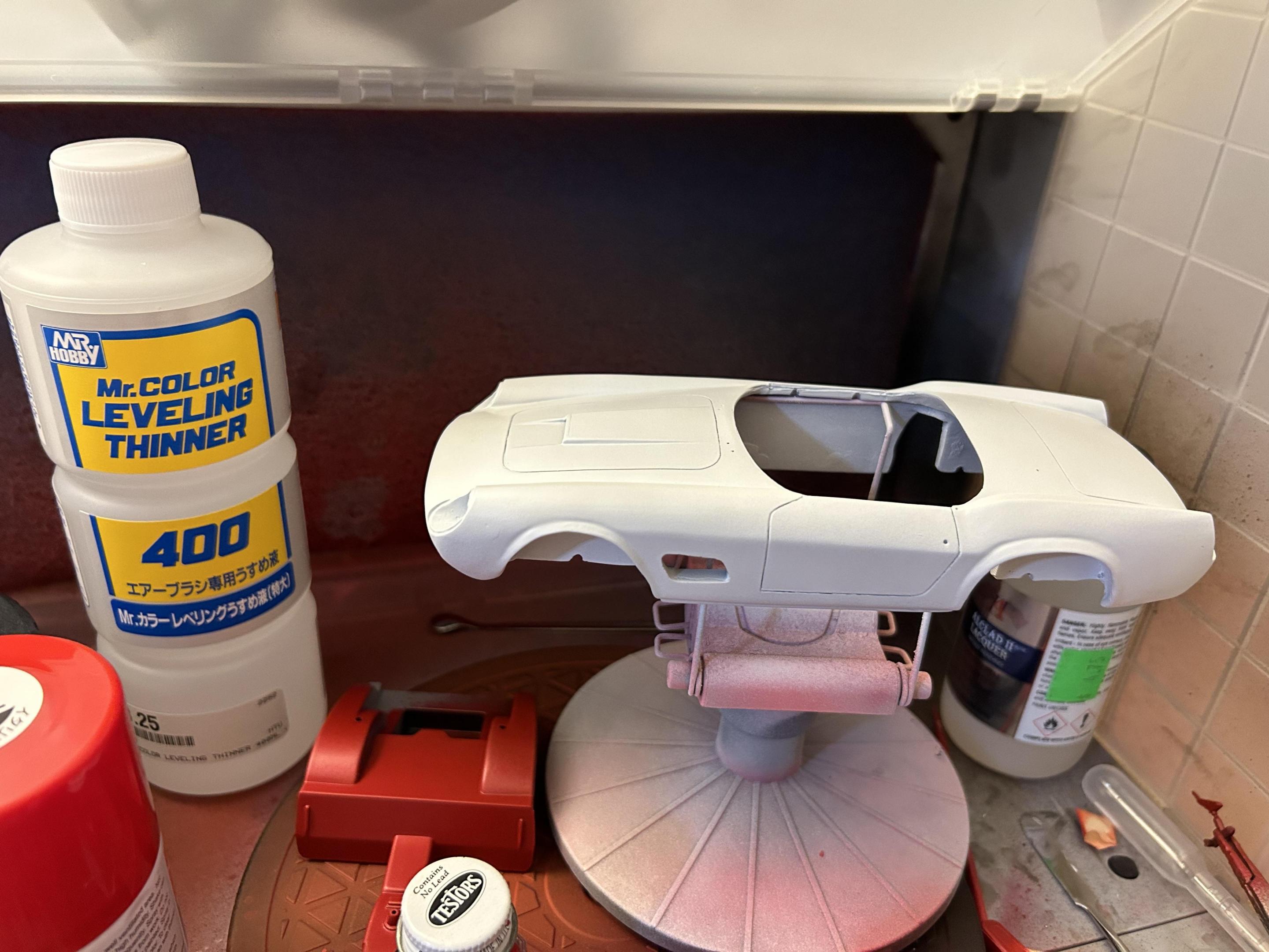 The color is a mix of tamiya lacquer paints white and racing white. I believe I settled on 50/50 mix. Then thinned 50/50 with lacquer thinner. (Mr hobby leveling thinner) Sprayed several coats followed by airbrushed tamiya clear lacquer. The tamiya bottled lacquer paints are great. I am new to airbrushing and they go in super smooth. Much better than spray cans. You can order on Amazon if your local hobby shop doesn’t carry.