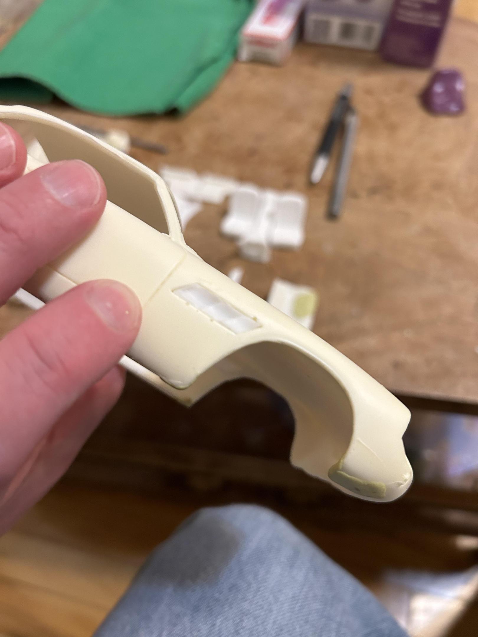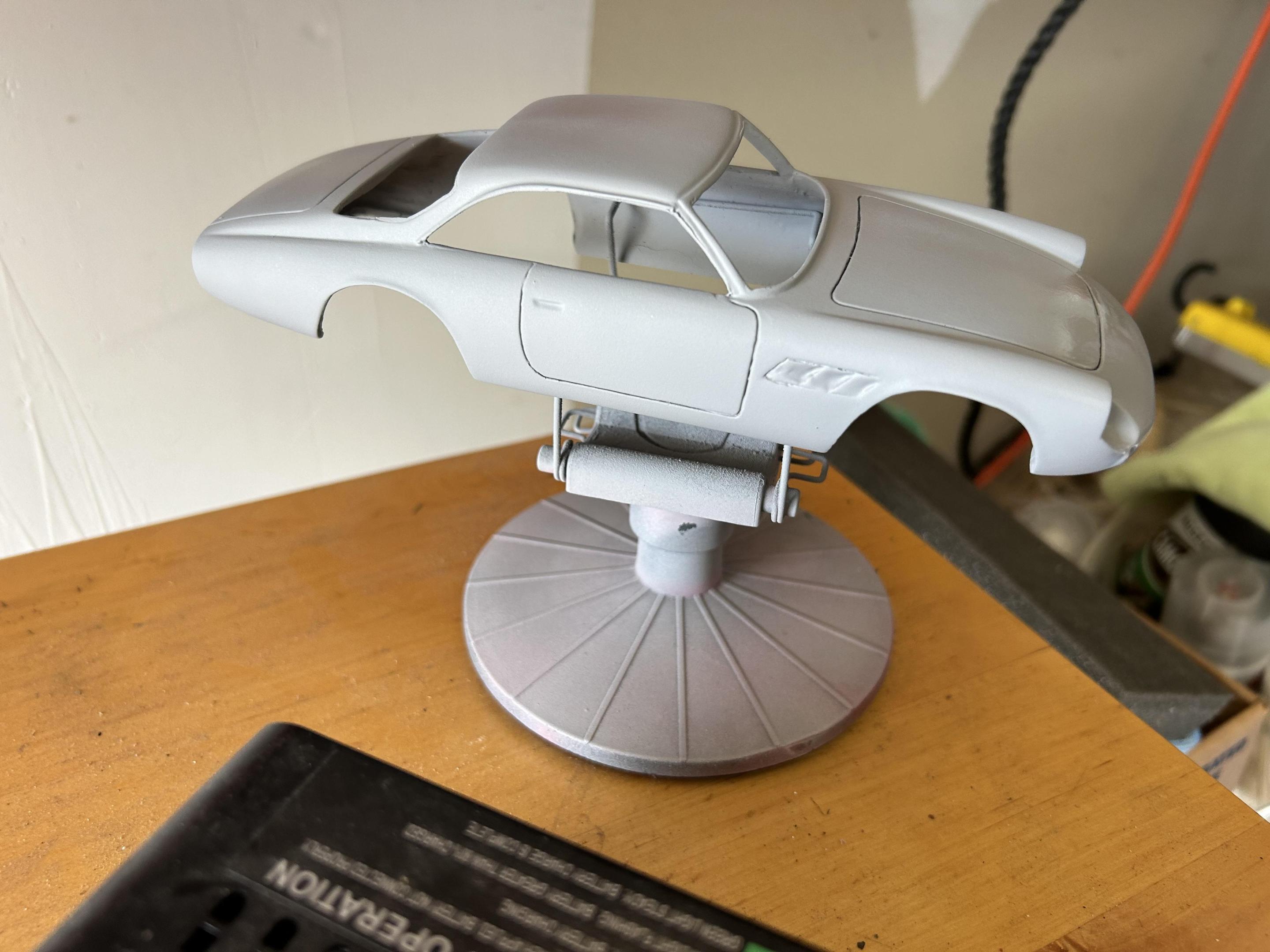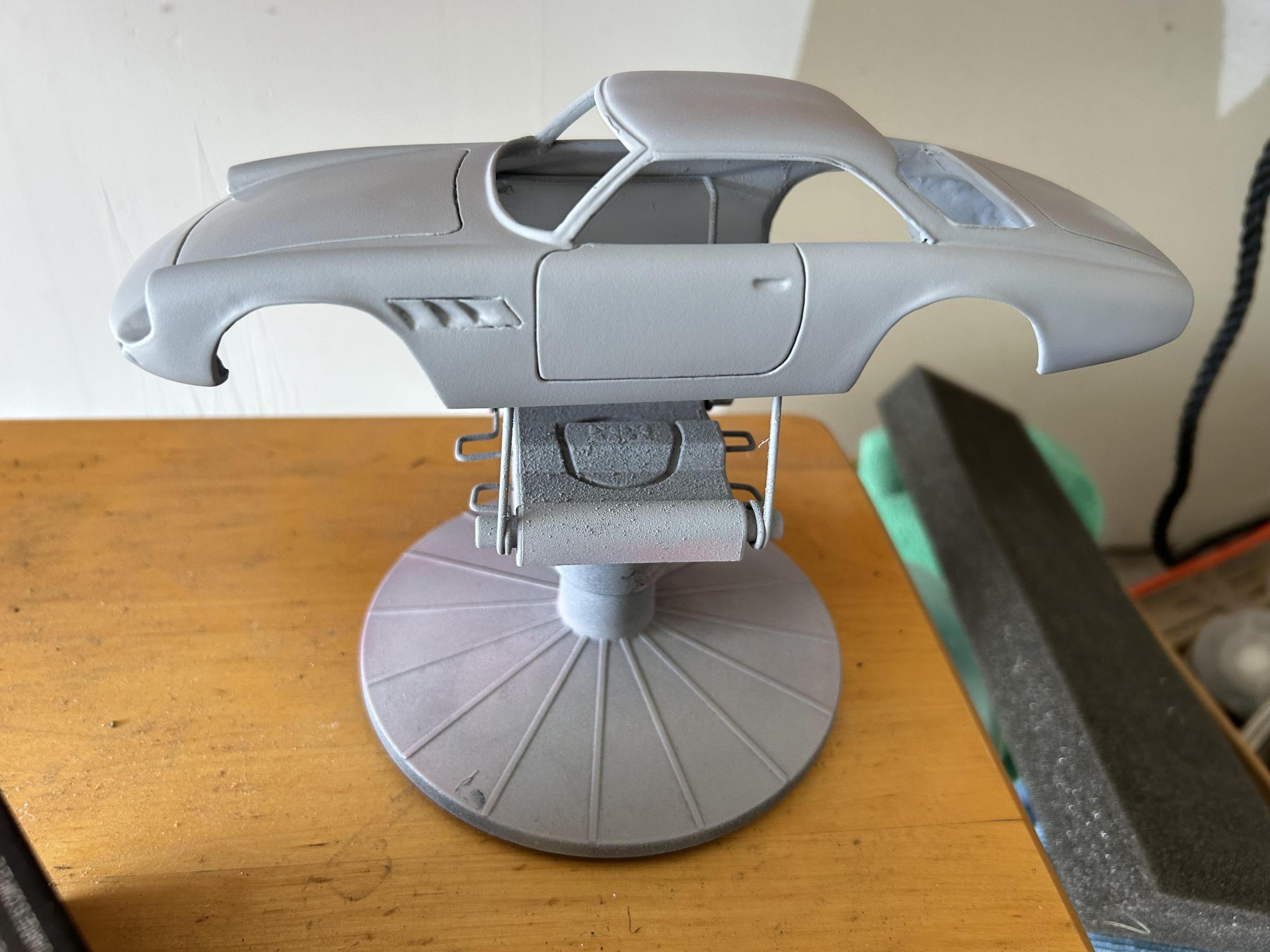 A third Ferrari in process. Renaissance Ferrari 250 California. Filled in defects under front and rear with 2 part epoxy. Removed extra lip where windshield attaches primed with gray and white primer