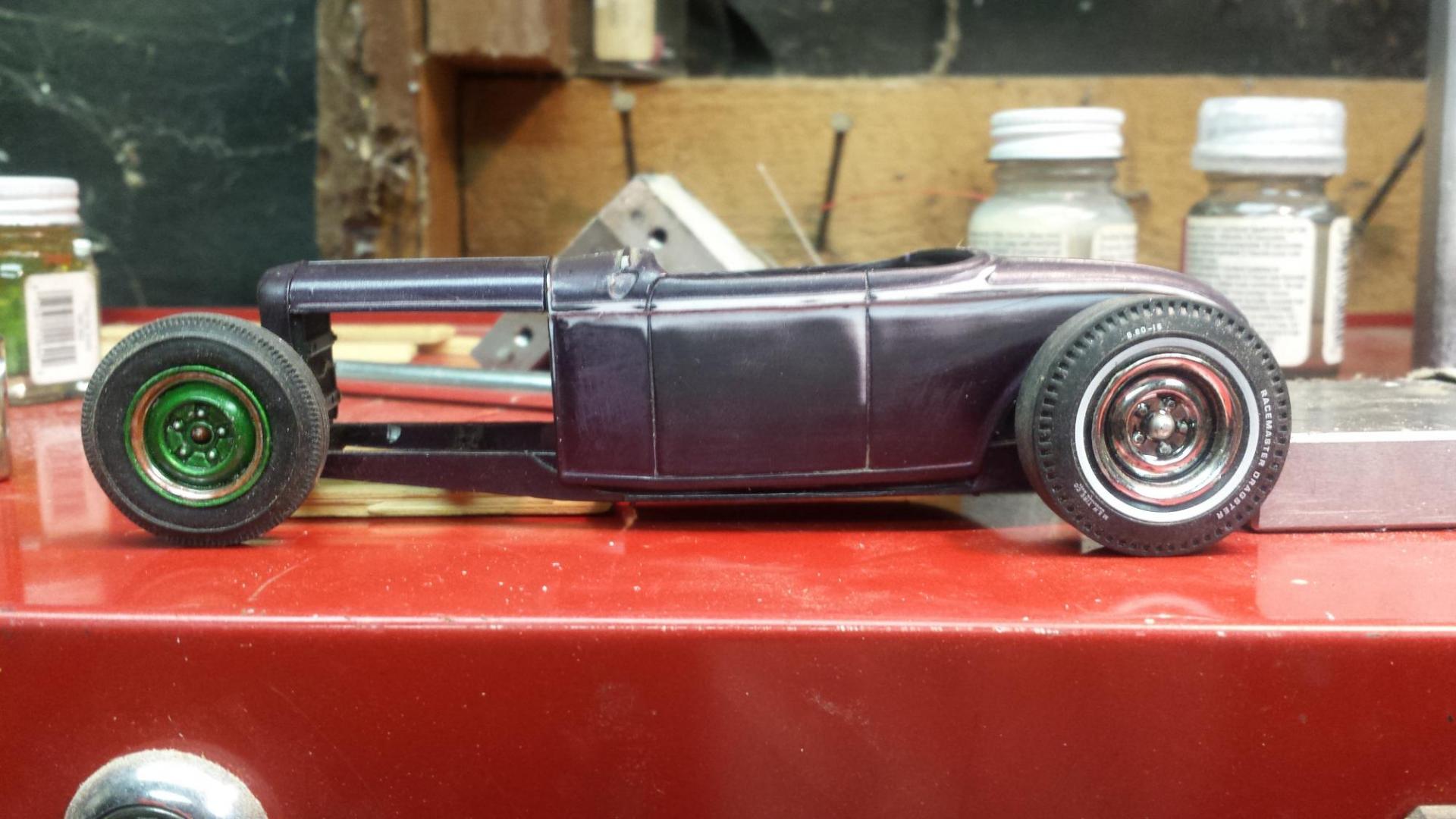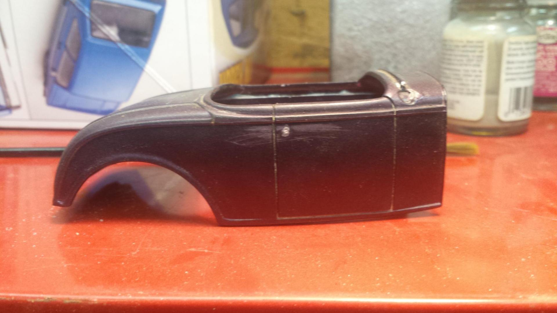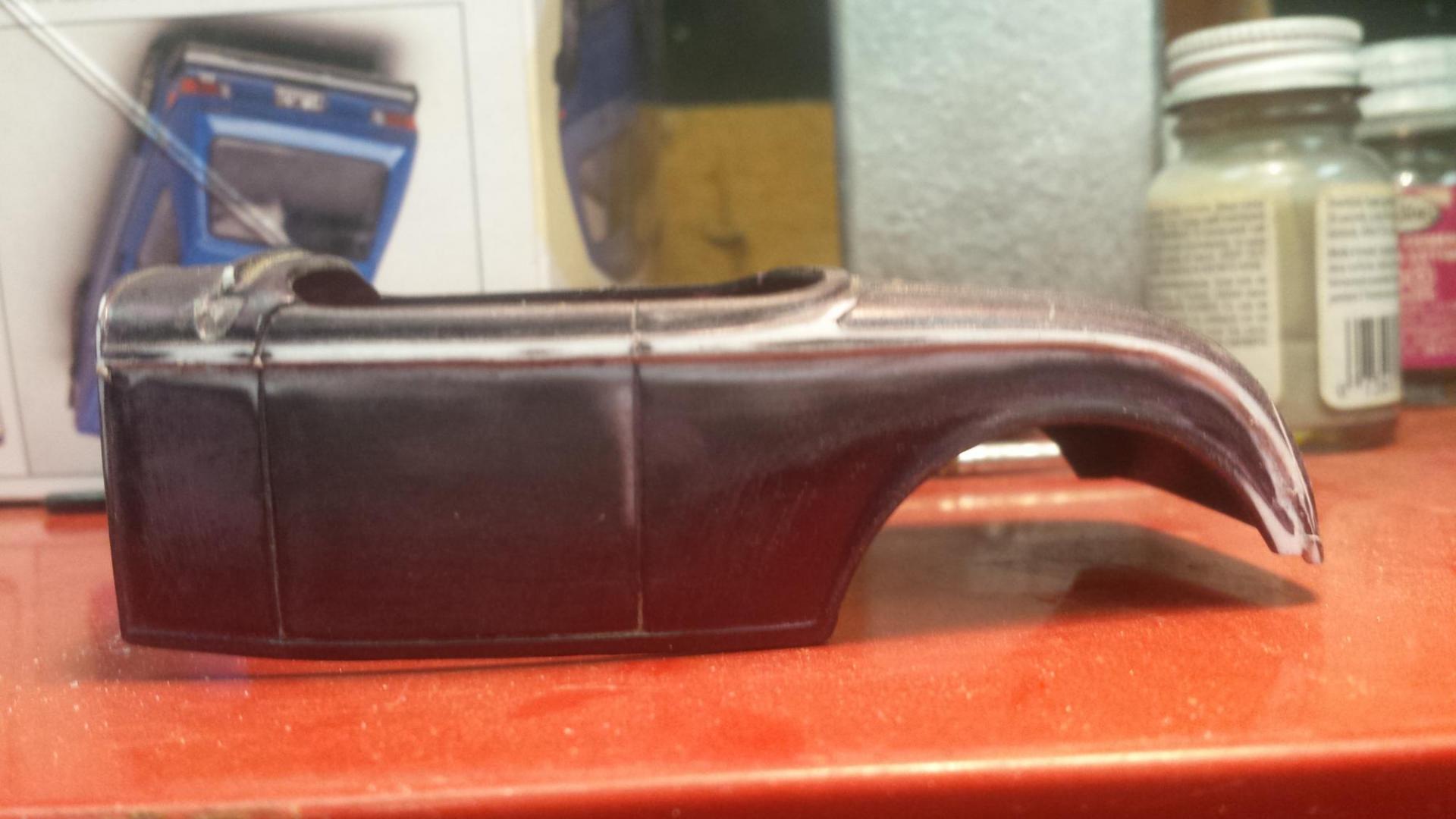 As I've been plugging away at a few different projects, I've decided to try and rescue one of my older builds, a Revell 1932 Ford Roadster. Digging through my styrene graveyard I've come up with a Flathead, so I think I'll be going with a Salt Flats direction with it. Of course, the roadster body doesn't have hinges, so I may either try to fab up some decent hinges, or go more streamliner, I haven't decided yet. What I have decided, is its going to have a 2" section, and got that done last night. I'm pleased with the results, but it still needs some work. Excuse the purple color... I don't know what I was thinking when I originally built it. Here's the before "stock" body, and after, sectioned body: