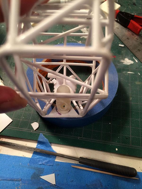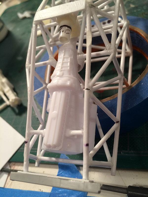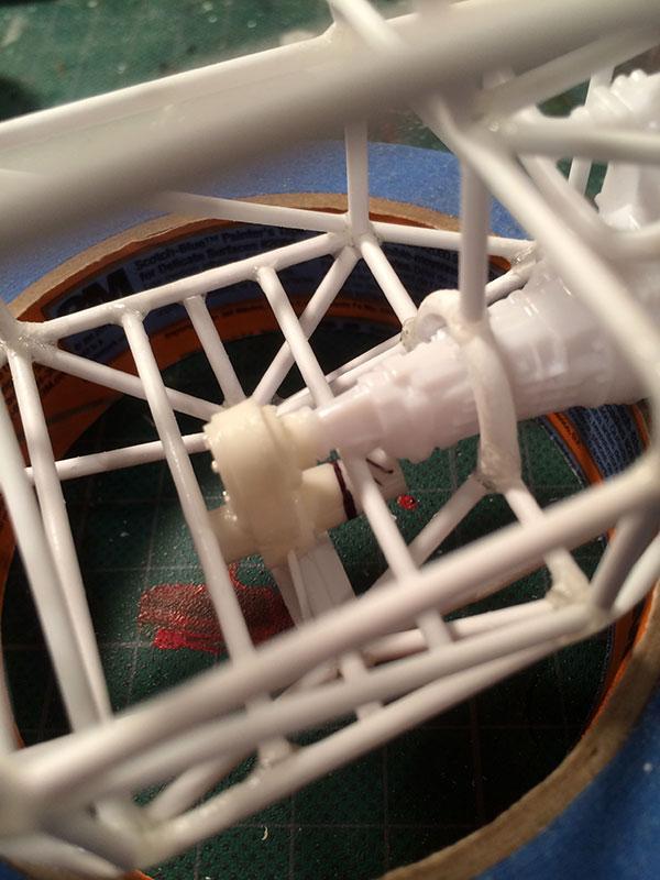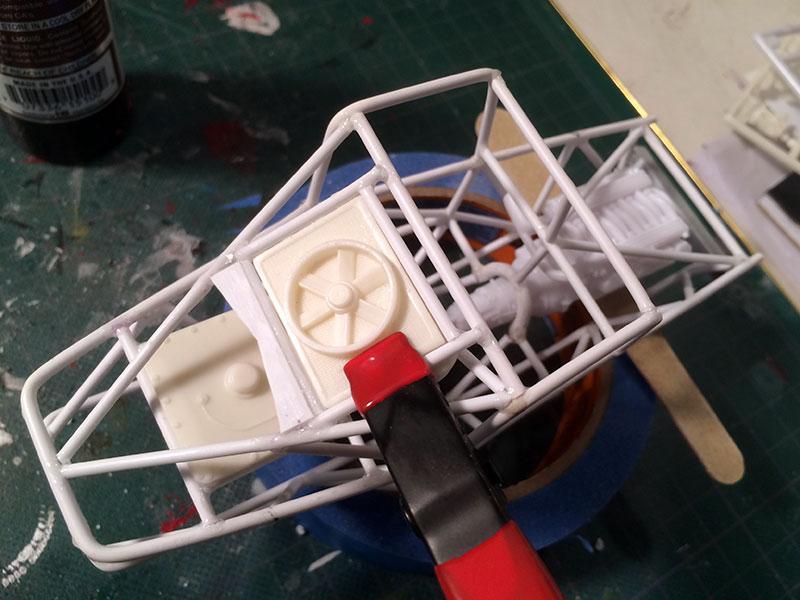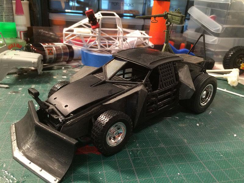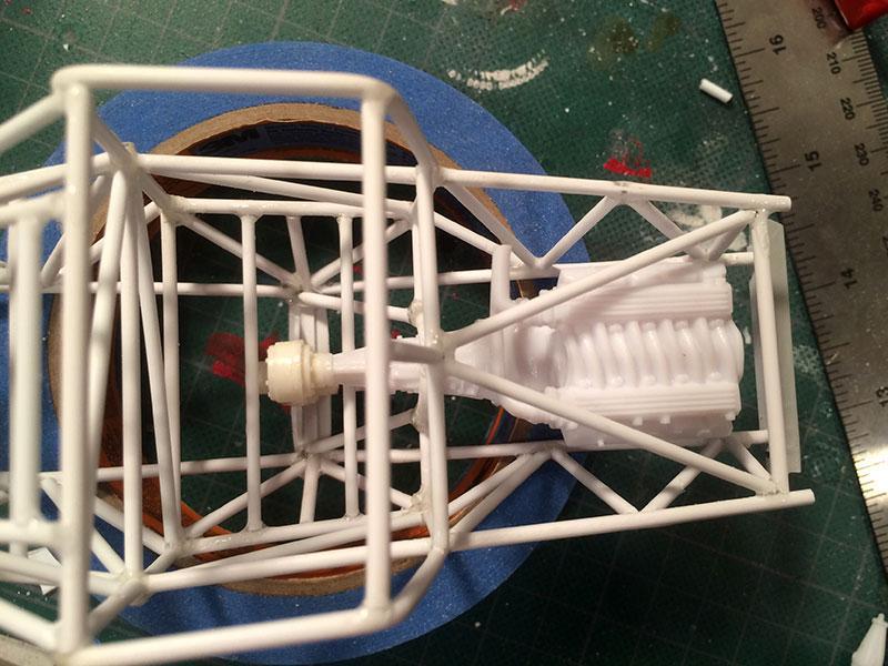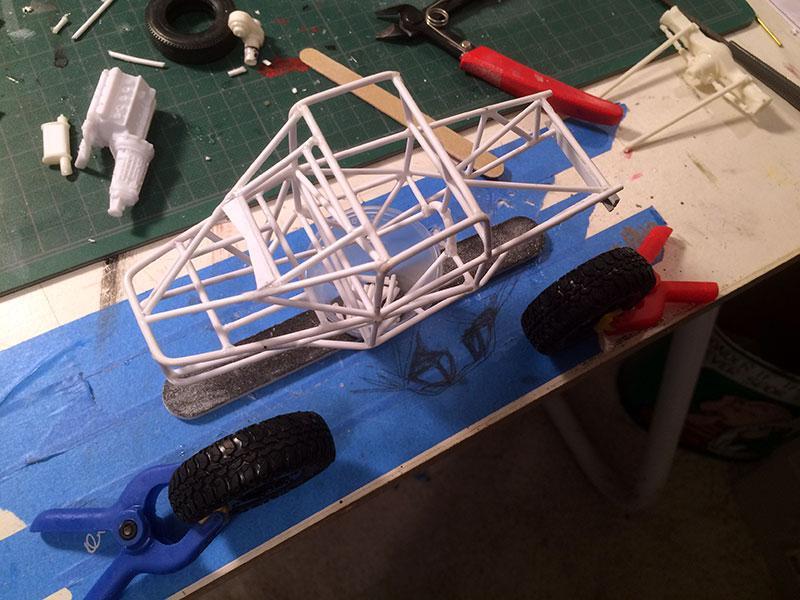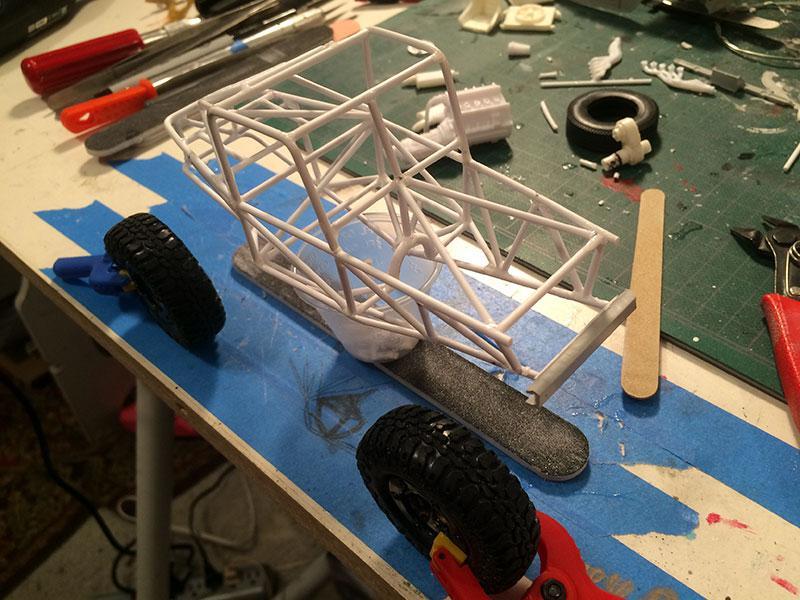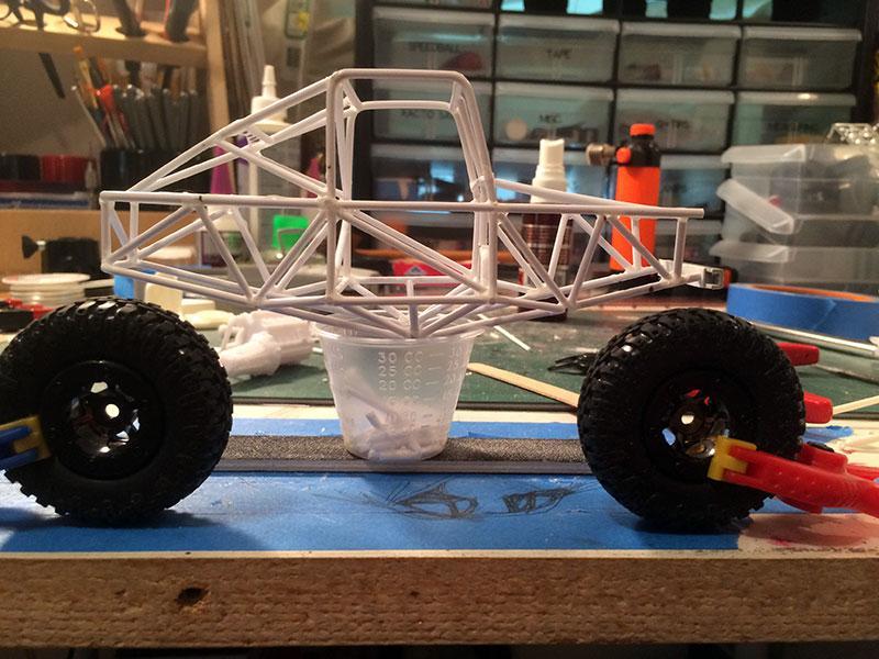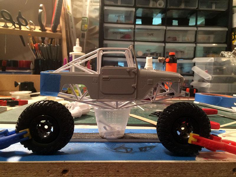 I'm using the body from the Italeri Armed Pick-Up (I bought the kit to use the gun for a NASCAR-based zombie hunting ute), the suspension and various parts from the AMT Bigfoot kit, the Viper V10 from the Monogram Dodge Ram VTS kit (1/25, but it works), a scratch-built frame, and Losi RC wheels that scale out to 48".