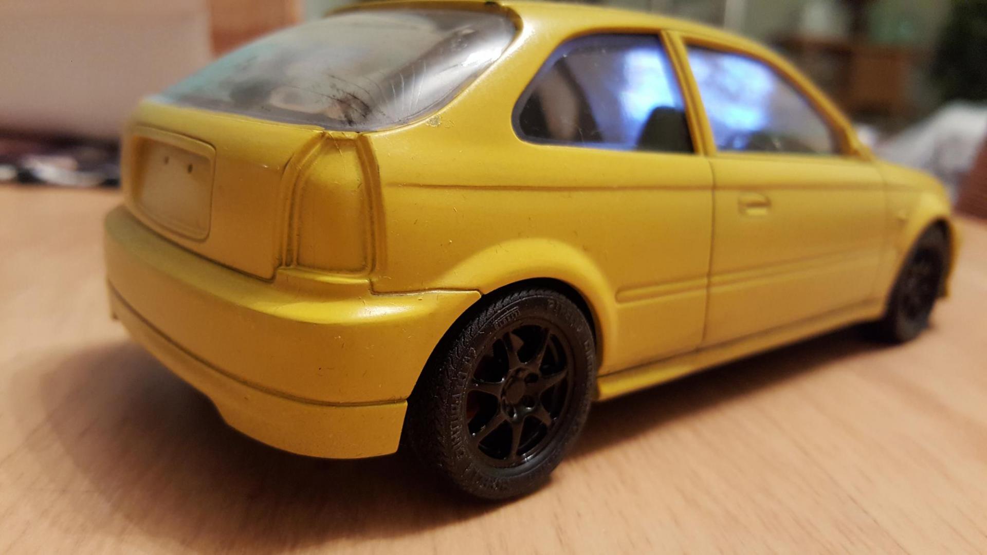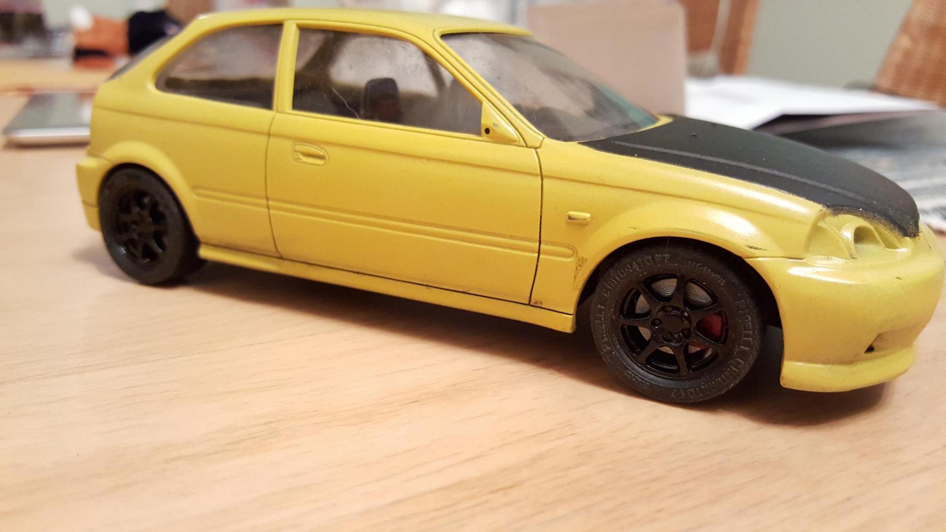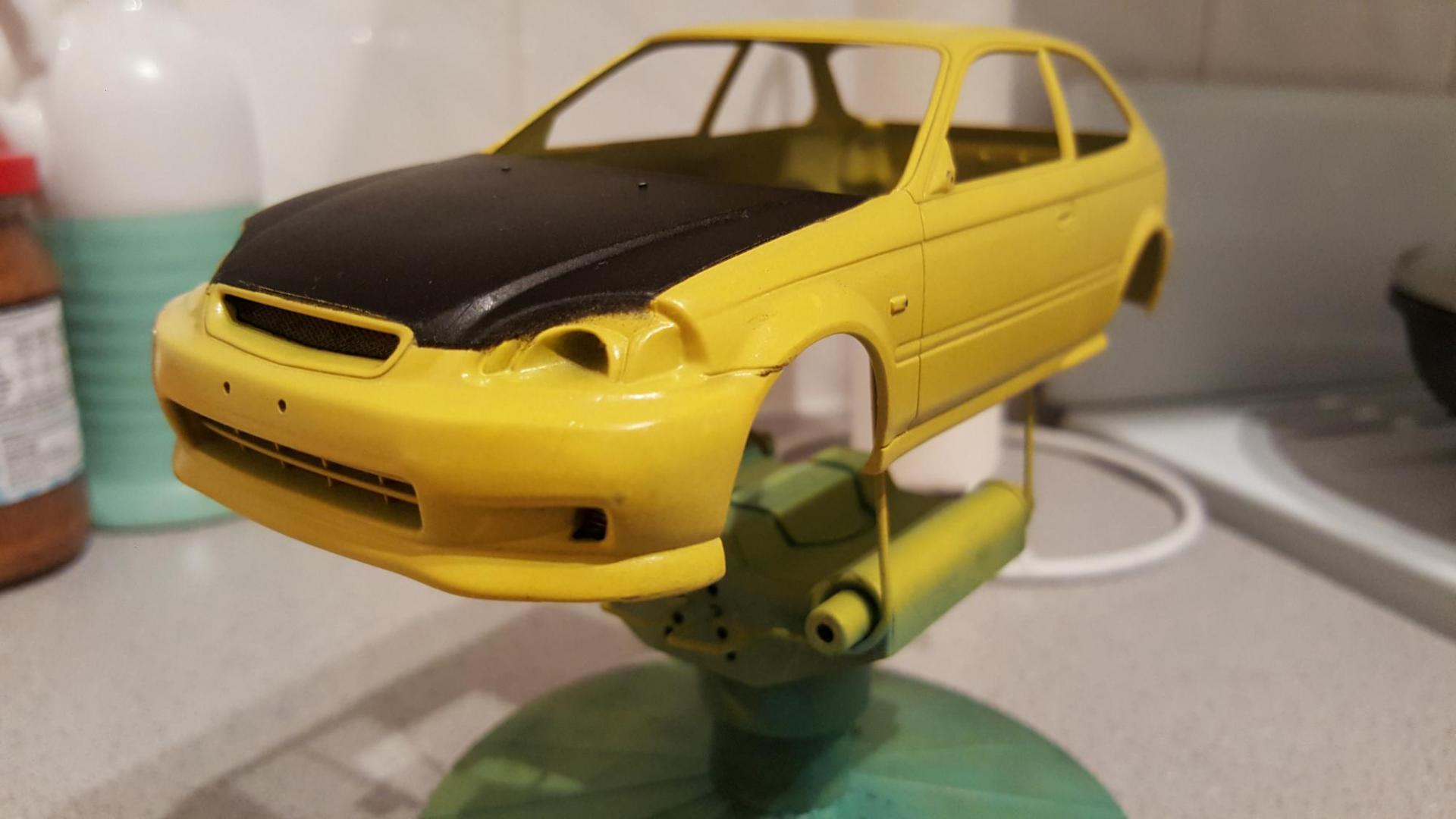 Hi all, So the 1966 Chevy Nova project has been put on hold till I can get to a shop to get more body paint (lesson learnt with the EK9 project, more on that in just a bit). So I decided to take the Fujimi EK9 kit for a quick build into a Spoon Civic look, it's not quite finished yet but made so many mistakes on the way too. Problems and Bad stuff: - Only had one small can of yellow body paint and the body could have done with another 1-2 wet coat before I sealed it with clear - I then attempted to mask and paint the black accents on the window trims on the clear plastic and turns out using painters masking tape instead of something like Tamiya tape, I had runs and leaks so had to wash that off and not as clean windows - Just general small bits of paint blemishes on the body, you'll see Anyway, after all that I am still quite happy how it's turned out given what happened lol. After the final coat of clear and polished using Novas 1 and 2 More on the interior bucket in the next post.