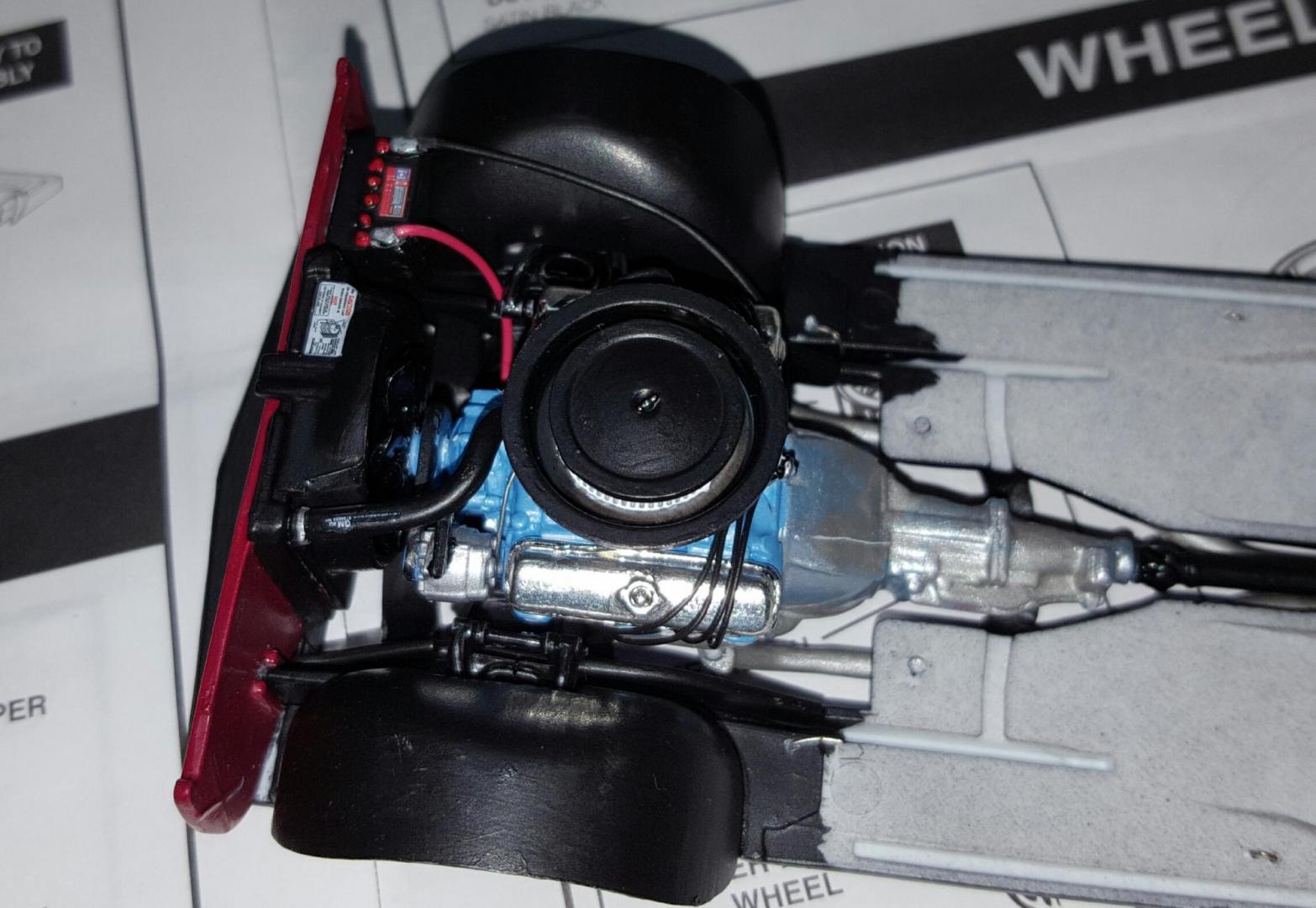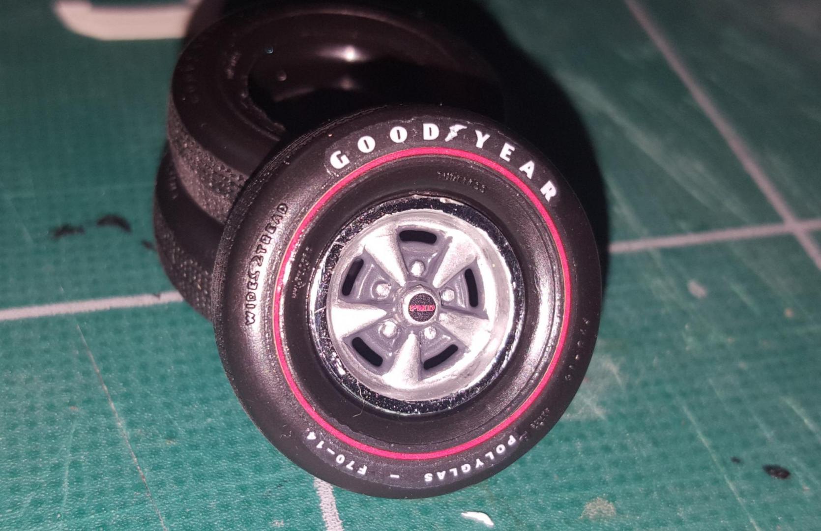 A few small details added to the engine - Fuel line, PCV tube, repainted fan the correct color (even though it's supposed to be a 5-blade fan...oh well lol) I also started to detail the wheels/tires. The decals have not fully set yet with the Micro-Sol but they actually look ok. I wasn't sure about em and a bit of a pain to get that redline even. I will still be touching up the rims too. Not sure about keeping the chrome edge. I've seen some with beauty rings and some without. Were they a factory option/item? That's it for now. Thanks for looking and for your comments!