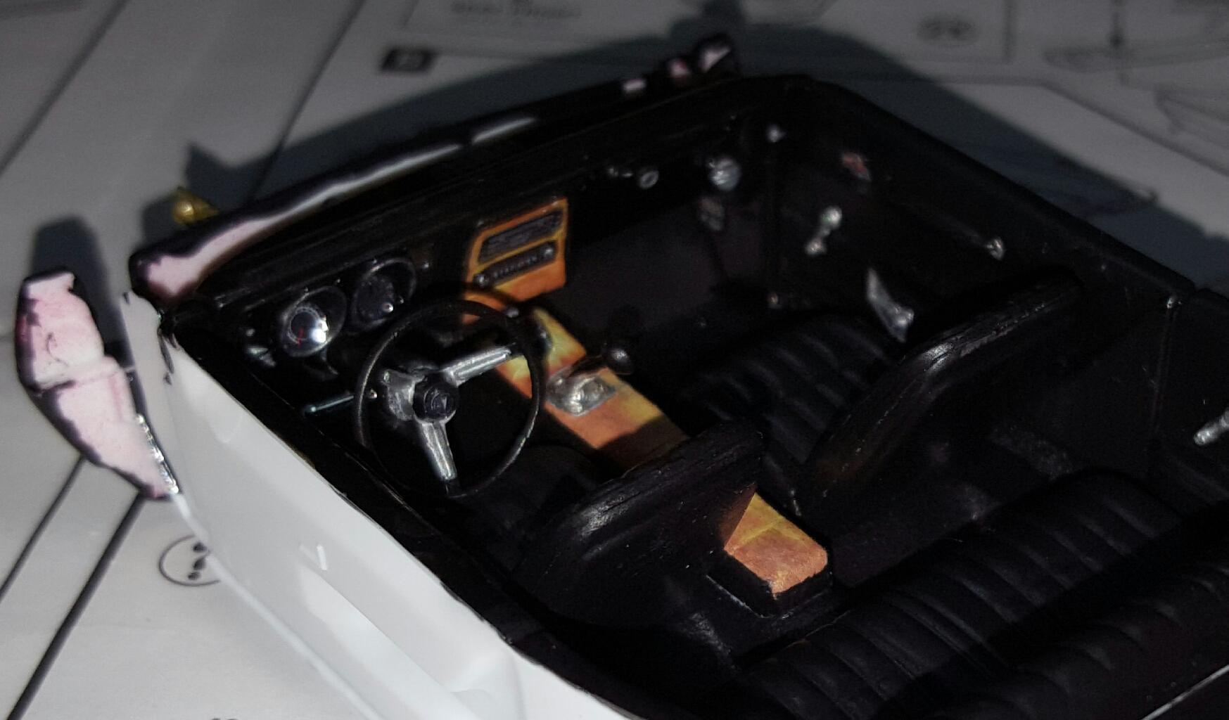 Finally a bit of time to play,,, Some progress while the body clear dries - I got the interior and chassis pretty much done. Added some basics like battery cables, master cyl lines, and my first attempt at basic brake lines on the chassis. The burlwood is just a picture printed out and glued on (looks better in person), but i chose to do a regular black steering wheel because I couldn't mach the paint to suit me. A wooden wheel was optional. I probably would choose the black one in a 1:1 anyway. Sorry for the poor interior pic quality. Also, some of these tiny little decals are a pain but they sure add to the realism! Never used to have these the last time I built a kit! Thanks for looking! Comments are welcome!