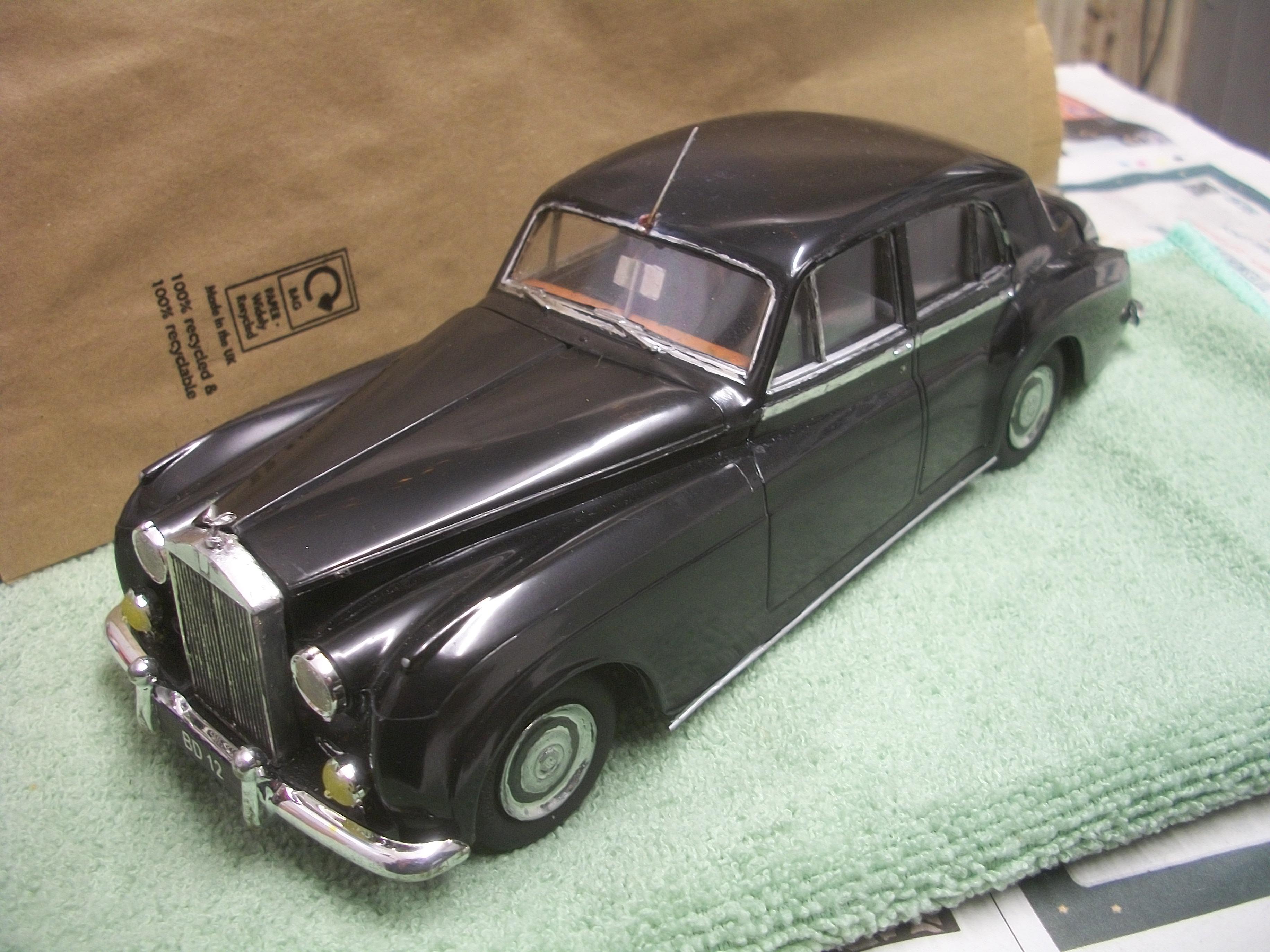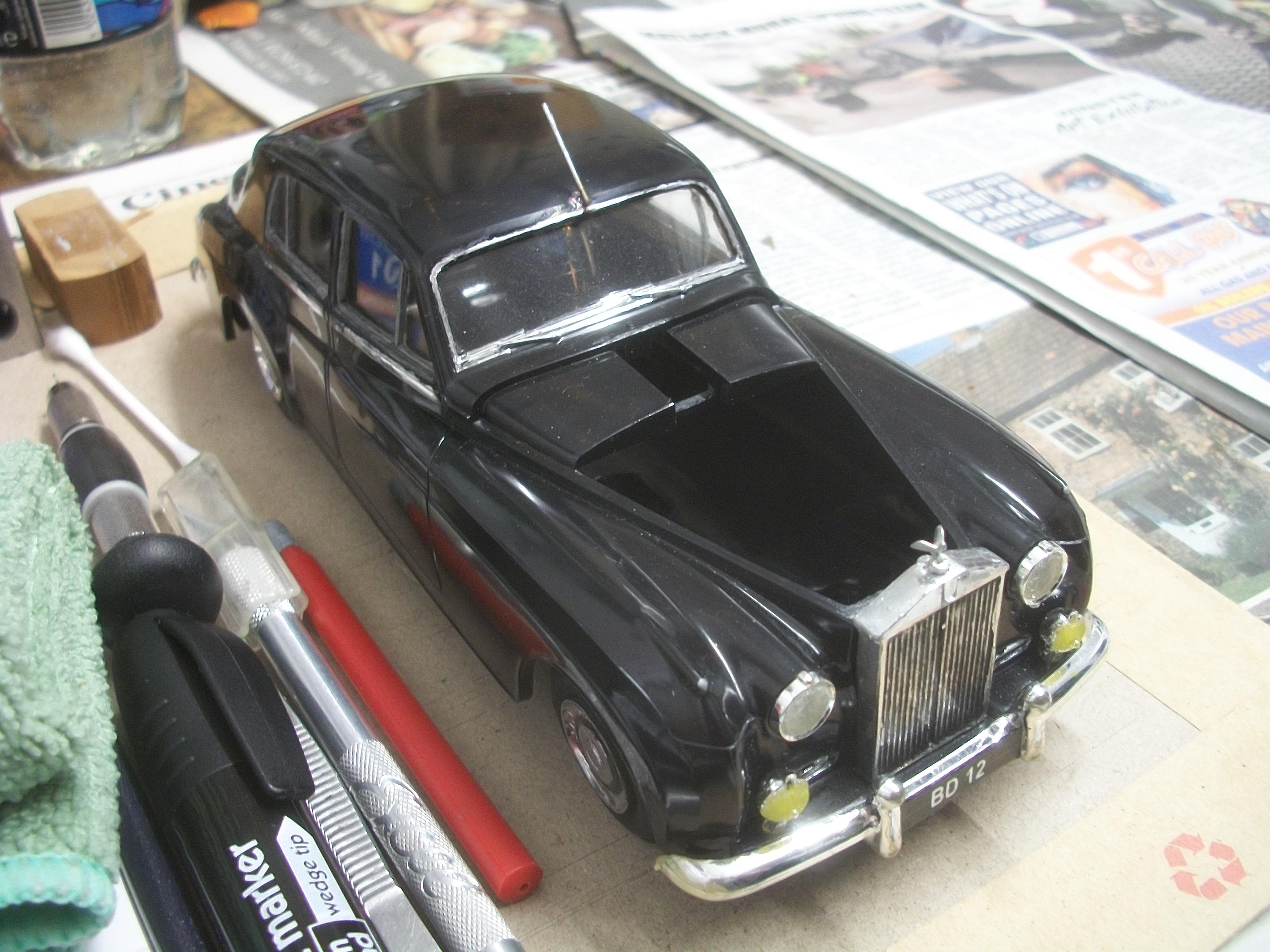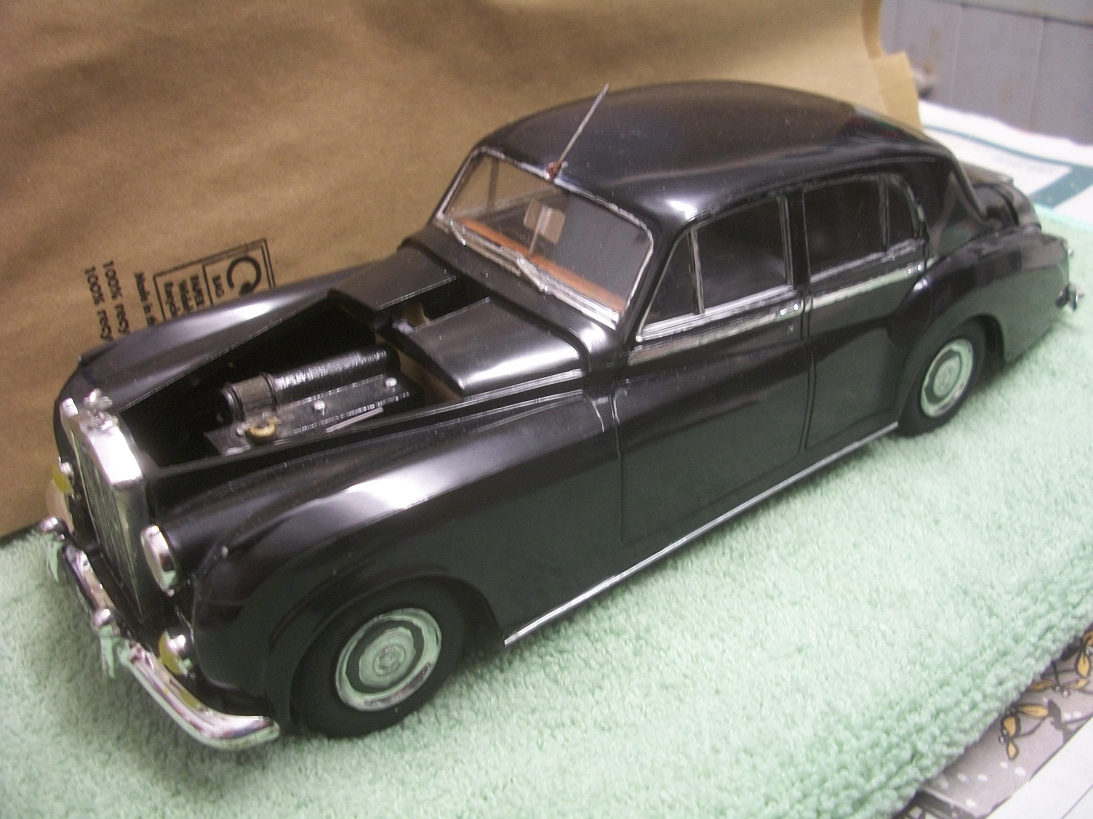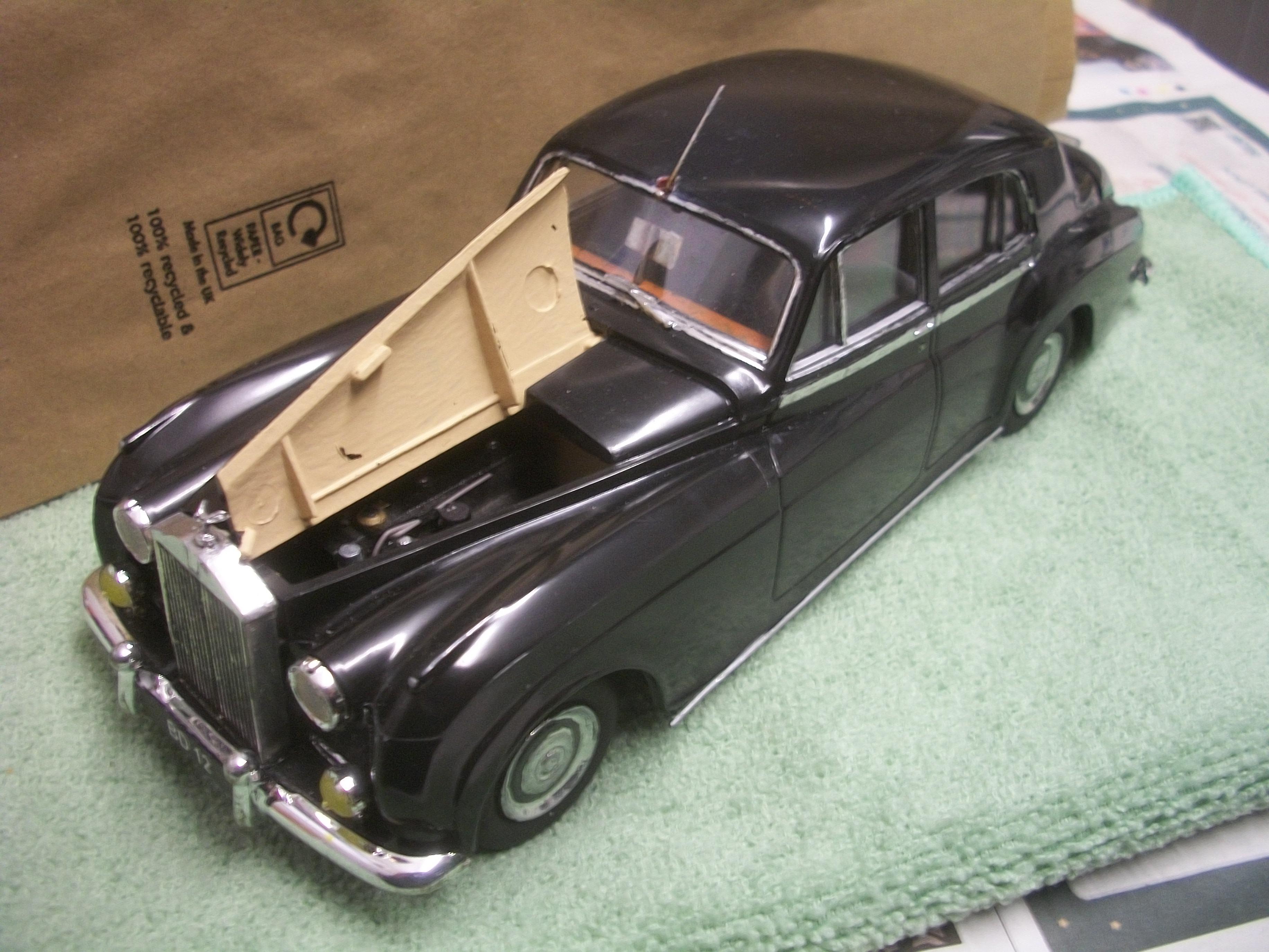 Well, partly due to my wife's trip to China, which involved an overnight stay in a hotel on the way to the airport and partly due to difficulties with the engine detailing, there has been a delay of around five days. During this time I didn't make any progress with the Silver Cloud . . . The engine detailing caused the build to stall, as I struggled to work it out in my head. I decided to step away from the engine detailing and instead it was the roof aerial that got some attention at last. First of all I polished the roof, because there is no way that I shall be attempting to polish the roof panel with the fragile roof aerial in place . . . Having cut a 17 mm length of steel pin for the roof aerial, my next task was to add a small lump of solder to one end of the pin. This was problematic, because there are two things that don't work for me in model building. one being super glue and the other being soldering. Eventually I did manage to attach a blob of solder to the end of the pin, which promptly fell off during the process of fitting the aerial to the roof. One tiny dot of super glue was placed onto the centre of the roof where it meets the windshield, and I carefully positioned the radio aerial at the desired angle, as well as keeping it at 90° vertically . . . Holding the pin there for what seemed like ages, the super glue just would not grip. After I could hold the piece no longer, the job was done. Both the roof aerial and the Spirit of Ecstasy mascot are the most fragile parts of this model car, without a doubt. They are extremely prone to breaking off later. David -