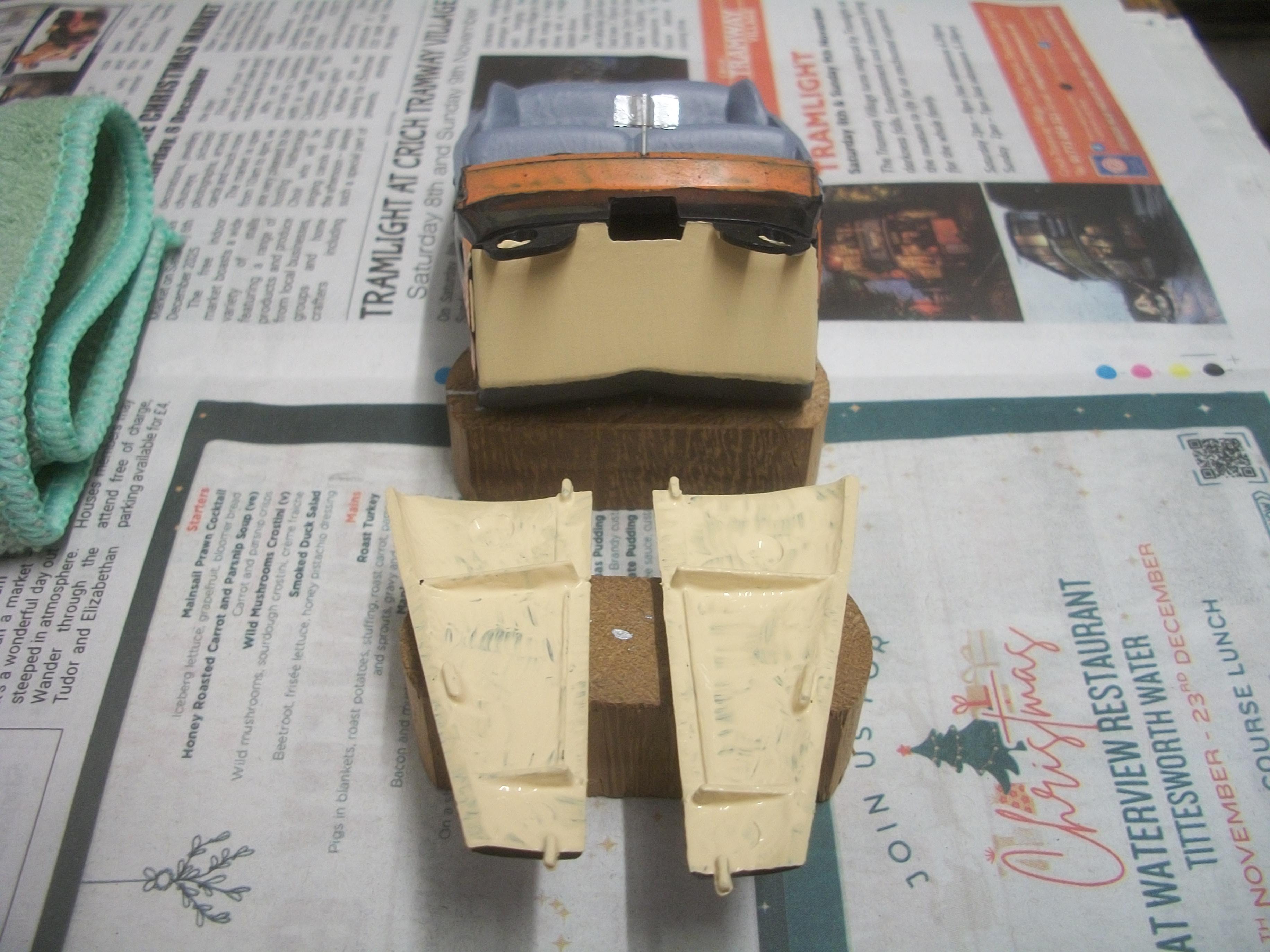 The engine bay bulkhead, or firewall, has been given a coat of pale yellow emulsion to represent the Rolls-Royce beige colour. Meanwhile at the rear of the car, several components have been PVA glued in place. These include the two rear light clusters, also the reverse lamp and the number plate plinth. For the rear bumper I used double sided tape to hold it in position. David -