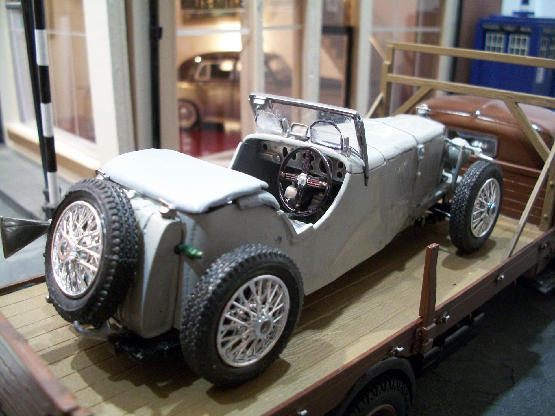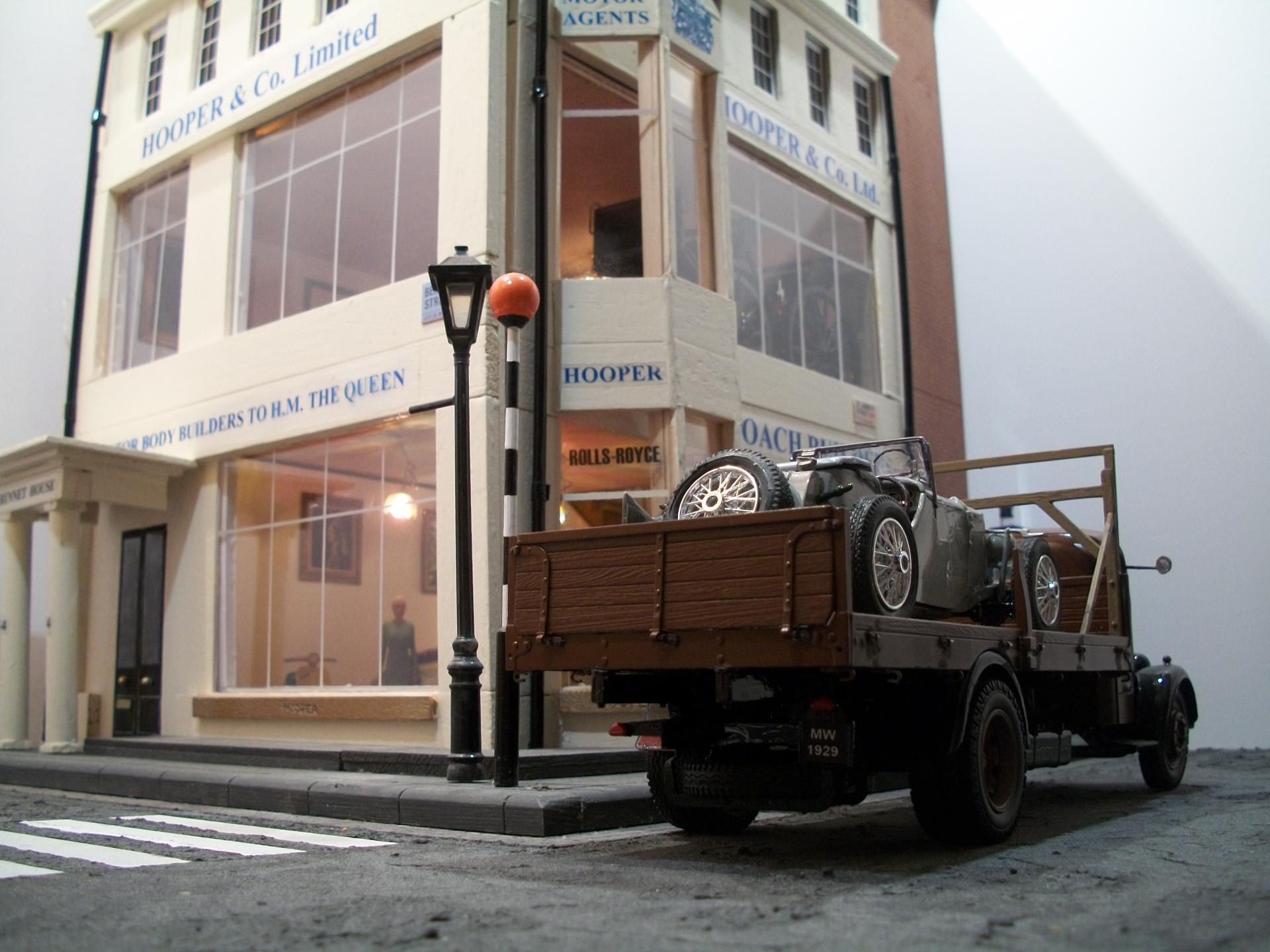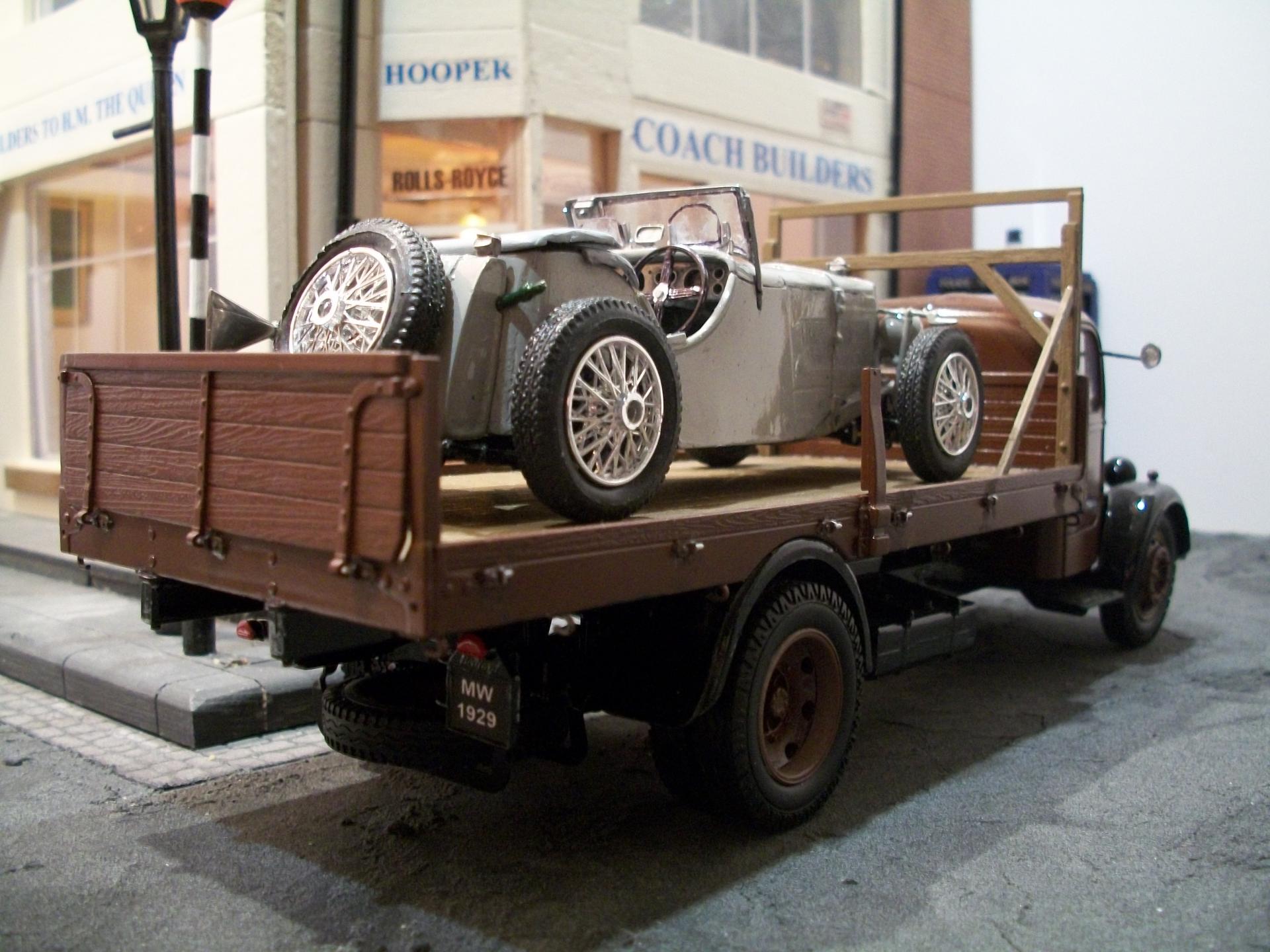 This is a 1933 MG K3 Magnette sports racing motor car being brought to Hooper & Co on the back of a Bedford lorry, to be displayed in their ground floor showroom, in recognition of past success in numerous motor sport events during the early 1930's. The 1:24 scale white metal model car has been assembled and painted from the kit by Wills Finecast Auto Kits and this particular kit is at least 46 years old, possibly older. There is some further work to be carried out on the MG so the car will be taken to Hooper's nearby Acton factory where skilled motor engineers will complete the work to a high standard. David