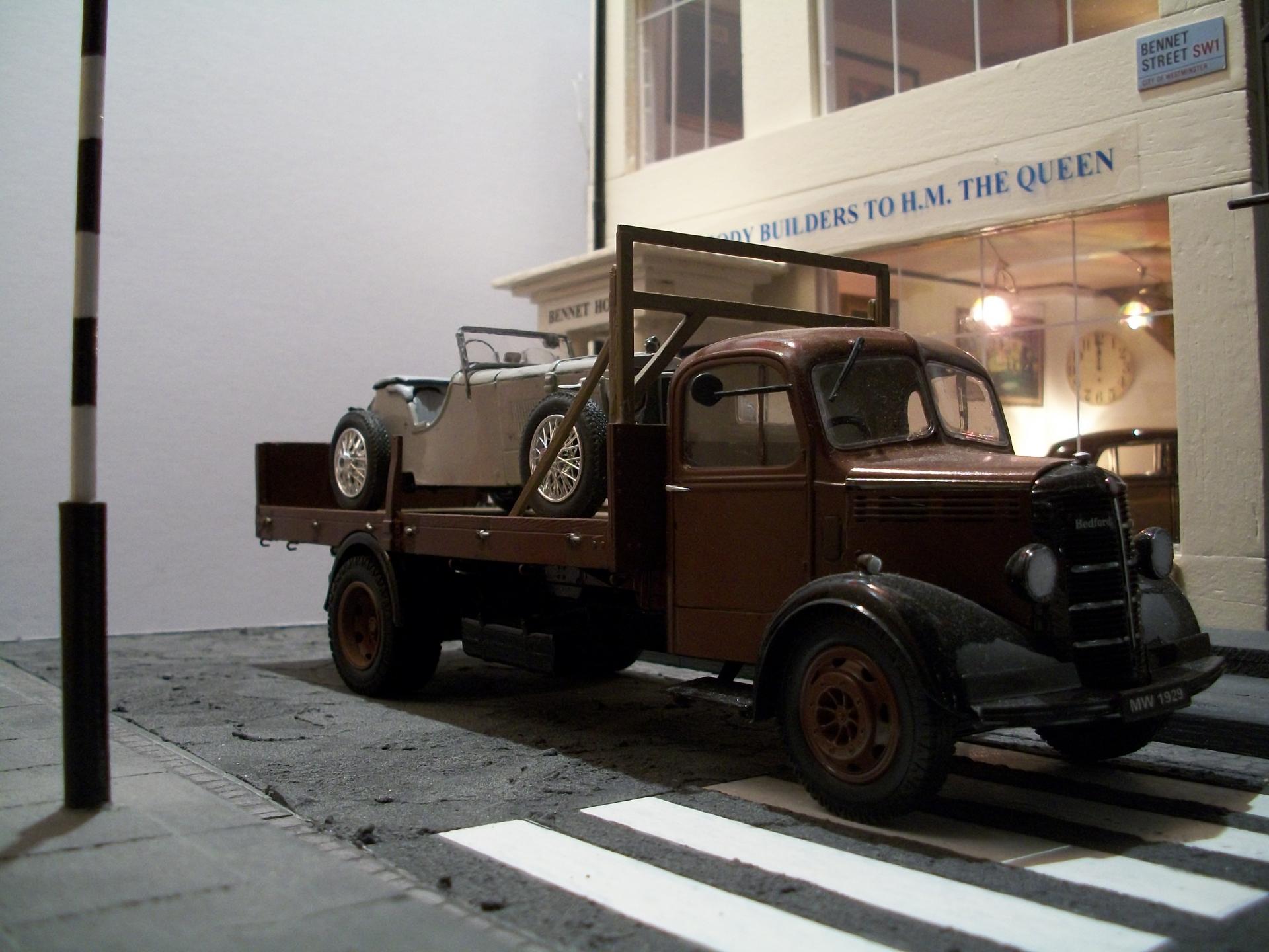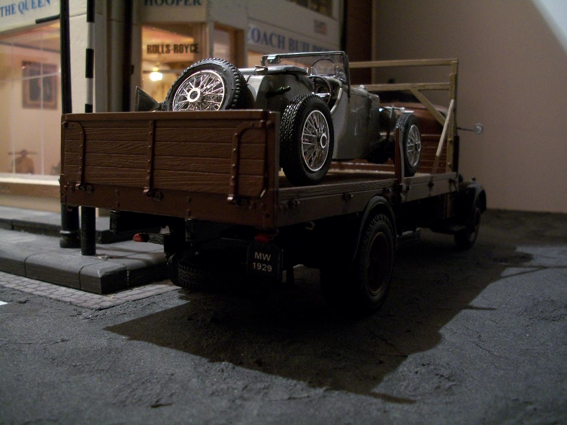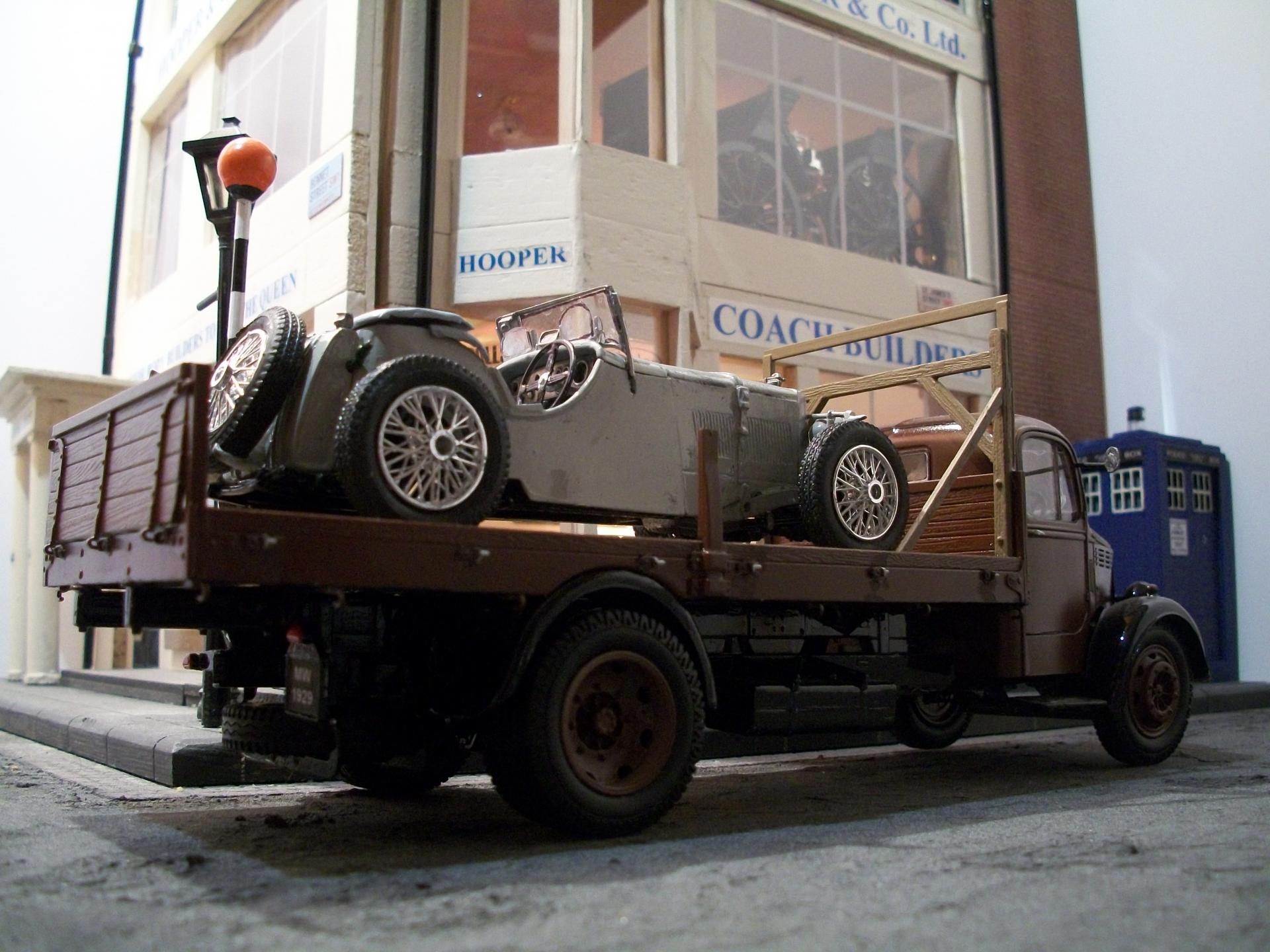This is a 1933 MG K3 Magnette sports racing motor car being brought to Hooper & Co on the back of a Bedford lorry, to be displayed in their ground floor showroom, in recognition of past success in numerous motor sport events during the early 1930's. The 1:24 scale white metal model car has been assembled and painted from the kit by Wills Finecast Auto Kits and this particular kit is at least 46 years old, possibly older. There is some further work to be carried out on the MG so the car will be taken to Hooper's nearby Acton factory where skilled motor engineers will complete the work to a high standard. David