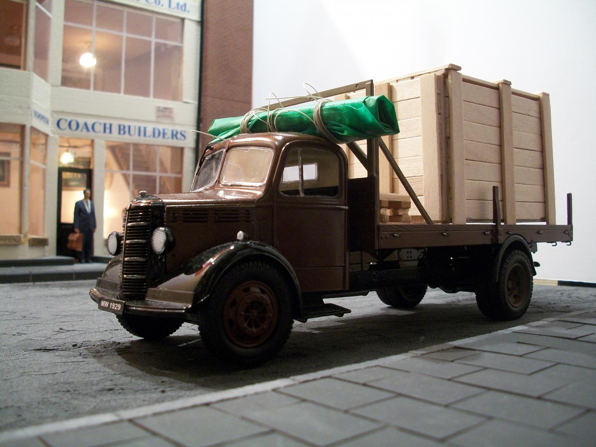 Here is the 1953 Bedford OLBD dropside lorry, which is now completed, and I have scratch built a green tarpaulin, a wooden pallet and some ropes to go with the vehicle. These photos show only the initial stages of setting up the idea to see if it works, so the roping and sheeting is not correct yet, and the really interesting photography will come along later when the Bedford gets to the diorama setting. PC Dixon is having a quiet word with the Mr Watson, the lorry driver about his dubious roping and sheeting, and the Police constable is not happy with the insecure load. Furthermore, he is equally concerned about the kettle and the bricks, not to mention the ladder. The tarpaulin is green garden refuse sack material in PVC, with Sap Green acrylic paint applied with a dry toothbrush. The pallet is constructed from balsa wood and the ropes are 1:24 scale rigging for model ships. The rope size is correct at 0.5 mm to represent 1/24th of 12 mm rope in full size. David