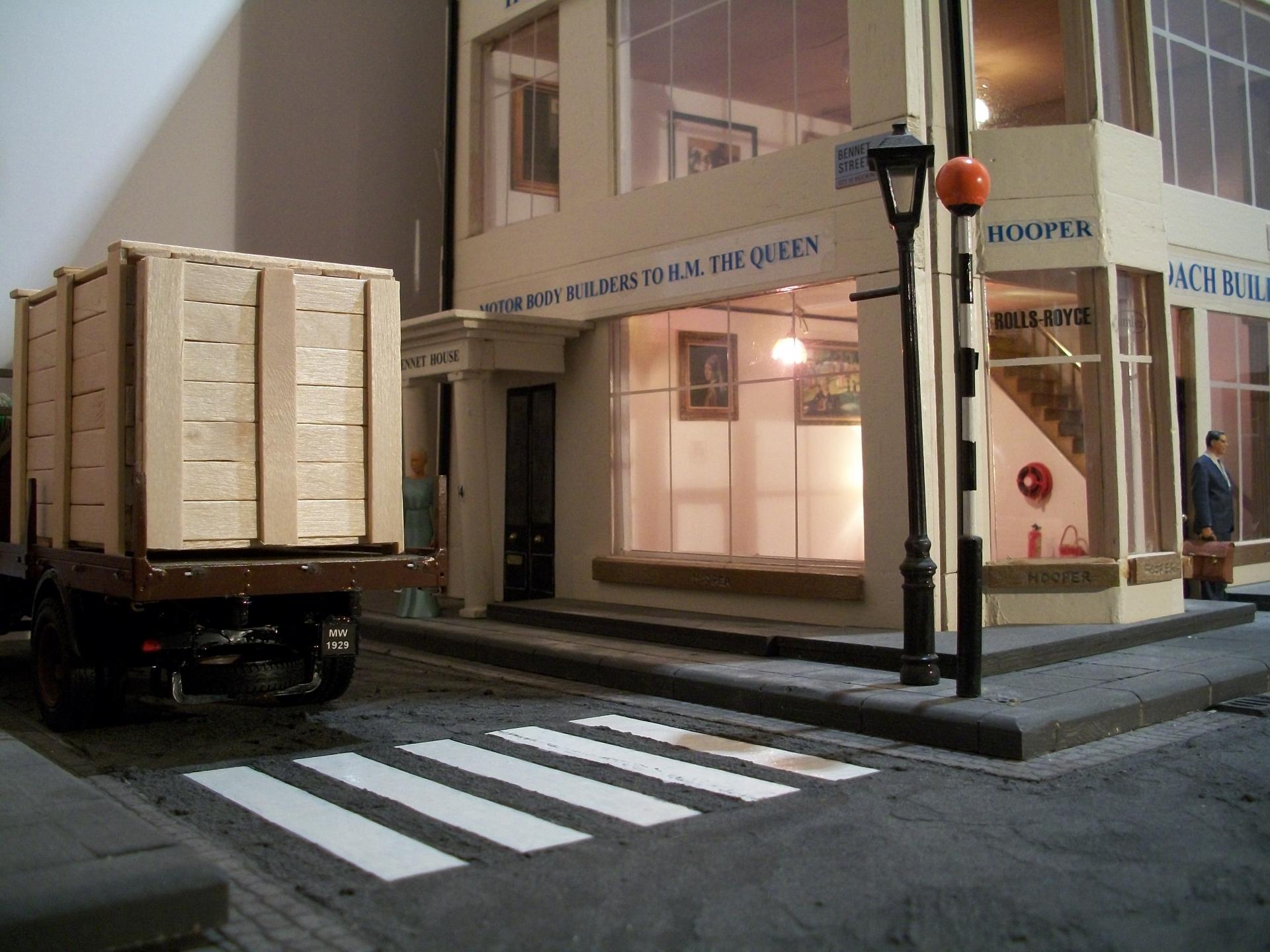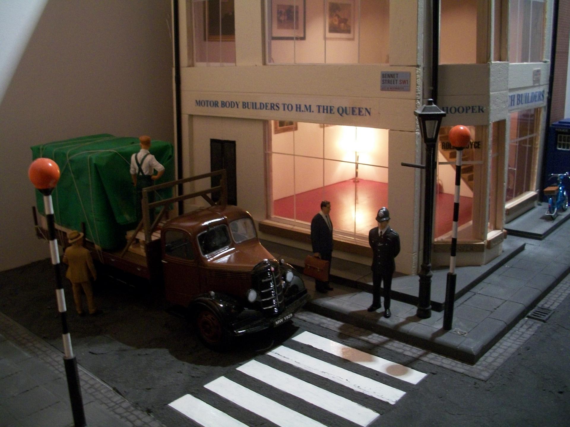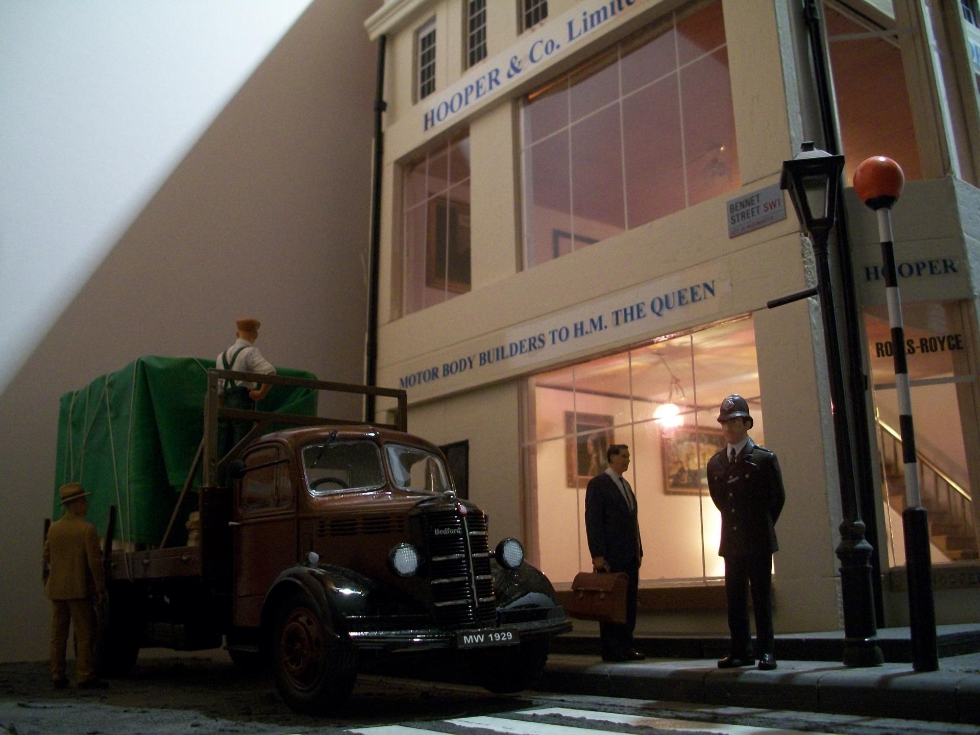 I can see that you and I are probably on the same wavelength JC, and thanks for the complimentary comments. Each time I put together a scene, I find myself looking at the setting afterwards and asking myself these questions..... what is going on? What are the people in the scene doing there? What could possibly be about to happen? This fits in with your theory of ' safe escape ' because it is almost as though I am withdrawing into a 1:24 scale world and walking around the streets outside the Hooper & Co building, where it allows me to think from the perspective of a 3" tall 1:24 scale man. Hopefully, this process should help put together the whole collection of vehicles, buildings, street furniture, lighting and figures. I see the exhibition diorama as the big container, in which there are smaller containers that are like mini dioramas, and these can be moved around and changed on a regular basis. There might be the lorry unloading or loading materials, or a fuel tanker selling cheap fuel from jerry cans, or a chauffeur taking out the luggage for the owner of a Rolls-Royce motor car, or perhaps several people queueing at a bus stop...... a Police constable standing near to the Police public call box, a lady or a gentleman with a motor scooter or a bicycle..... these are all ordinary everyday things that are going on when you look around a typical city environment on a daily basis. I have studied the work of Michael Paul Smith, who has sadly passed away very recently, and his work certainly inspired me to start this project. There are obvious differences between Michael's work and mine, such as there are no people in Elgin Park.... no figures at all, also he used diecast Danbury Mint model cars whereas I tend to use plastic kits that I have built myself, mixed in with a few diecast Franklin Mint and Danbury Mint models where appropriate. Michael set up his small table outdoors and he was a master of the forced perspective technique, as well as using his brilliantly constructed scale buildings indoors and outdoors. My diorama is always indoors, so I make use of 100 watt daylight bulbs, as well as both black and white and colour photography. Some of the photographic scenes have been captured from within the showrooms of the Hooper building. David