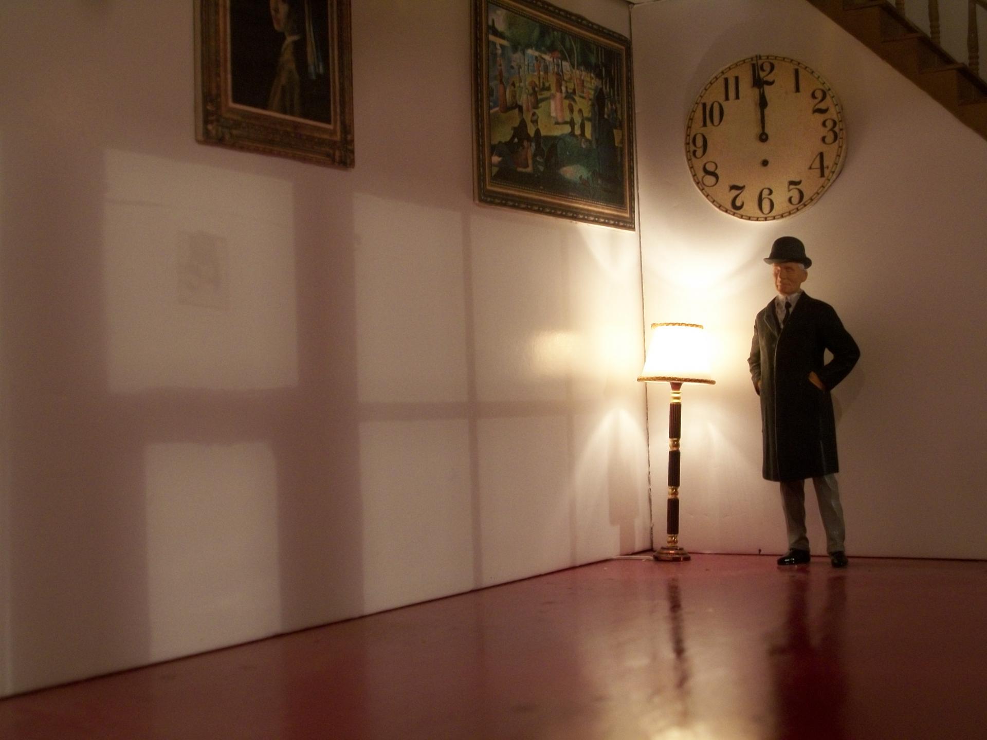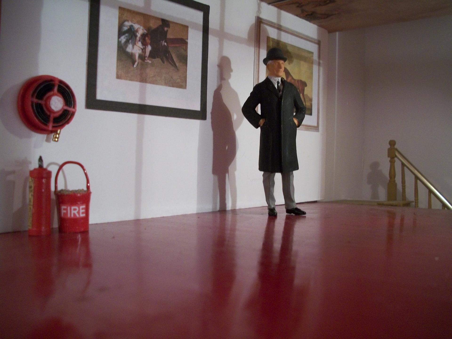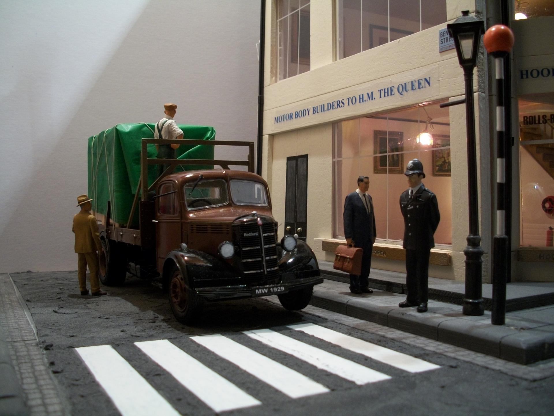 I can see that you and I are probably on the same wavelength JC, and thanks for the complimentary comments. Each time I put together a scene, I find myself looking at the setting afterwards and asking myself these questions..... what is going on? What are the people in the scene doing there? What could possibly be about to happen? This fits in with your theory of ' safe escape ' because it is almost as though I am withdrawing into a 1:24 scale world and walking around the streets outside the Hooper & Co building, where it allows me to think from the perspective of a 3" tall 1:24 scale man. Hopefully, this process should help put together the whole collection of vehicles, buildings, street furniture, lighting and figures. I see the exhibition diorama as the big container, in which there are smaller containers that are like mini dioramas, and these can be moved around and changed on a regular basis. There might be the lorry unloading or loading materials, or a fuel tanker selling cheap fuel from jerry cans, or a chauffeur taking out the luggage for the owner of a Rolls-Royce motor car, or perhaps several people queueing at a bus stop...... a Police constable standing near to the Police public call box, a lady or a gentleman with a motor scooter or a bicycle..... these are all ordinary everyday things that are going on when you look around a typical city environment on a daily basis. I have studied the work of Michael Paul Smith, who has sadly passed away very recently, and his work certainly inspired me to start this project. There are obvious differences between Michael's work and mine, such as there are no people in Elgin Park.... no figures at all, also he used diecast Danbury Mint model cars whereas I tend to use plastic kits that I have built myself, mixed in with a few diecast Franklin Mint and Danbury Mint models where appropriate. Michael set up his small table outdoors and he was a master of the forced perspective technique, as well as using his brilliantly constructed scale buildings indoors and outdoors. My diorama is always indoors, so I make use of 100 watt daylight bulbs, as well as both black and white and colour photography. Some of the photographic scenes have been captured from within the showrooms of the Hooper building. David