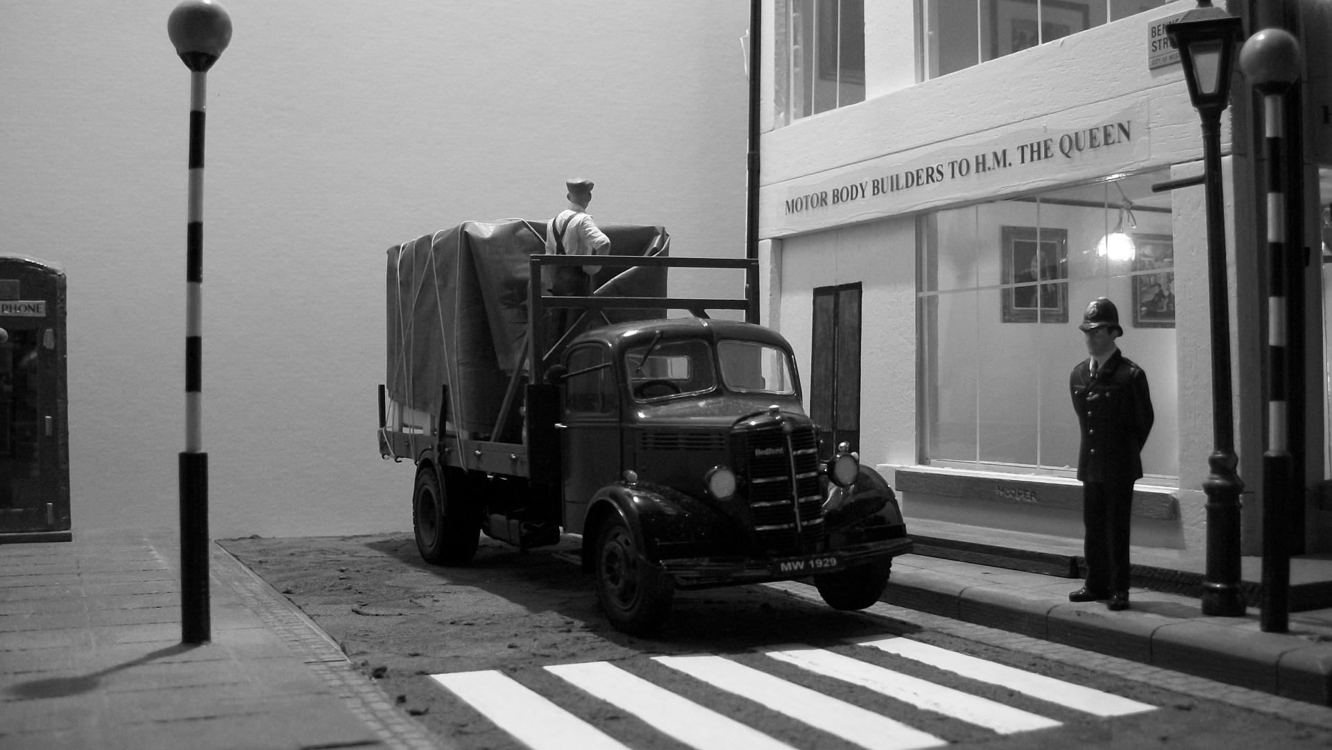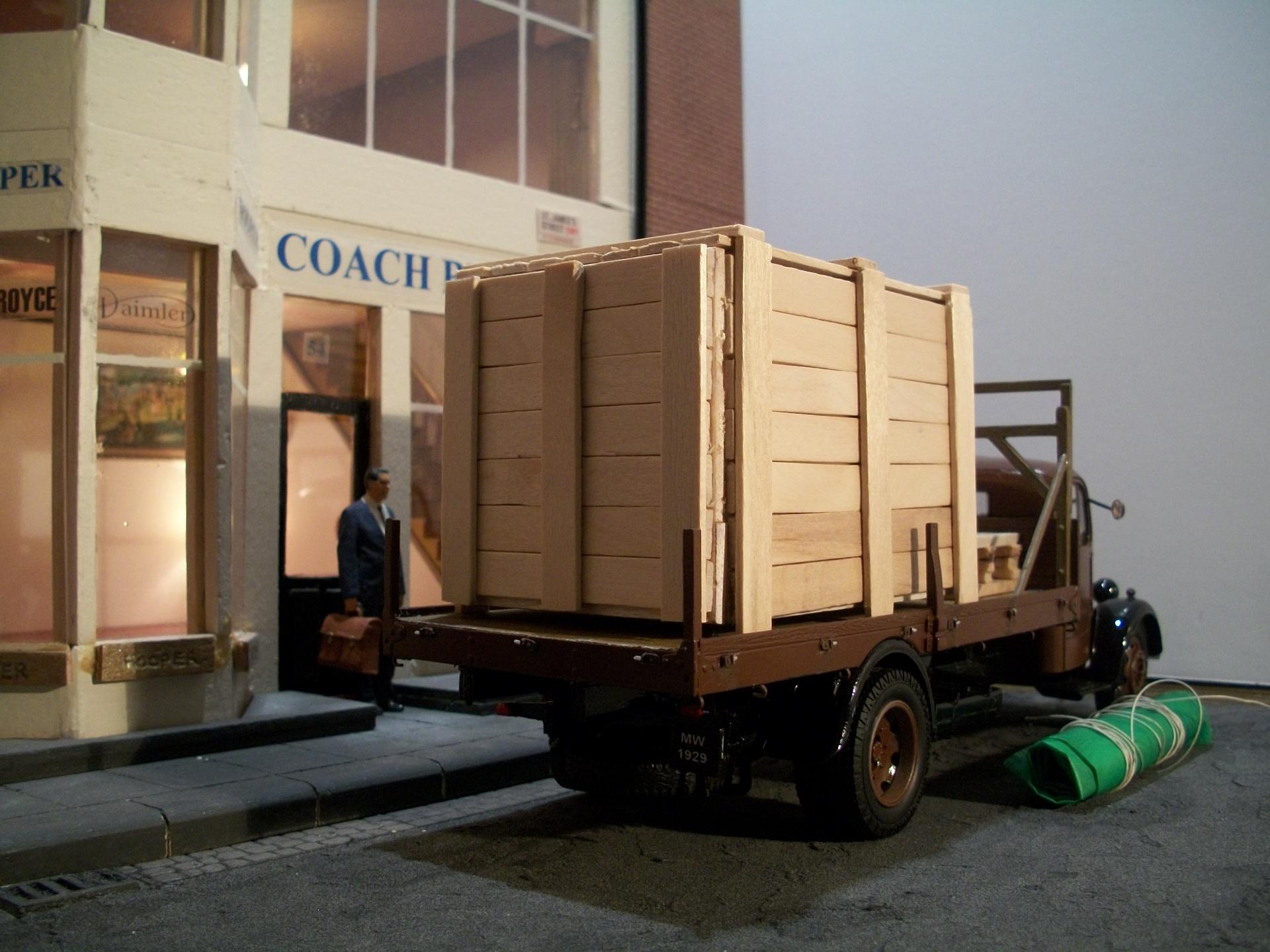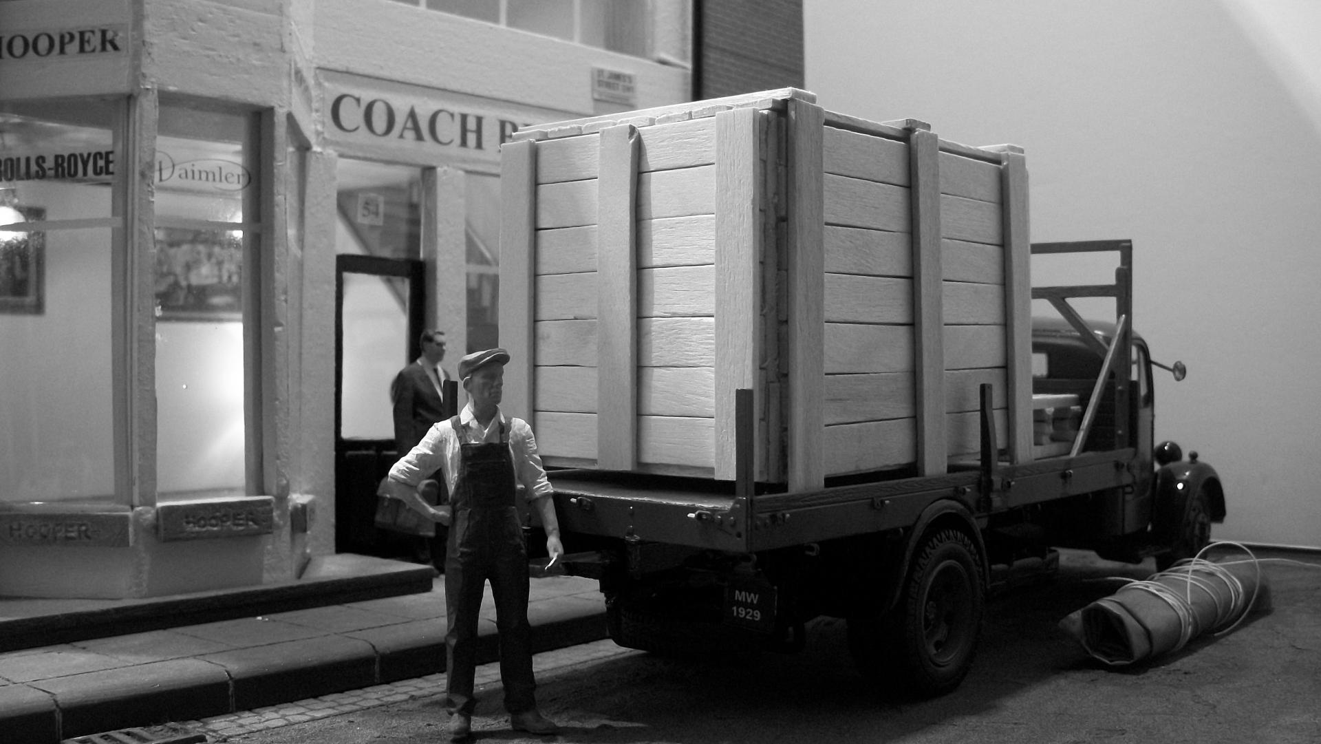 The large wooden crate has been loaded onto the Bedford OLBD dropside lorry, which has been covered with a green tarpaulin and secured with hessian rope. We see the driver of the lorry getting ready to leave the premises of Hooper & Co with his important load.... the contents of the crate are unknown to us. As you would expect, the managing director of Hoopers is keeping a watchful eye over proceedings. This is probably very early in the morning and well before the rush hour traffic builds up on St James's Street. The haulage firm has been instructed to proceed without further delay with this valuable cargo..... bound for a far off destination..... many miles from London. David