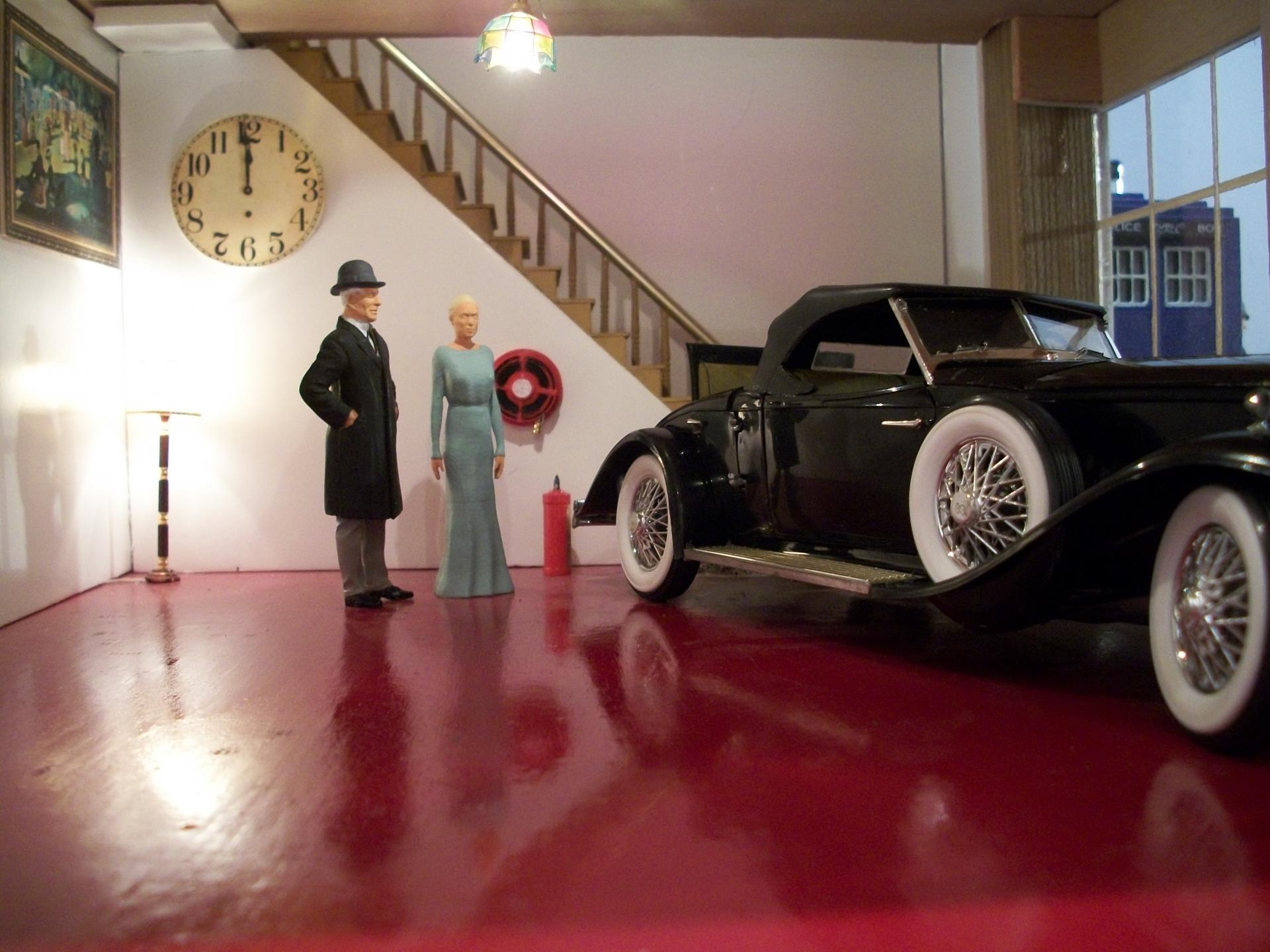 JC..... from the first of your two photos I can see how this is going to work, and of course camera angle, camera height and lighting are critical here. When taking photographs within my diorama I set up the camera on three wooden blocks, which corresponds to a height of 3 inches and this gives eye level view as seen by a 3" tall 1:24 scale figure. Also, I previously tried using LED lighting, but this produced a strong blueish hue in the resulting photos. Now I have dolls house lighting which is much nicer, and produces a soft warm glow somewhat like vintage lighting. The LED's produce no heat, whereas the dolls house lighting bulbs do get warm inside a scale model building. Your second photo does show clearly how you need to arrange your models to achieve the desired effect. I am sure this can be done, and you obviously know what you're doing. Following your thinking, I might try out some ideas with different scale models in my settings. For example, I have a 1:16 scale Daimler-Benz carriage that is too large for the 1:24 diorama, but using your concept maybe I can have the carriage at some point in the background and make it work visually. David -