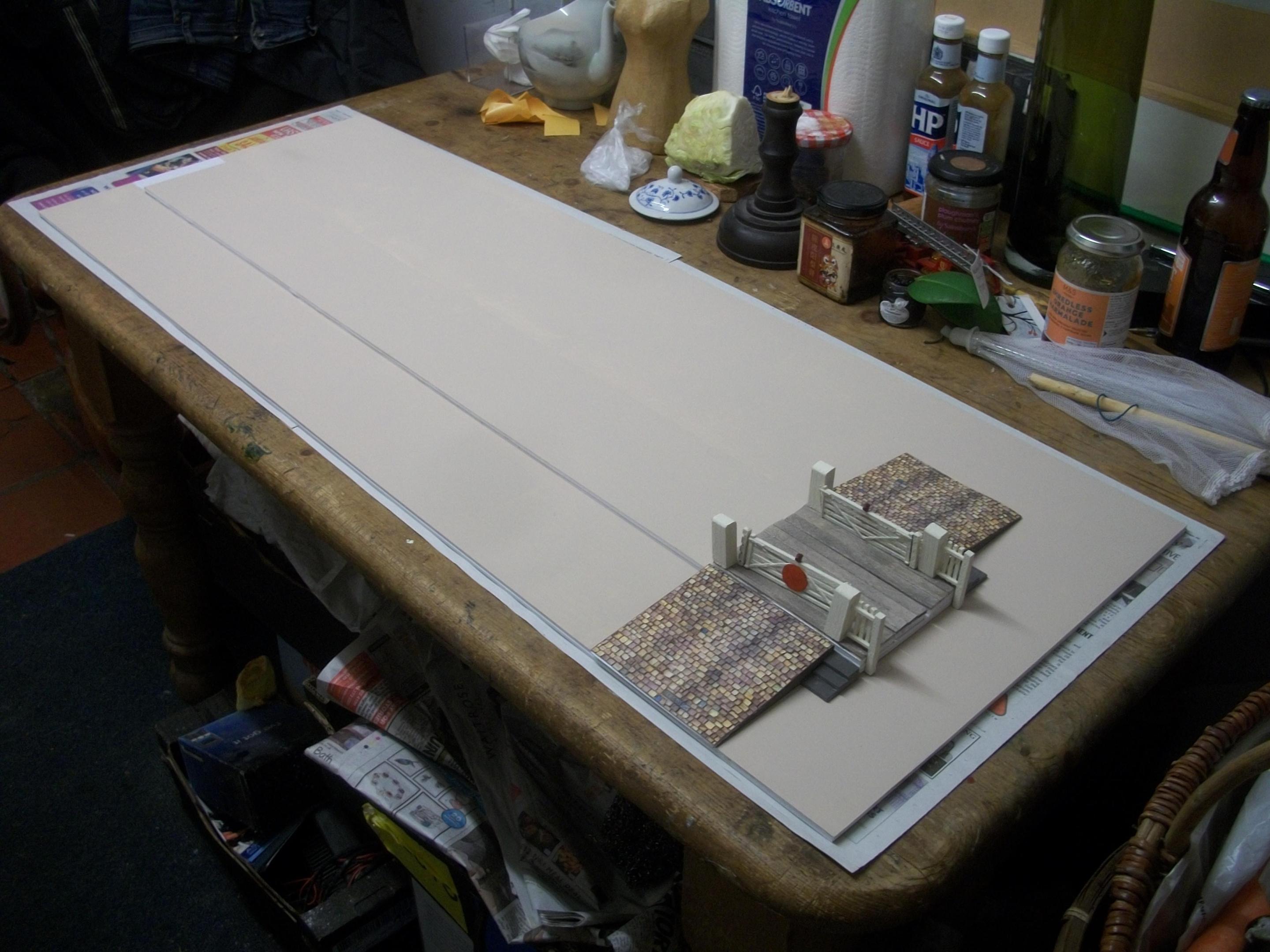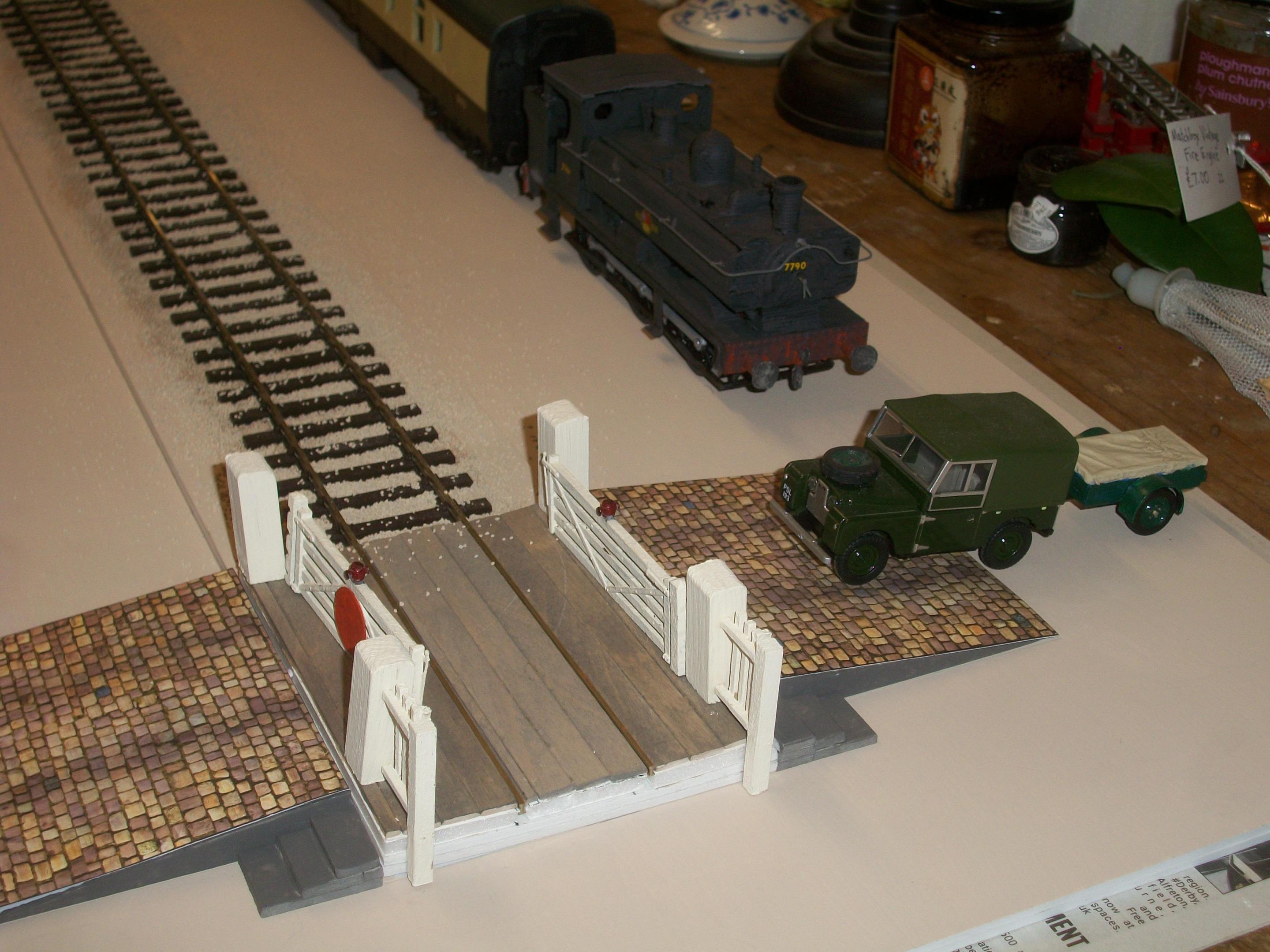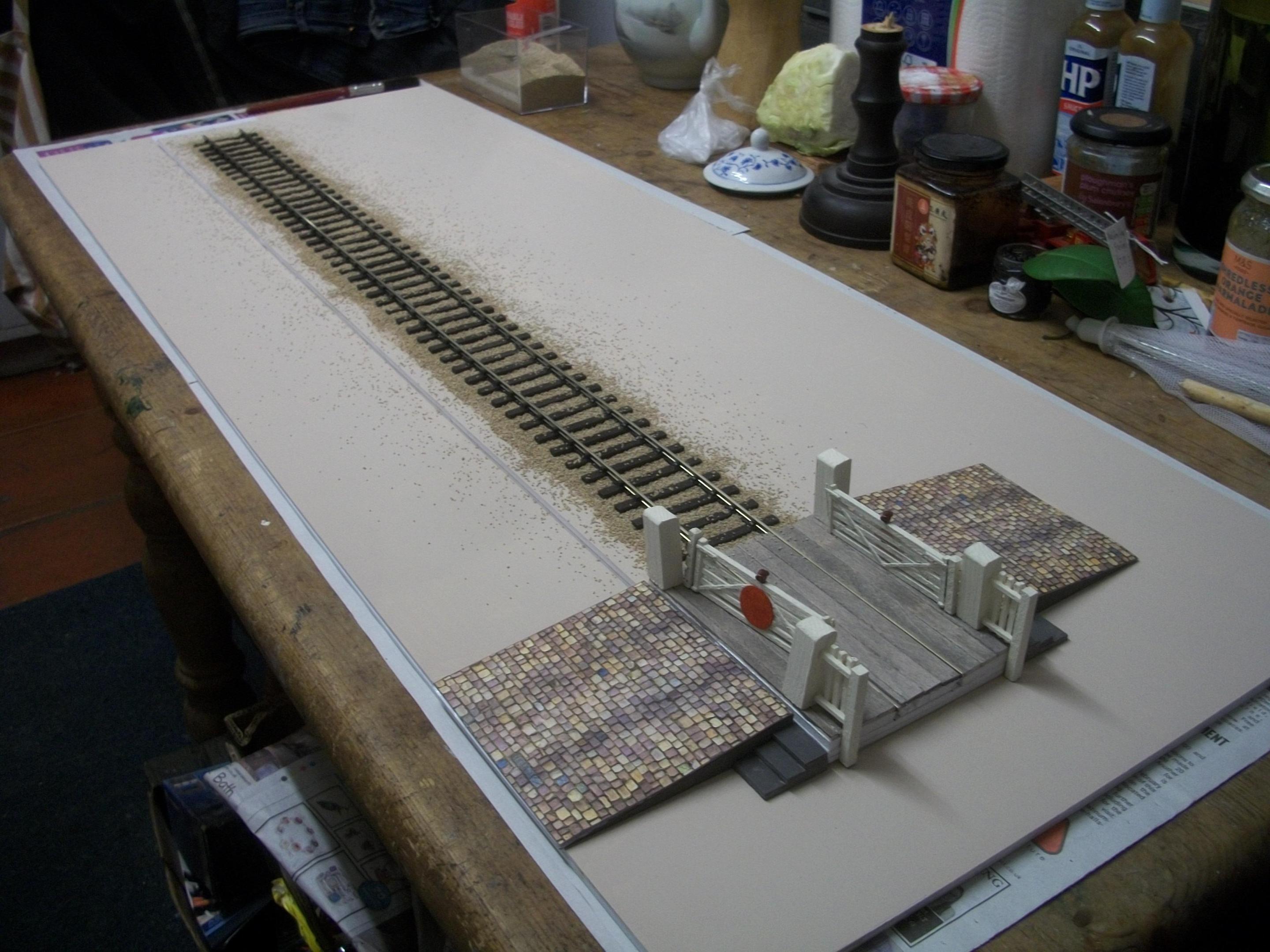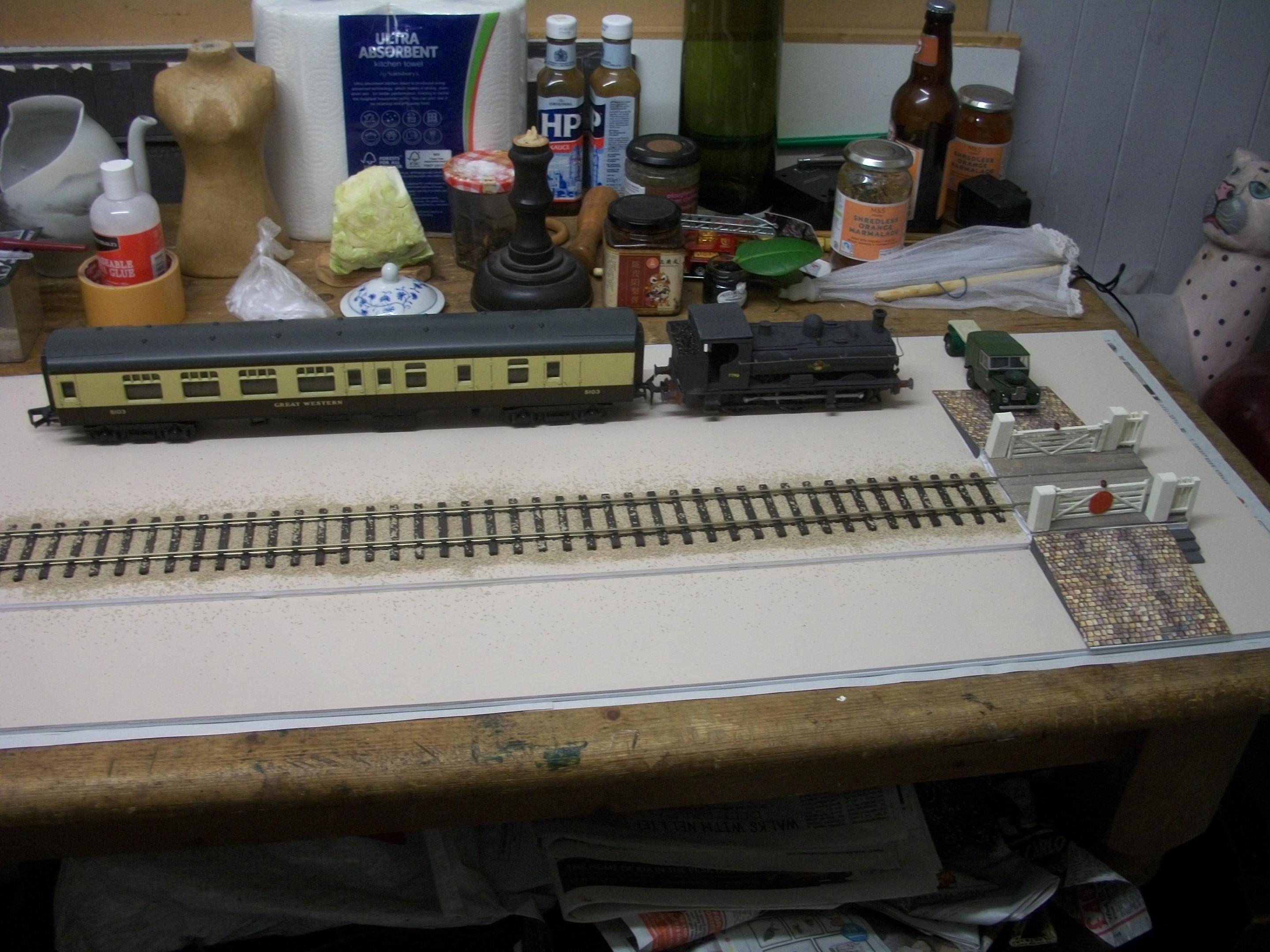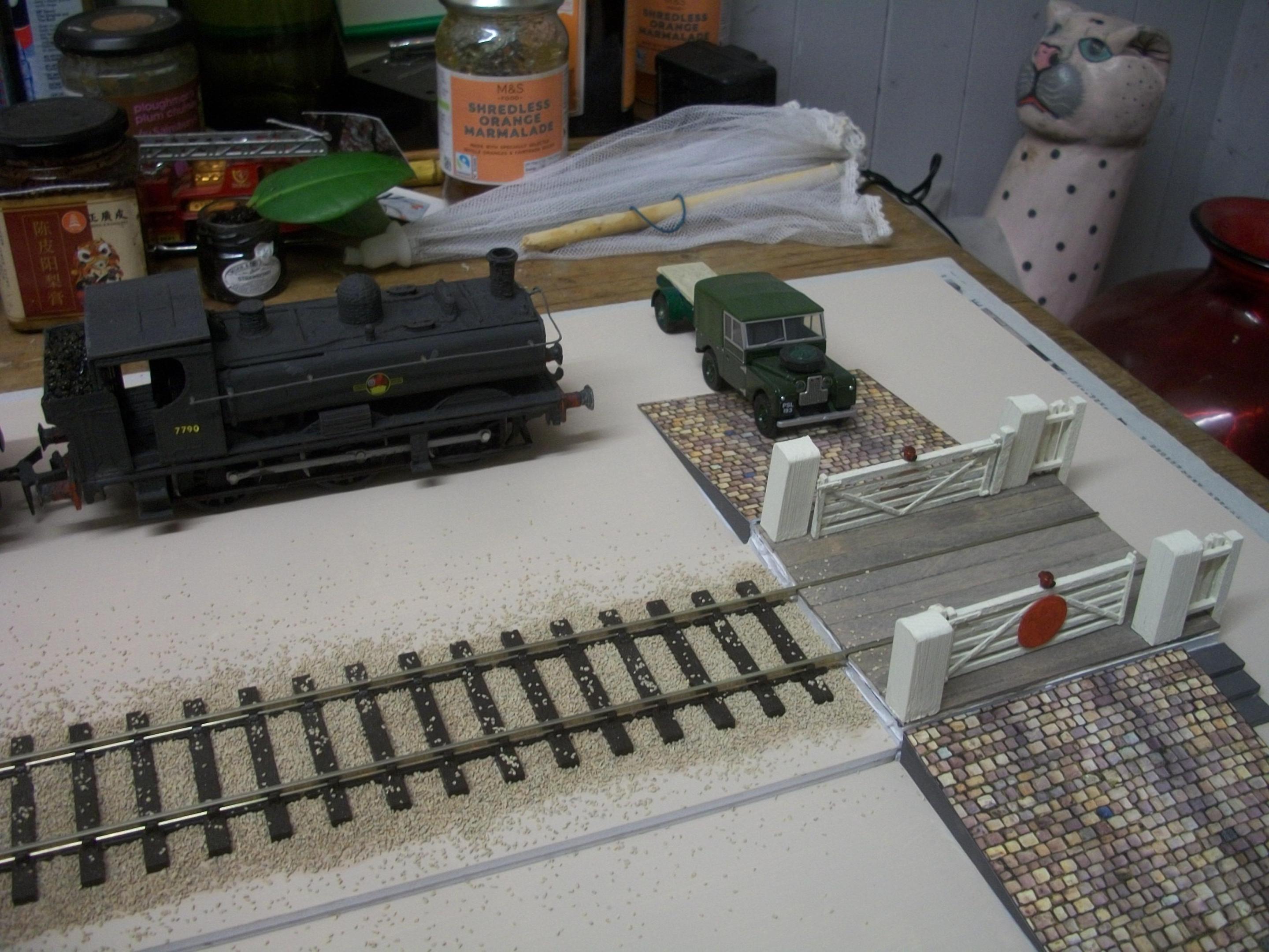 Several days work on the baseboard for the railway line have produced some good results. Two panels of 3 mm Foamex board have been attached together using double sided tape, so that the 6 mm baseboard mates up to the main baseboards of this Hooper & Co. factory diorama. Then a strip of 6 mm foamex board was mounted on top of the baseboard, also using double sided tape, both having been coated with Oatmeal colour emulsion. Once everything was carefully lined up, I applied a coating of PVA glue to the strip, onto which the length of Peco track was mounted, and the level crossing assembly was pushed up to the track rails. While the PVA glue was still wet, the Woodland Scenics Medium Buff Ballast was sprinkled along the length of track. This will be allowed to dry overnight, and the excess ballast can be brushed off later. Here are a few photos showing the progress so far . . . There is a 1:43 scale Series 1 Land Rover with a trailer that I had 3D printed some time ago, along with the O gauge Pannier Tank steam loco and the Lima Great Western passenger coach. David