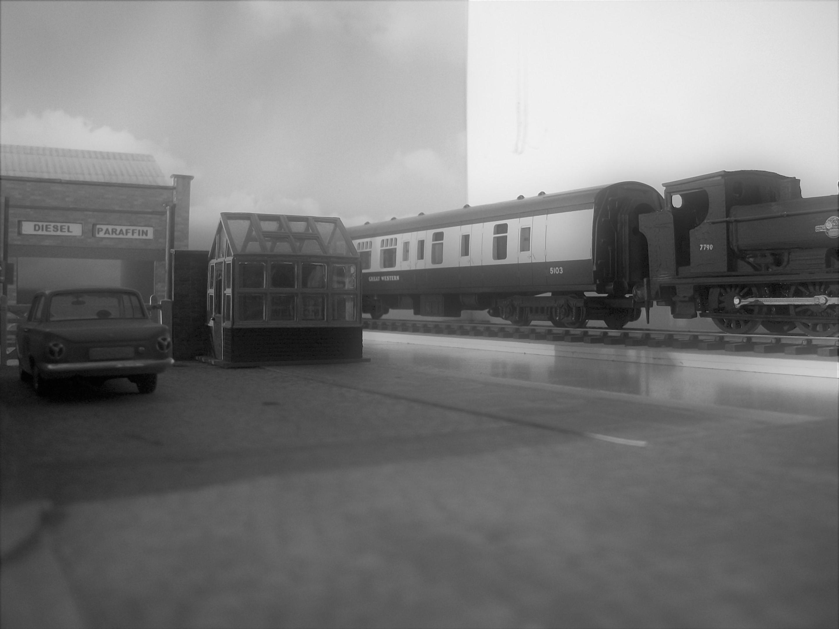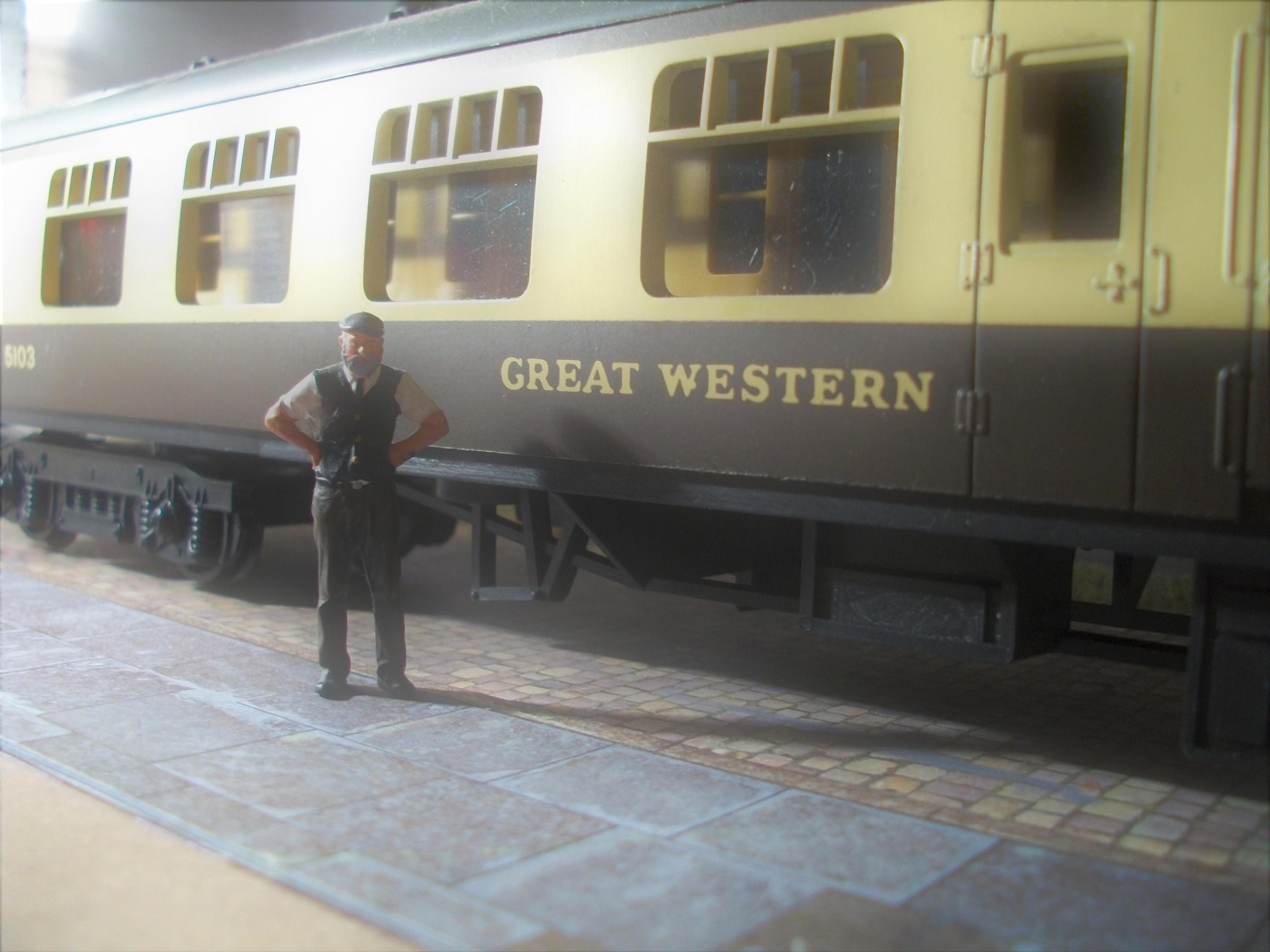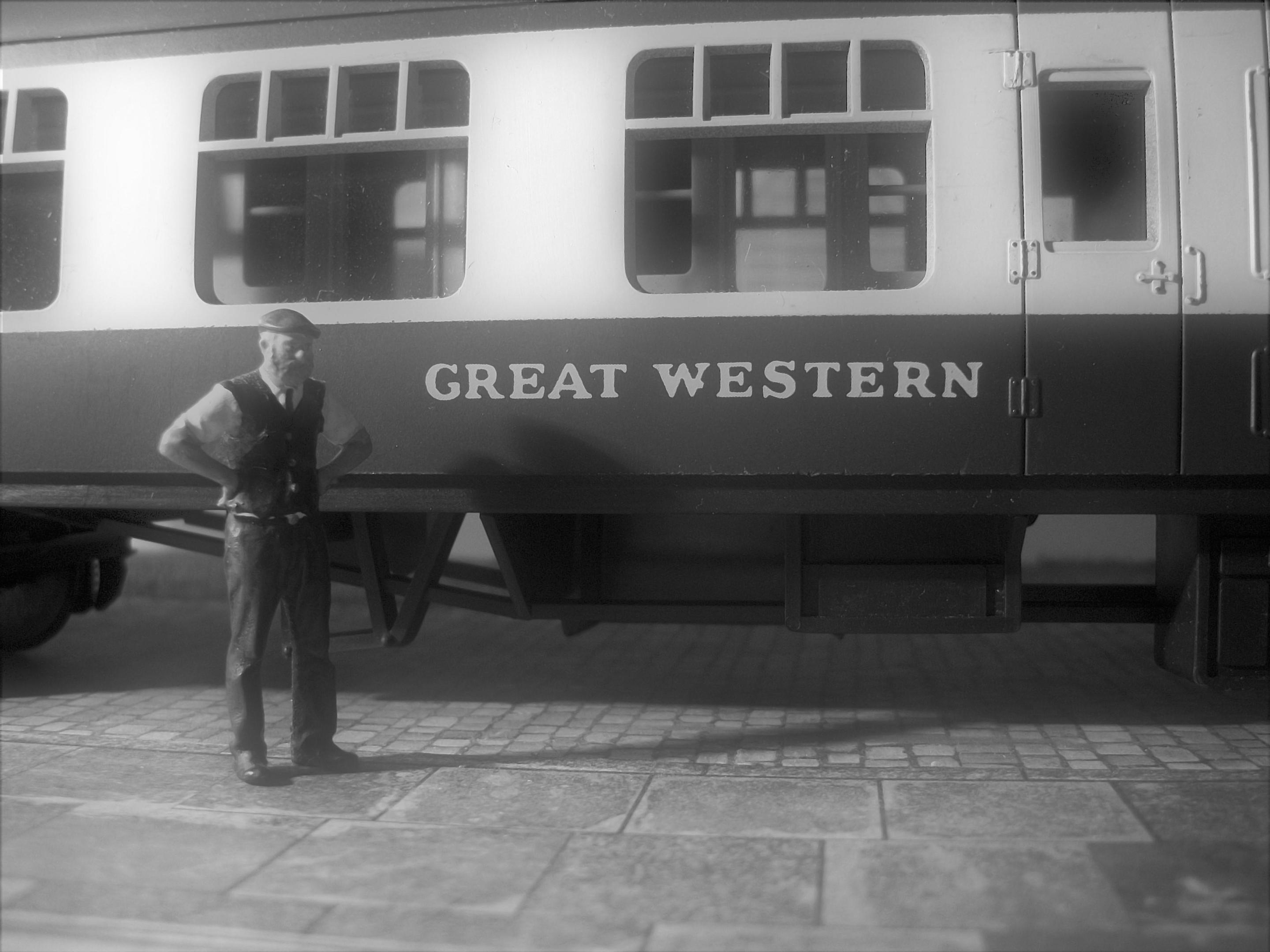 These two photographs show the elderly gentleman wearing his flat cap, and he is standing alongside the Great Western passenger coach . . . The O gauge / 1:43 scale steam locomotive is having some weathering work done, with dark rust using Humbrol Weathering Powder, and the railway line area of this diorama is receiving some further attention, in terms of painting and track ballast. David