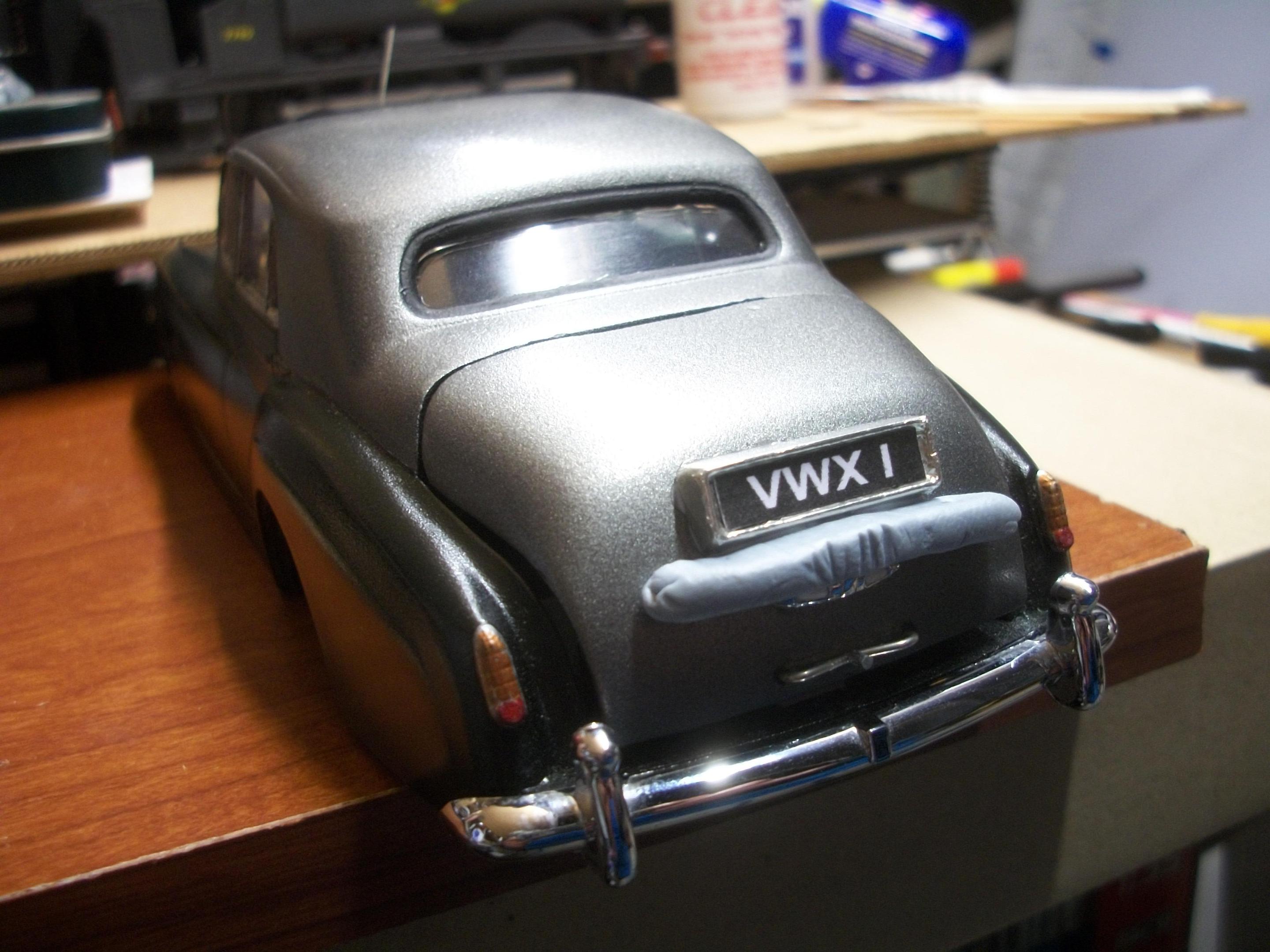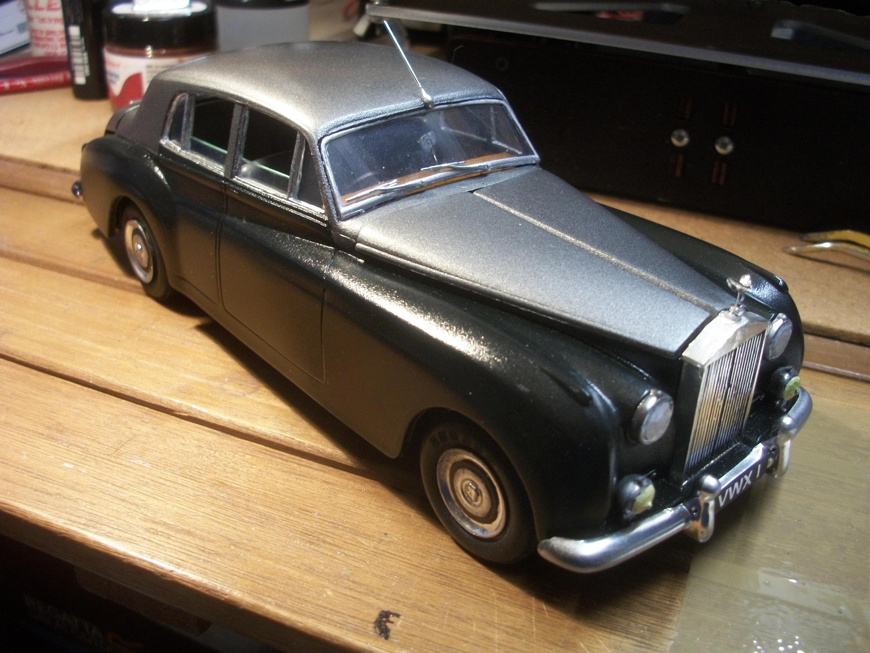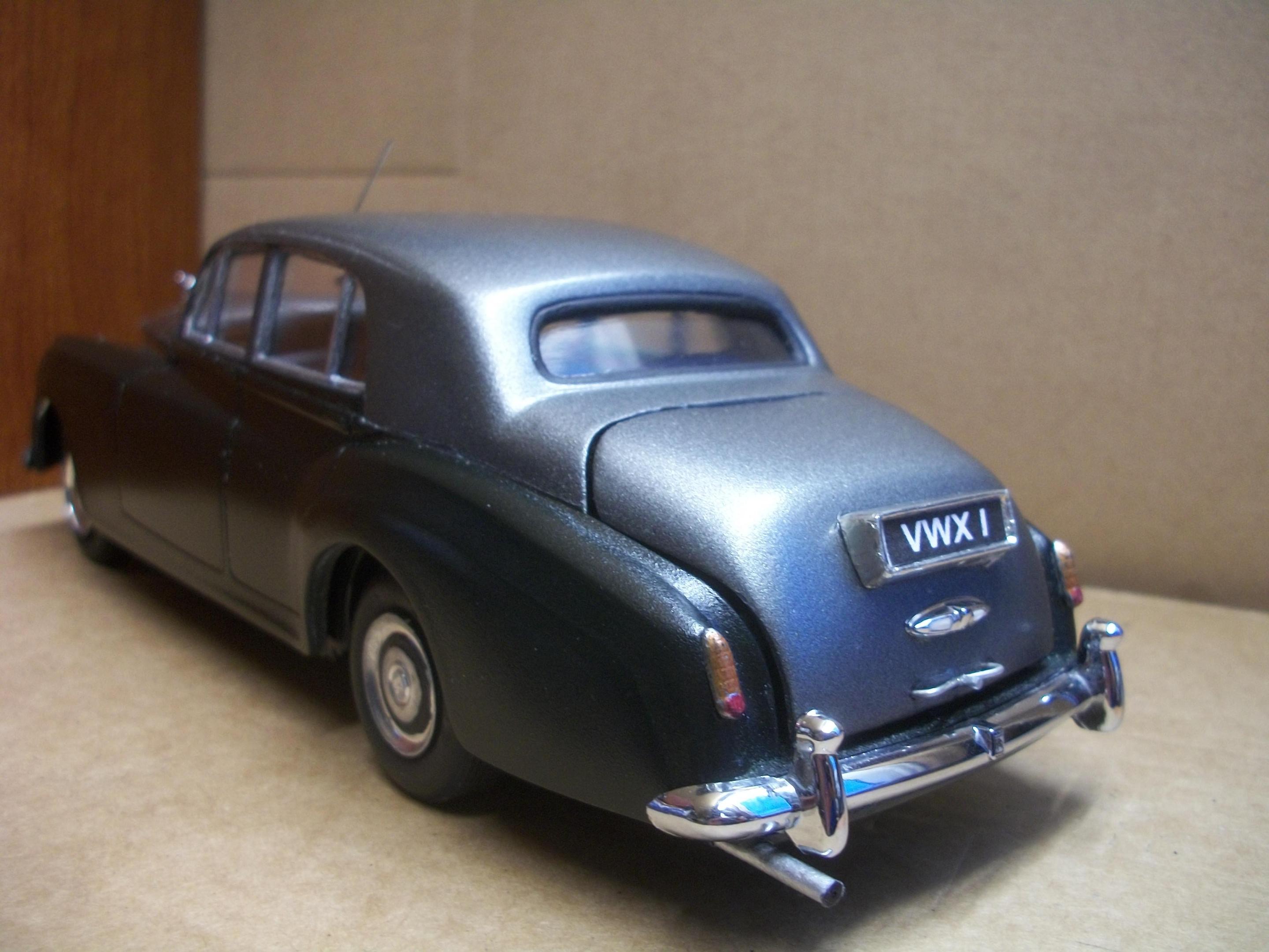 This is a 1958 Rolls-Royce Silver Cloud I in 1:24 scale . . . The model car is finished in Shell Grey over Velvet Green and is based on the Revell of Germany kit. As well as parts from the Revell kit, I have also used parts from the Minicraft kit of USA and parts from a Franklin Mint diecast model, also USA of course. The 6 cylinder engine and cooling radiator are from the diecast model, and so is the windscreen and rear bumper. The wiper arms and blades were taken from a Tamiya Jaguar MK 2 kit. Both the Shell Grey and Velvet Green are rattle can automotive cellulose paints, which have been applied over Plastikote Black Primer, and final polishing was done using Tamiya Polishing Compound, in grades coarse, fine and finish. The Shell Grey does appear to be light blue in natural daylight, and the Velvet Green appears to be black until sunlight brings out the rich green colour. Some of the chrome work is Bare Metal Foil, while some areas have been airbrushed with Molotow Liquid Chrome . . . Several parts have been scratch built, including the picnic tables on the rear of the front seats, also the boot lid number plate plinth and boot lid handle and locking barrel. It was necessary to convert the dashboard steering column arrangement from left-hand drive to right-hand drive. On the driver's side of the car, the front and rear side windows are in the lowered position to allow viewing of the interior detail, while over on the passenger side the side windows are in the raised position and closed. Front and rear axles are the steel components from the Minicraft kit, as opposed to the plastic axles from the Revell kit. The rubber tyres are from the Revell kit, which are better than the plastic tyres from the Minicraft kit, and the chassis is rolling free. Parts such as the roof aerial, boot lid plinth and handle, as well as the exhaust tailpipe have been added by myself, as these are not included in either the Revell or Minicraft kits. This model is 99.9% completed, apart from a few minor details such as interior vanity mirrors and sill mouldings to be added shortly. Altogether, the model has taken me 6 months to build, which is by far the longest of all my builds. Usually I would expect to complete a build within 2 months at the most. Even the 1:24 scale Revell London Bus which has almost 400 parts, was completed during 2 months, whereas the Revell / Minicraft Rolls-Royce kit has less than 30 parts in total. Most of the work has been to do with the painting and the polishing, and the chrome work was also time consuming. Here are just a few photos of the Silver Cloud, registration number VWX 1 . . . . As always, thanks for looking guys and happy model building ! David