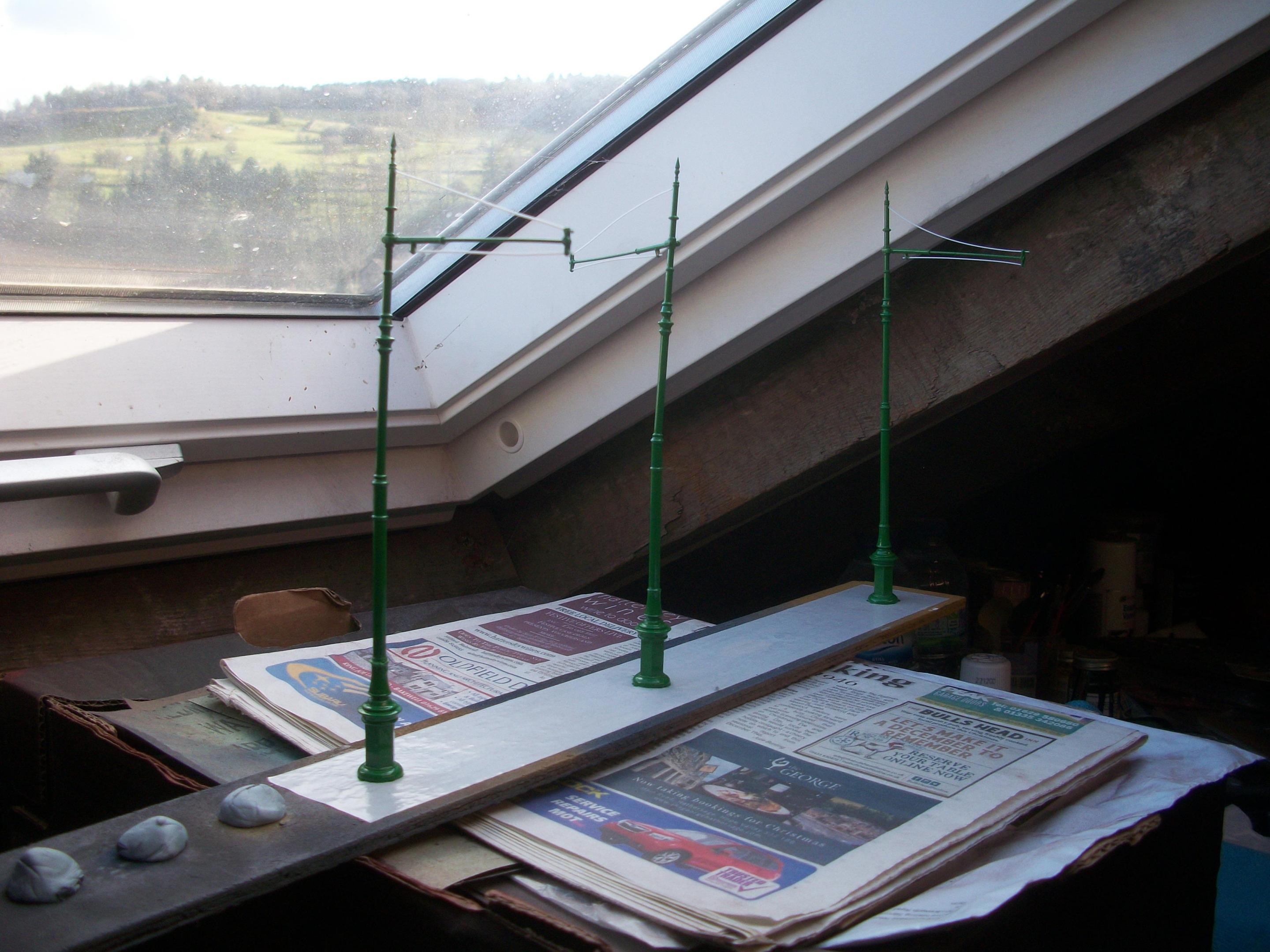 While allowing time for paint to dry on the tram line posts and the tram car itself, I have started painting the three figures. These include two seated lady passengers and the standing tram driver. I decided that the styrene parts of the upright posts and arms will not support the weight of the garden wire, and nor will the Evergreen styrene rod. What I shall do, is to use two lengths of Evergreen .025" styrene rod as the overhead tram wire. The ones in the packet are 14 inches in length, and the overall length I require is 24 inches. Now that I have assembled and painted three posts instead of only two, I can super glue two lengths of 12 inches of the Evergreen rod between the posts. There will be one post at each end of the tram lines, and one in the centre. David