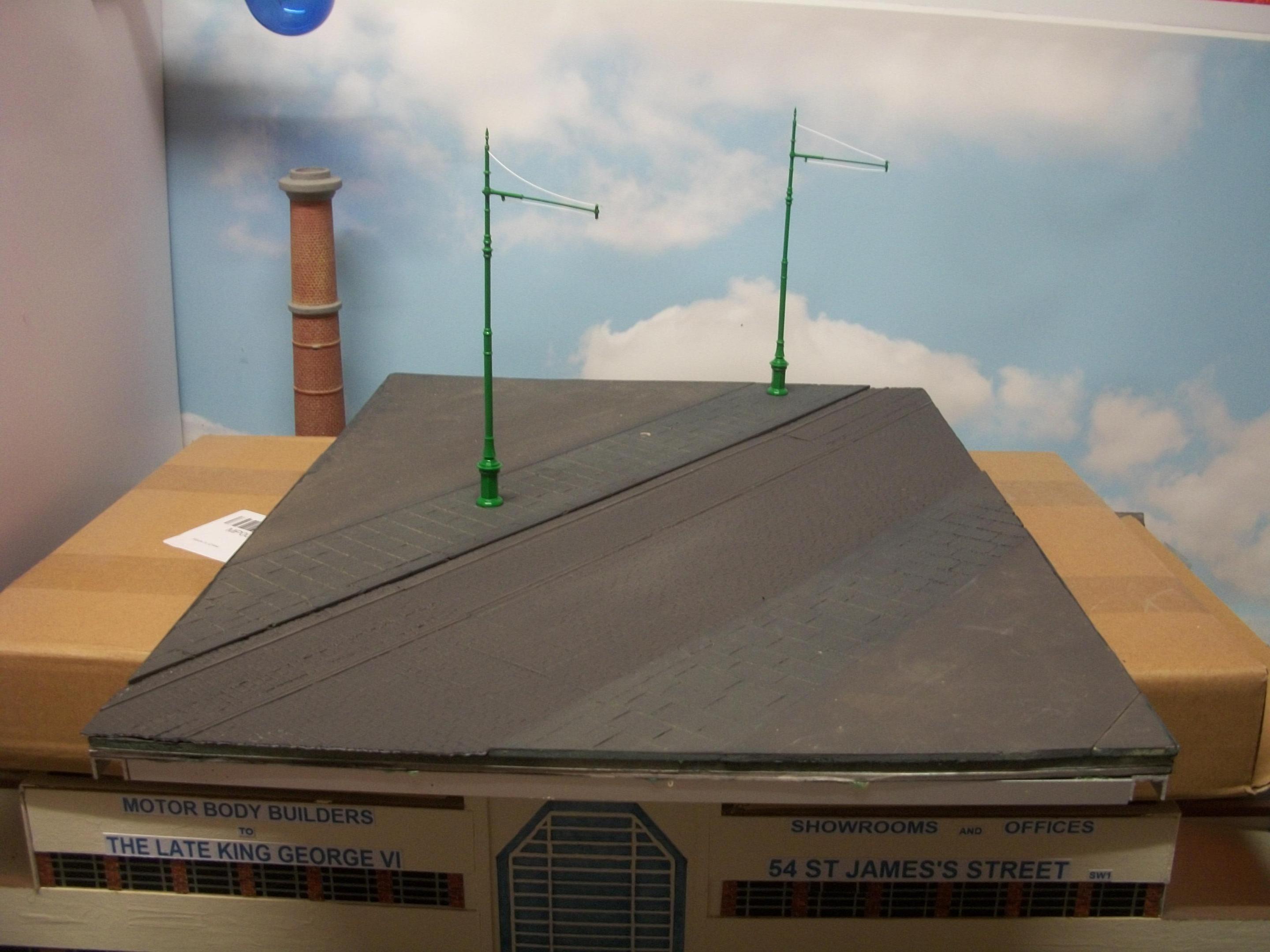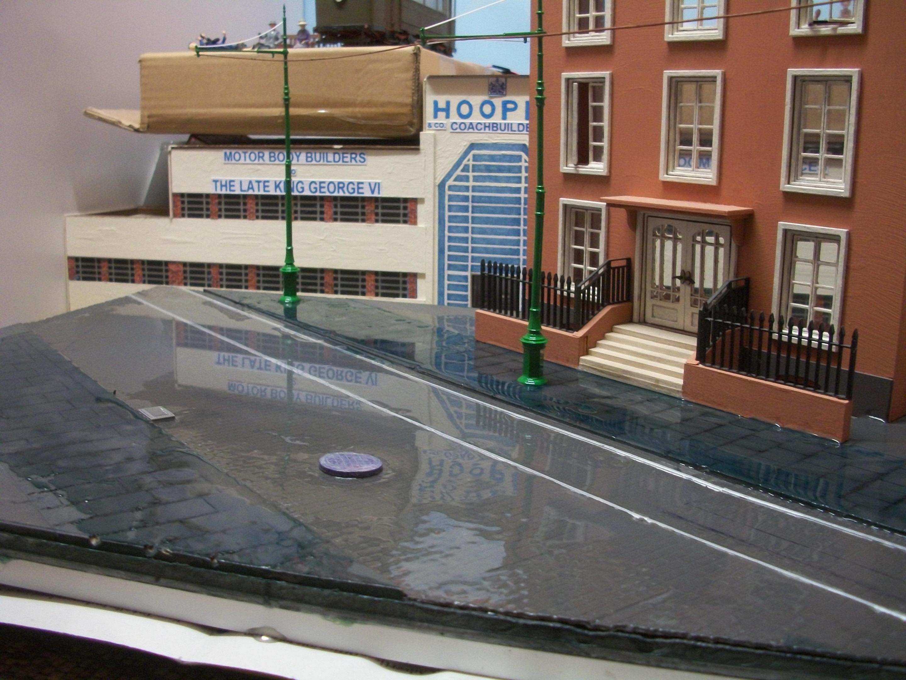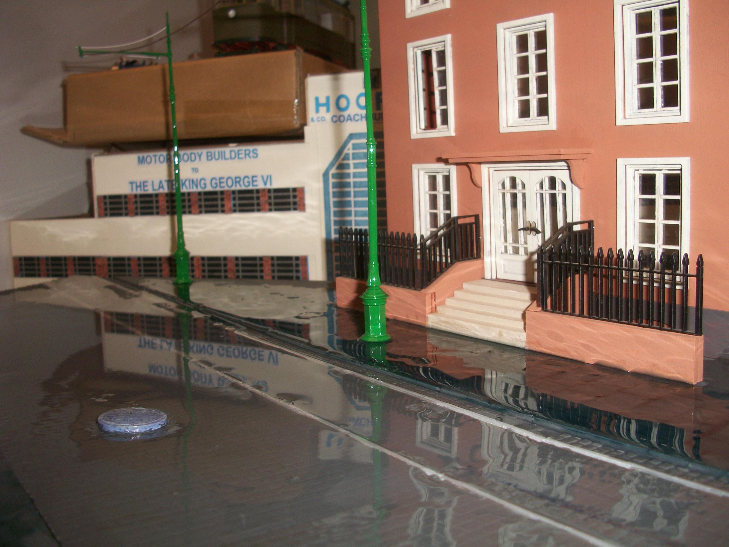 I am in the process of test fitting the three support posts for the overhead tram wires. Also, the two lengths of white styrene rod have now been painted with Humbrol Copper metallic enamel. Having masked off the edges of the two tram lines on the cobblestone road base, the tram lines have been painted with Humbrol Steel metallic enamel. The baseboard for this 1:35 scale tram car diorama is standing on top of the roof of the 1:43 scale Hooper & Co. factory building, which is why some of the model cars in the background will appear to be out of scale with the tram car, and that is because they are 1:43 scale. Started testing the Vallejo Water Textures Still Water product this evening, and this will be drying overnight. The plan is to pour or brush the Still Water onto the cobblestone road and the pavements, so as to provide night time reflections of the tram car lights for the diorama photography that follows later. David