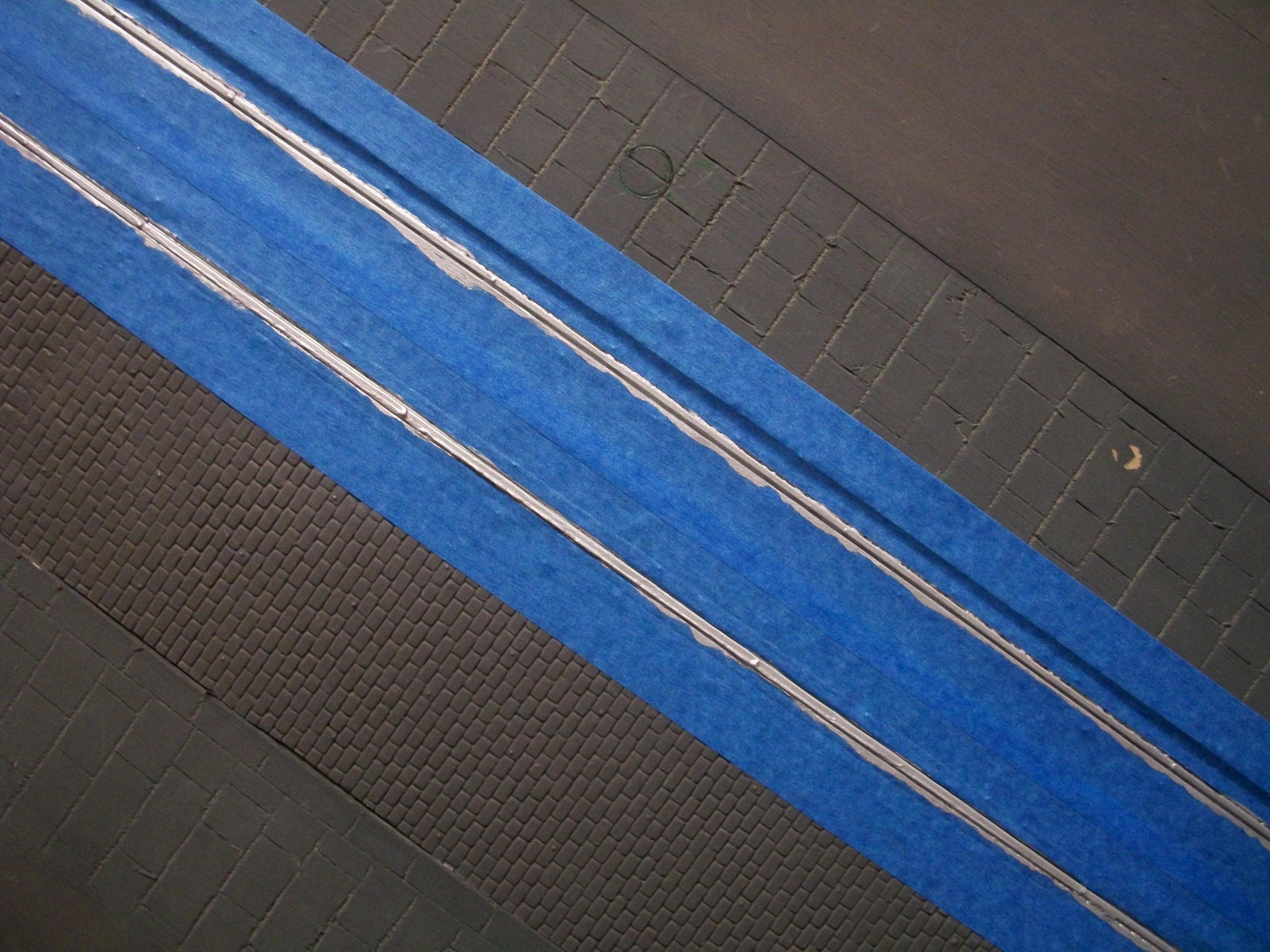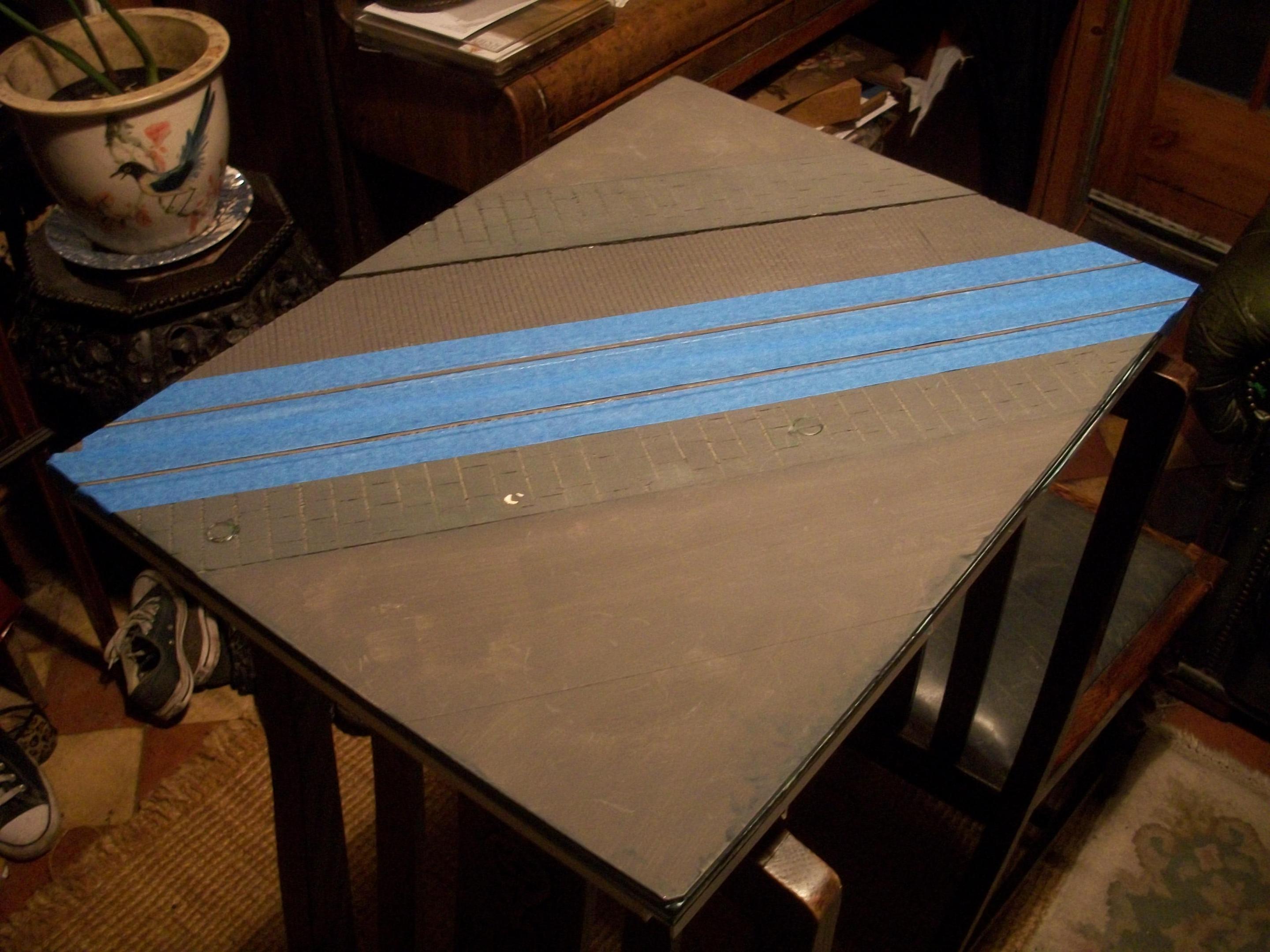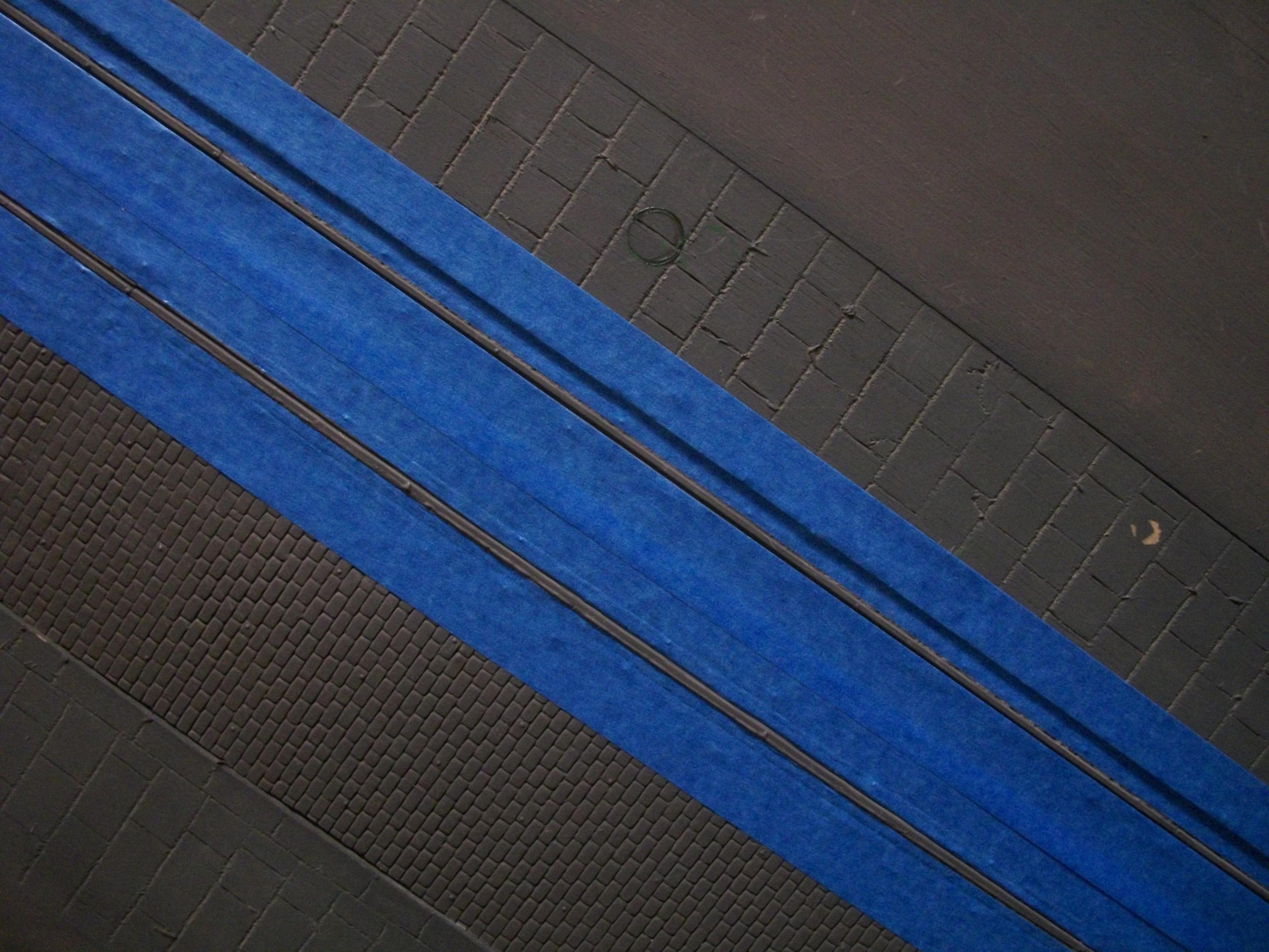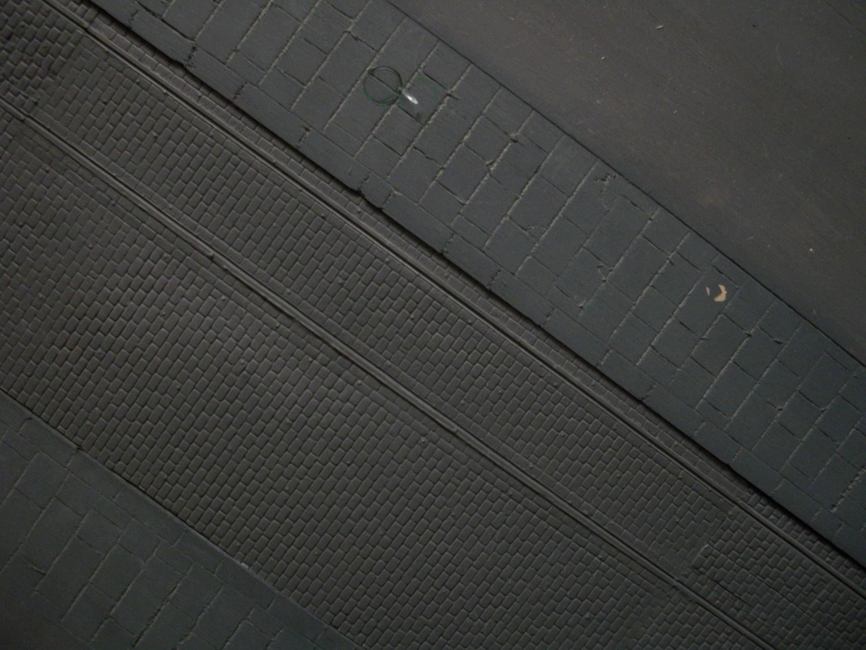 I am in the process of test fitting the three support posts for the overhead tram wires. Also, the two lengths of white styrene rod have now been painted with Humbrol Copper metallic enamel. Having masked off the edges of the two tram lines on the cobblestone road base, the tram lines have been painted with Humbrol Steel metallic enamel. The baseboard for this 1:35 scale tram car diorama is standing on top of the roof of the 1:43 scale Hooper & Co. factory building, which is why some of the model cars in the background will appear to be out of scale with the tram car, and that is because they are 1:43 scale. Started testing the Vallejo Water Textures Still Water product this evening, and this will be drying overnight. The plan is to pour or brush the Still Water onto the cobblestone road and the pavements, so as to provide night time reflections of the tram car lights for the diorama photography that follows later. David