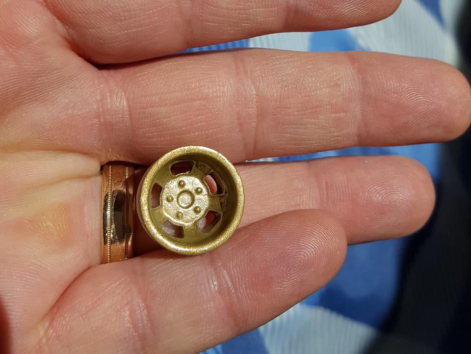 I've been doing some research on options for replicating the Dow-7 coating used on magnesium wheels. I haven't had much luck in finding a specific brand/color to paint the wheels for my project. Part of the issue is that the real coating doesn't last very long and will darken as it ages from a greenish/gold to the gray. Here is something I came up with last night. Its basically just a 50/50 mix of Testors Gold and Flat Green although I feel a touch of gray to darken it might have helped.