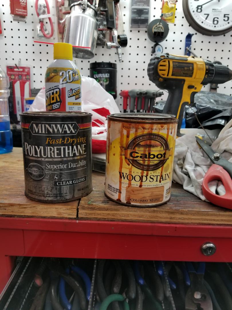 Ok. Stained and cleared the shelf today. I used "Light Maple" stain from Cabot and Polyurethane clear from Minwax! Good reason for using them. Open my paint cabinet, and there their were! Sometime in the past I apparently used them! Works for me now!!! See pics below!