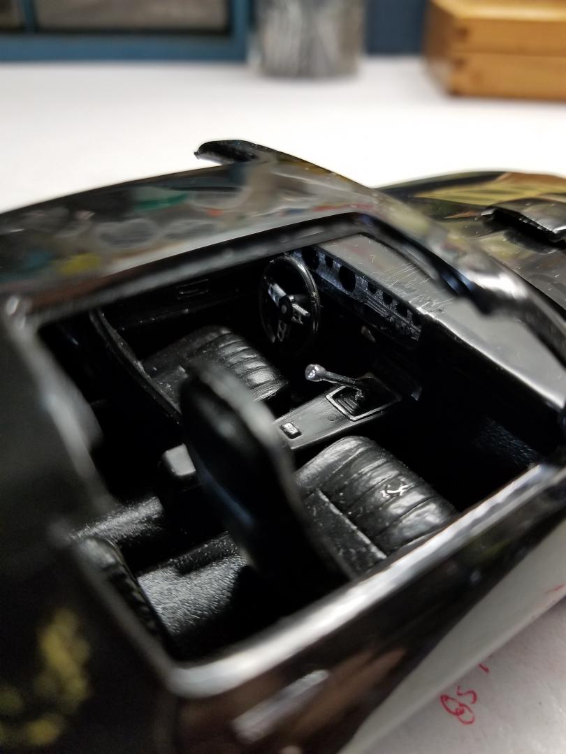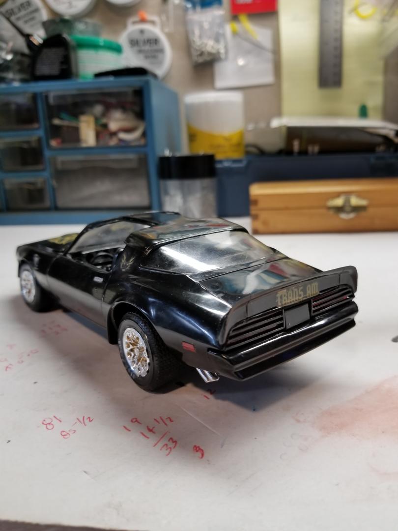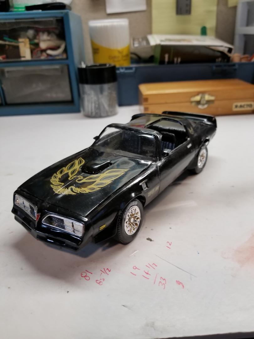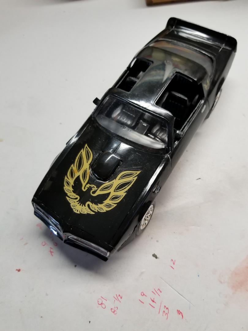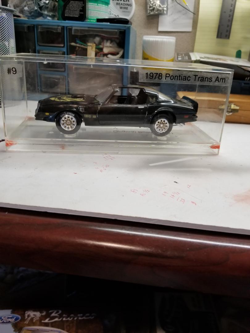 This is #7 in the series of the ones I've already built and repairing before I start on a new one. This one was built in 8/89 according to the case. The mirrors were broke off and one of the exhaust tips. The "Future" clear coat I put on back then yellowed where it was too thick, so I sanded and re-cleared with a rattle can clear. Got a new case and put her on the self! On to #8