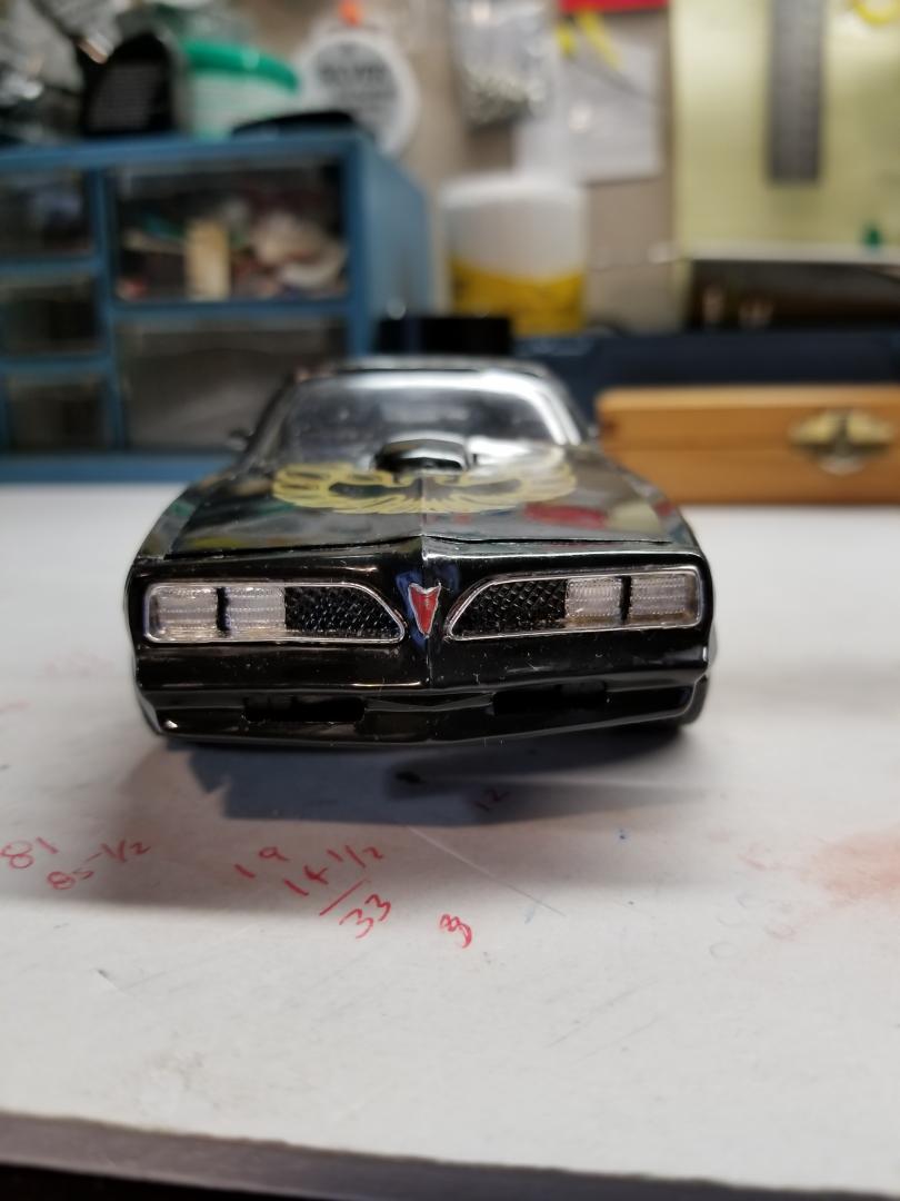 Well, while the body ,motor is in the purple pond , soaking to remove the paint, I decided to work on the front grill area. I screwed the headlights up when I built it in 1989. No clear glue. So, I taped up the holes on the back of the gill and filled them with two part epoxy that dries clear. Will use a chrome pen and then use Kristal Klear on the headlight lens,