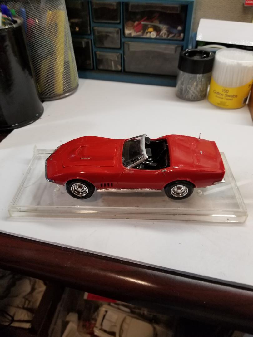 Got a 1961 Cadillac Convertible. Motor and rear end glued in backwards. Don't know the scale, but too small for a 1/24 and too big for a 1/32