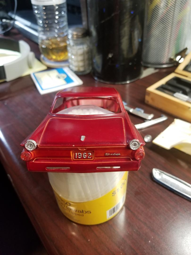 3. OK. Step #1 on my 1962 Dodge Dart. Dis-assembly. Already hit a snag. Drilled out the pins that held the body to the frame. Easy! Everything came right apart EXCEPT the tail lights. Apparently I wasn't bashful with the glue on them. Don't want to mess them up anymore than I have to. They would almost impossible to find, So, Any suggestions on the best way to remove them? Also, need to strip the body. What should I use that won't screw up the plastic or the lines on the body? I've ordered a Lindberg, 1964 "Color Me Gone" Dodge for the frame. Will probably use the motor too. Johan Motor is not very detailed. Thank You in advance