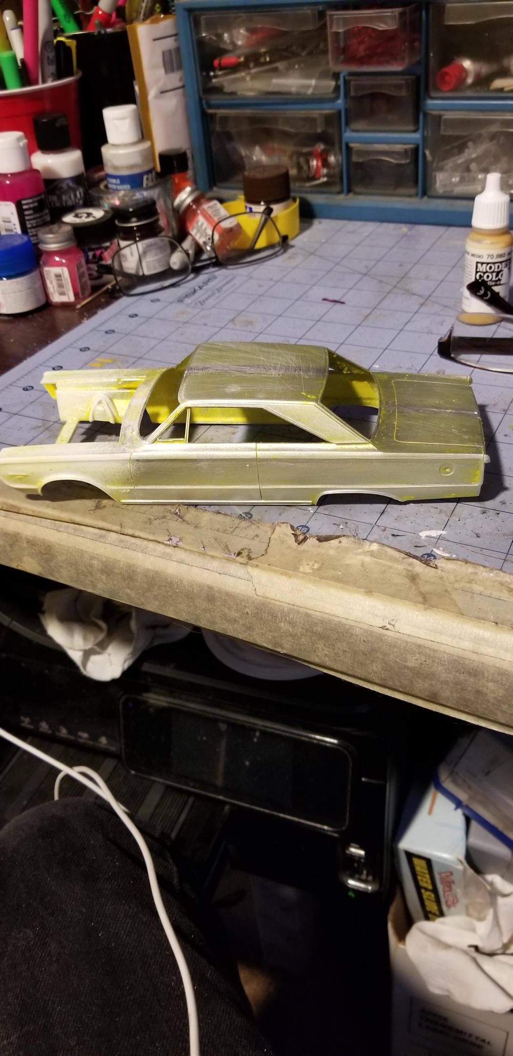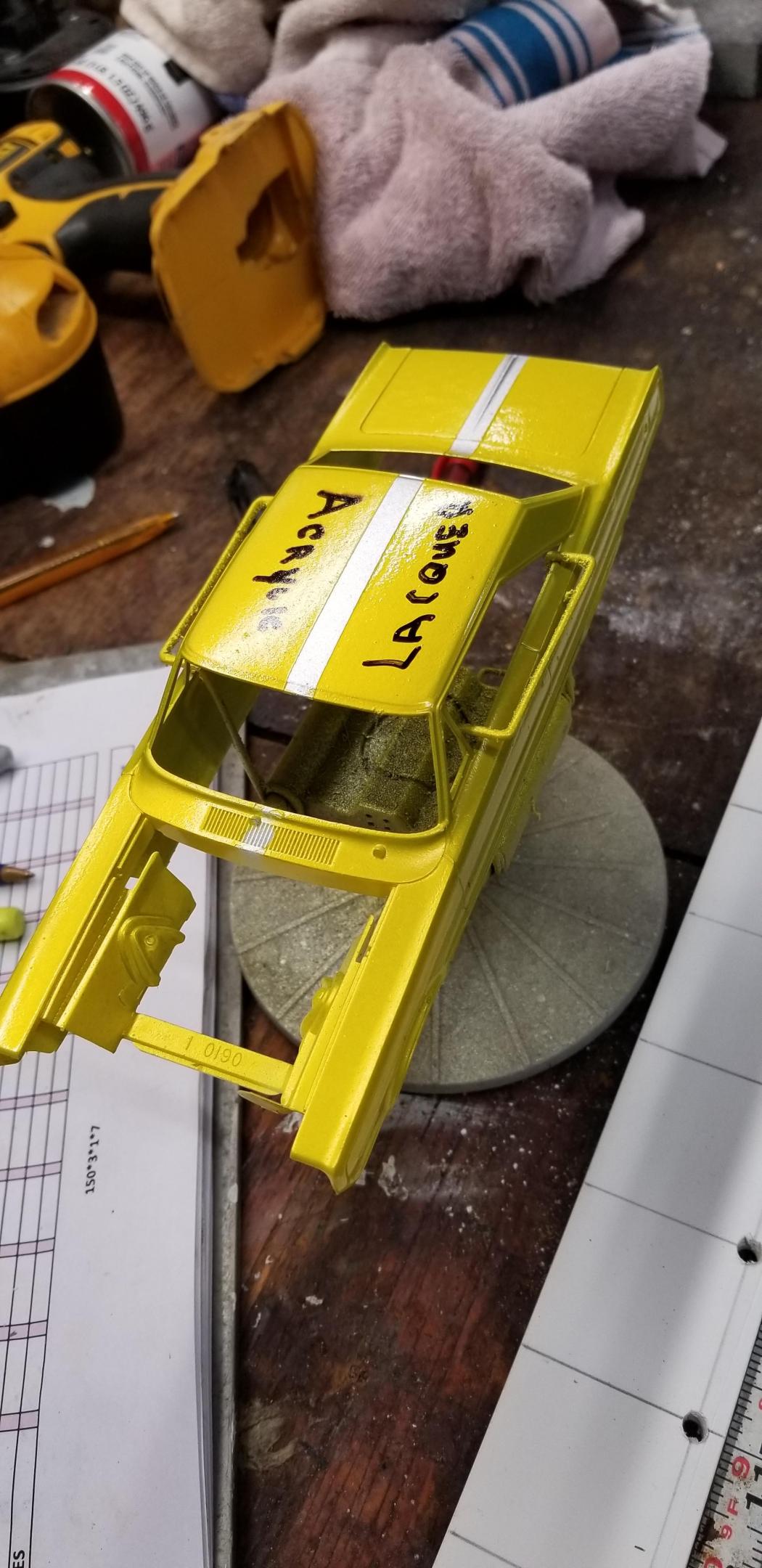 Ok. the body spent the night in the purple pond. Acrylic clear came off all the way to the base coat, real easy. The lacquer clear coat was harder to get off but a small wire brush convinced it. Funny, the Lacquer silver base coat stayed on. Conclusion? The base coat was on a couple of days before I painted the yellow. The lacquer base coat had a couple of days to "dry", "set" or "gas out" , whatever. ALSO , the silver base coat made the iridescent seem to have a "blue" tint to it. Left the front white. Seems the yellow was a better shade of yellow in the front. Take notes, put in book for future reference