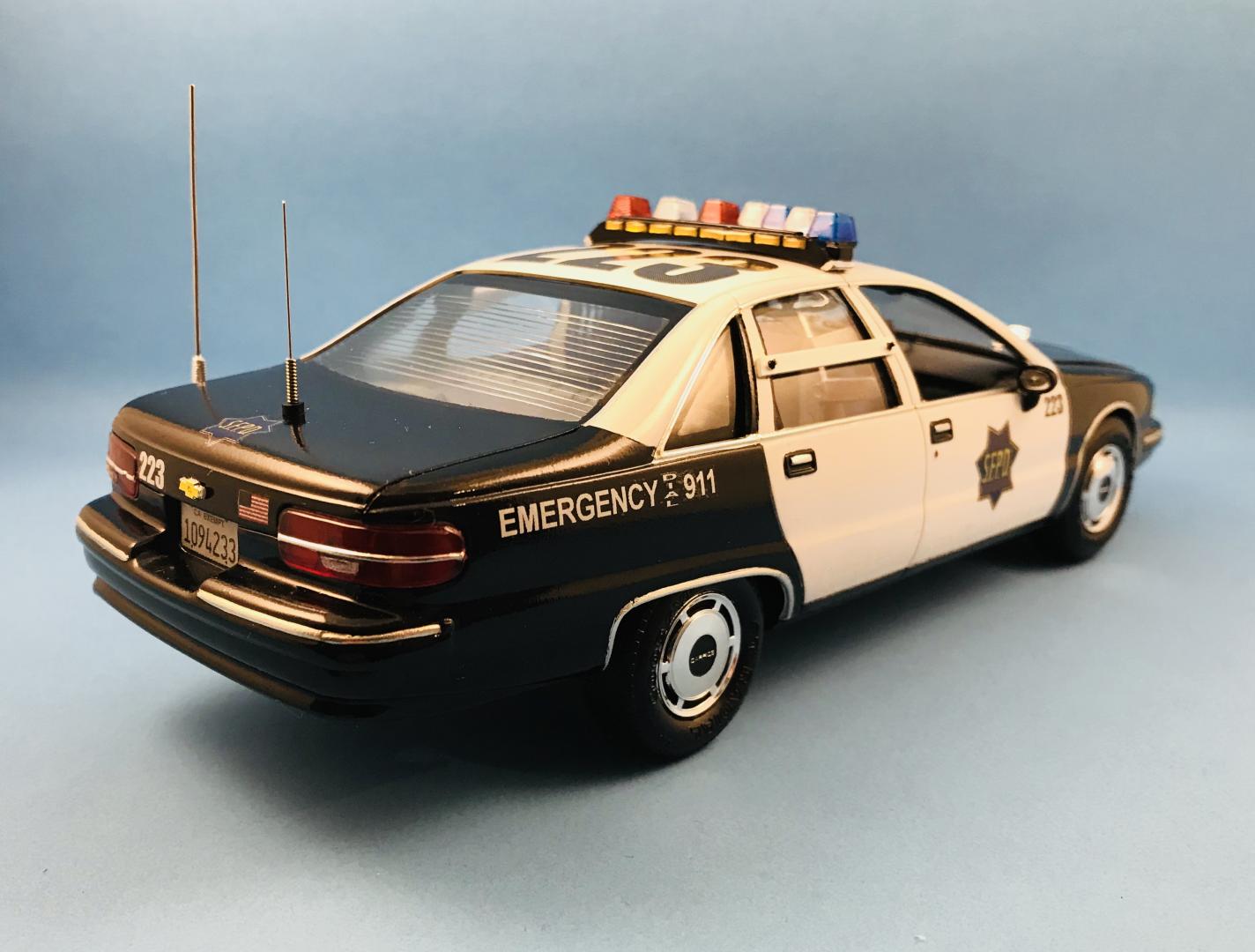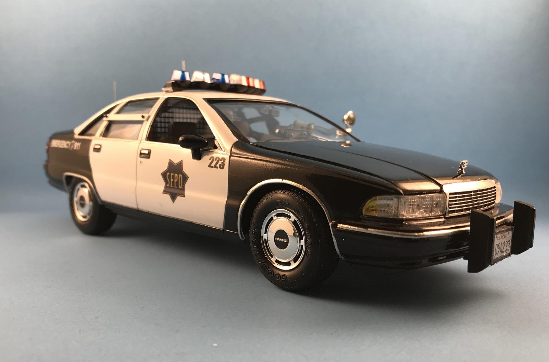 After a couple short deployments , I bellied back up to the workbench. This started out as the Gotham PD car and I was not pleased with the build. Bad fits and lack of some details. I decided to put the A318 pursuit “Chrysler clean burn system” engine with the spark control system attached to the air cleaner. Swapped out the grill and headlights for a correct Plymouth one, added bumperettes and painted with Regatta metallic blue. Fabricated the light bar and put correct wheels and dog dish rims from Fireball model works. The first pick is what I was going for.