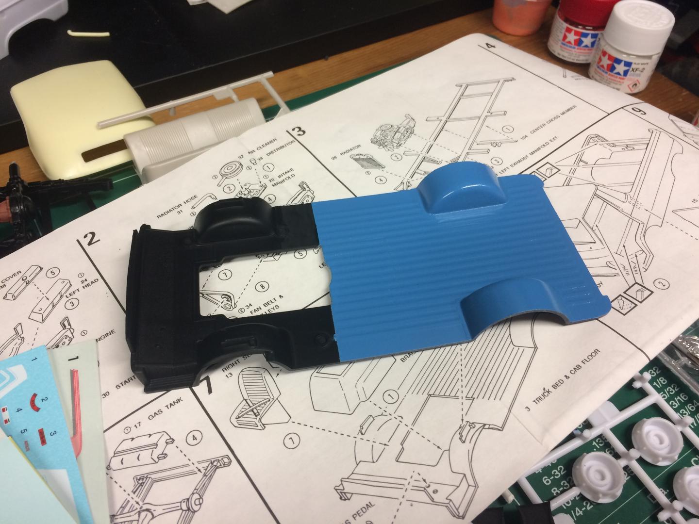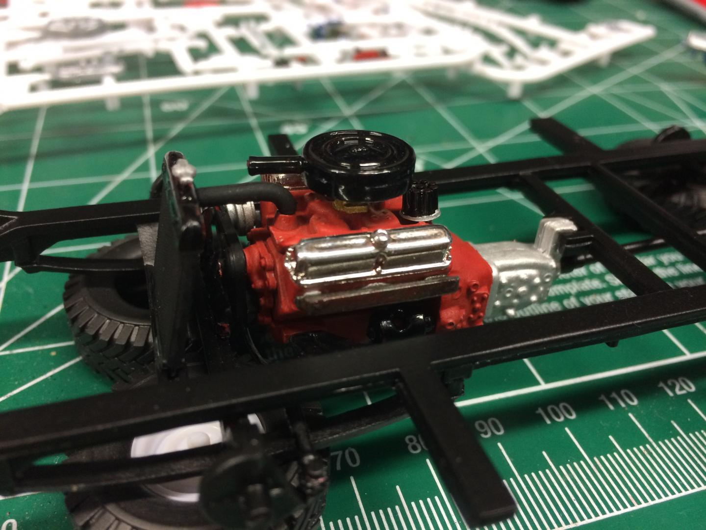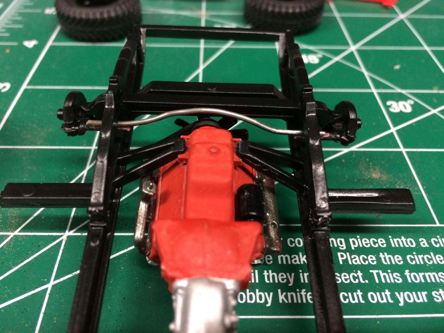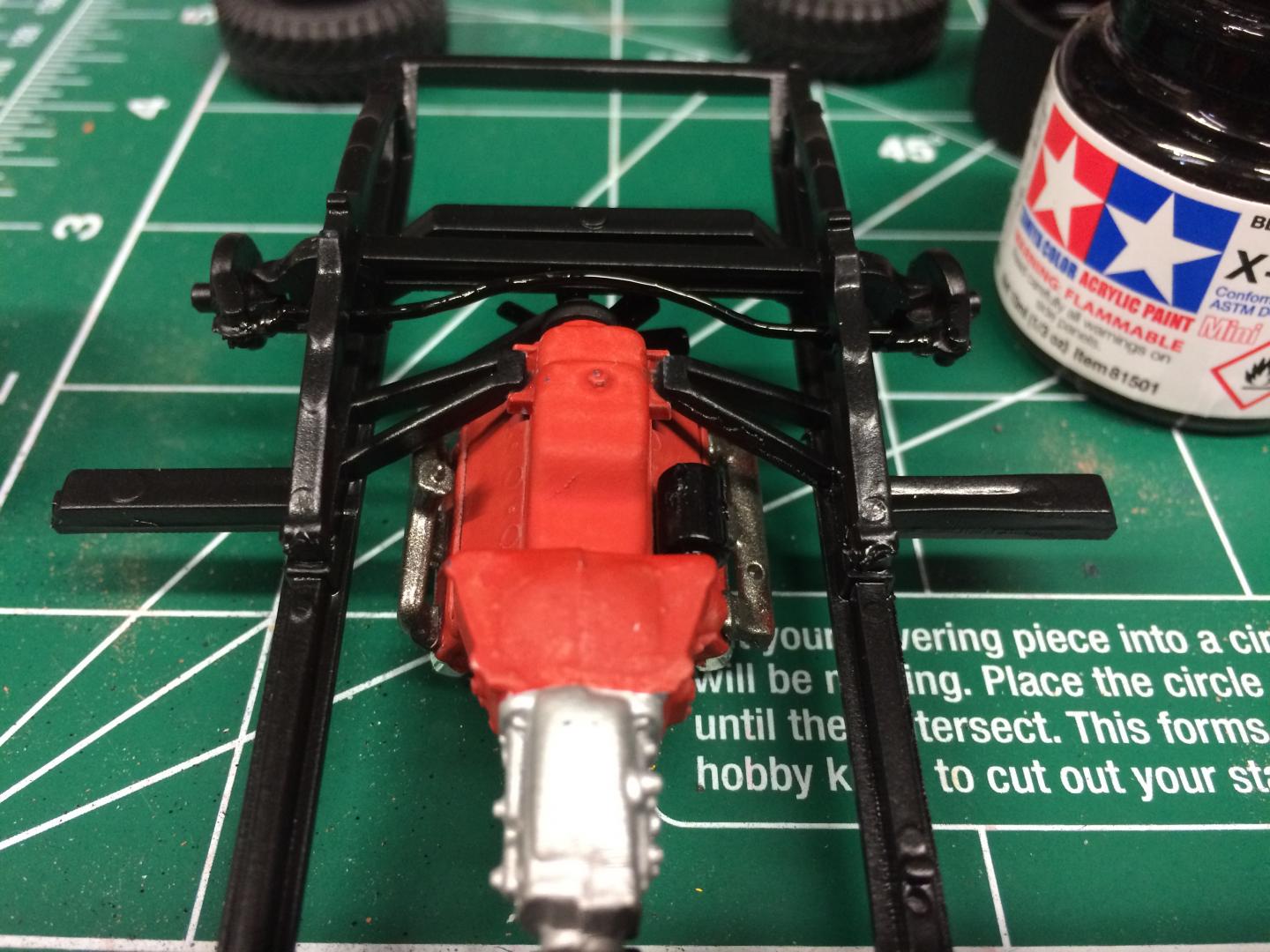 16. Playing with the chassis a little bit, found that because the axle is so low, the tie rod goes exactly where the crank pulley goes. I cut it out and replaced the middle part with a paper clip bent to clear the crank pulley when you turn in reach direction. Motor is in place, not going to do much more to the motor since you can't see it anyway. Bed floor is painted.