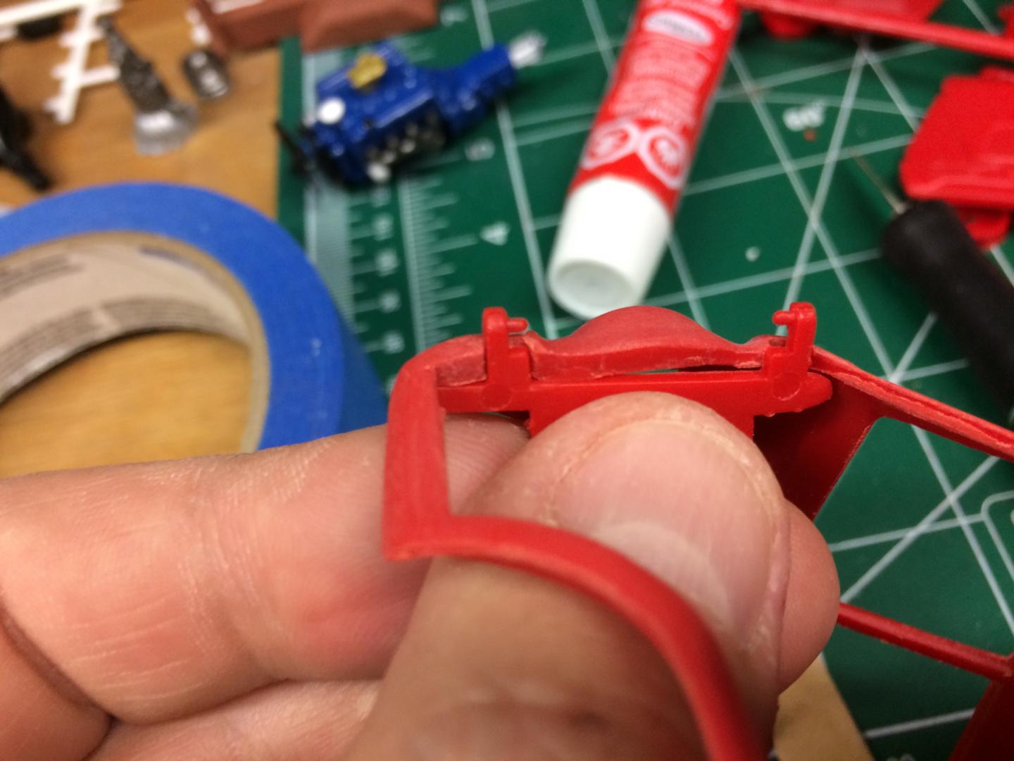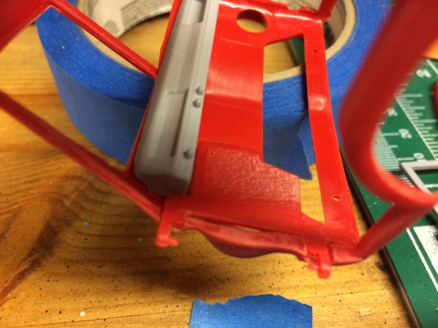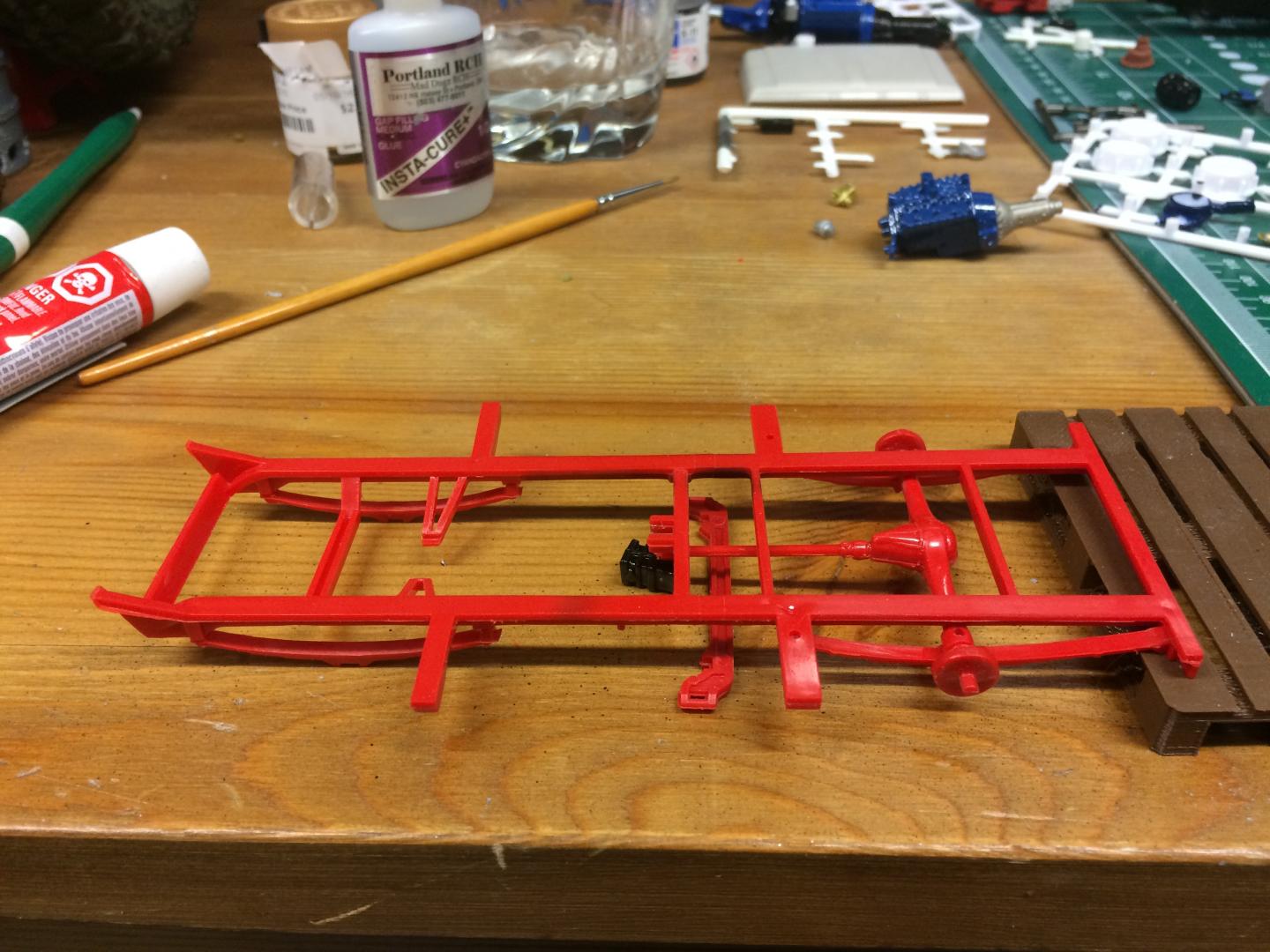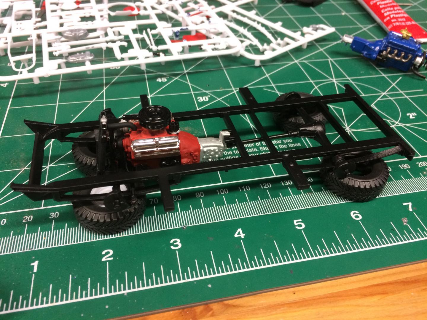 16. Playing with the chassis a little bit, found that because the axle is so low, the tie rod goes exactly where the crank pulley goes. I cut it out and replaced the middle part with a paper clip bent to clear the crank pulley when you turn in reach direction. Motor is in place, not going to do much more to the motor since you can't see it anyway. Bed floor is painted.