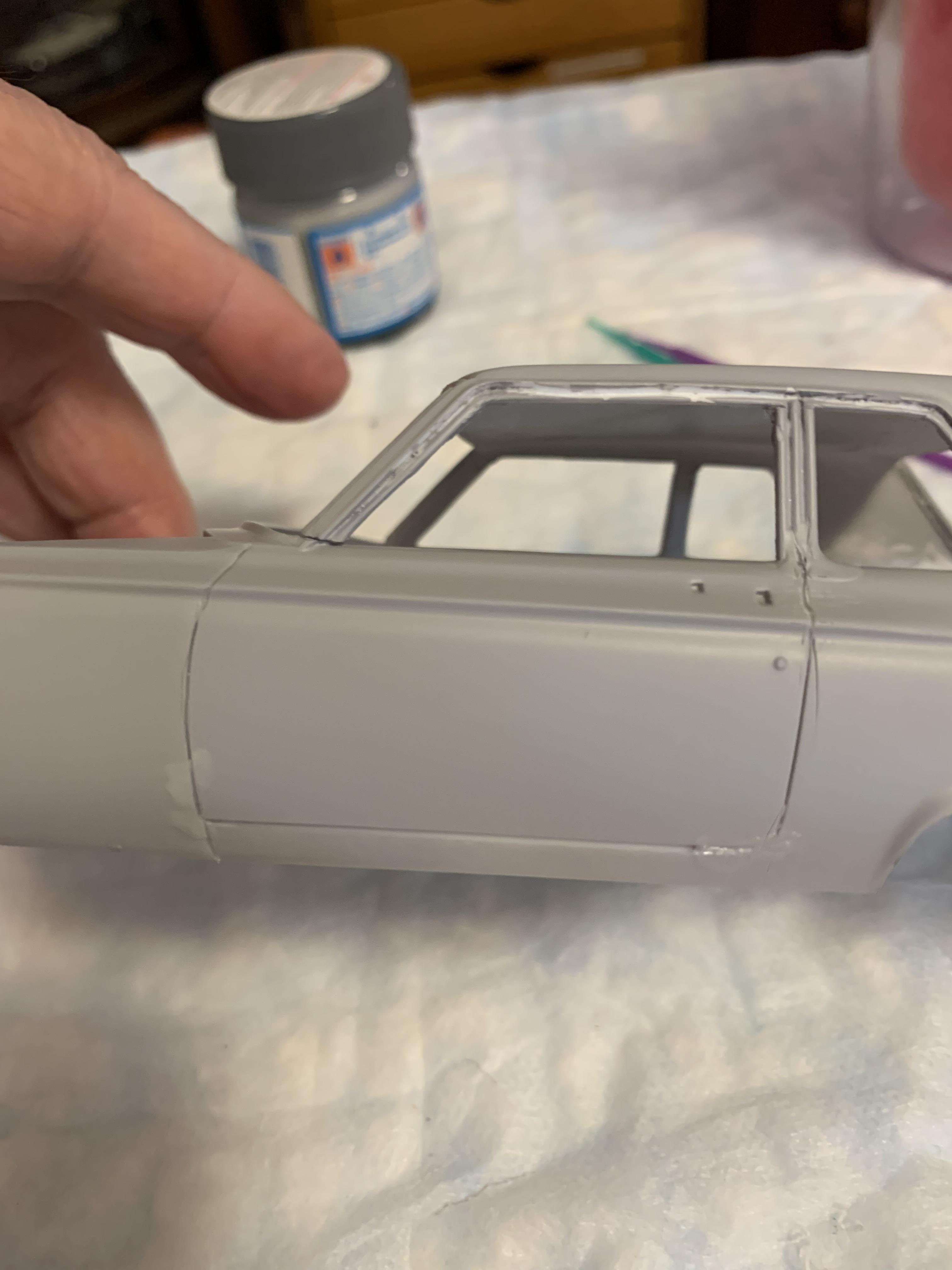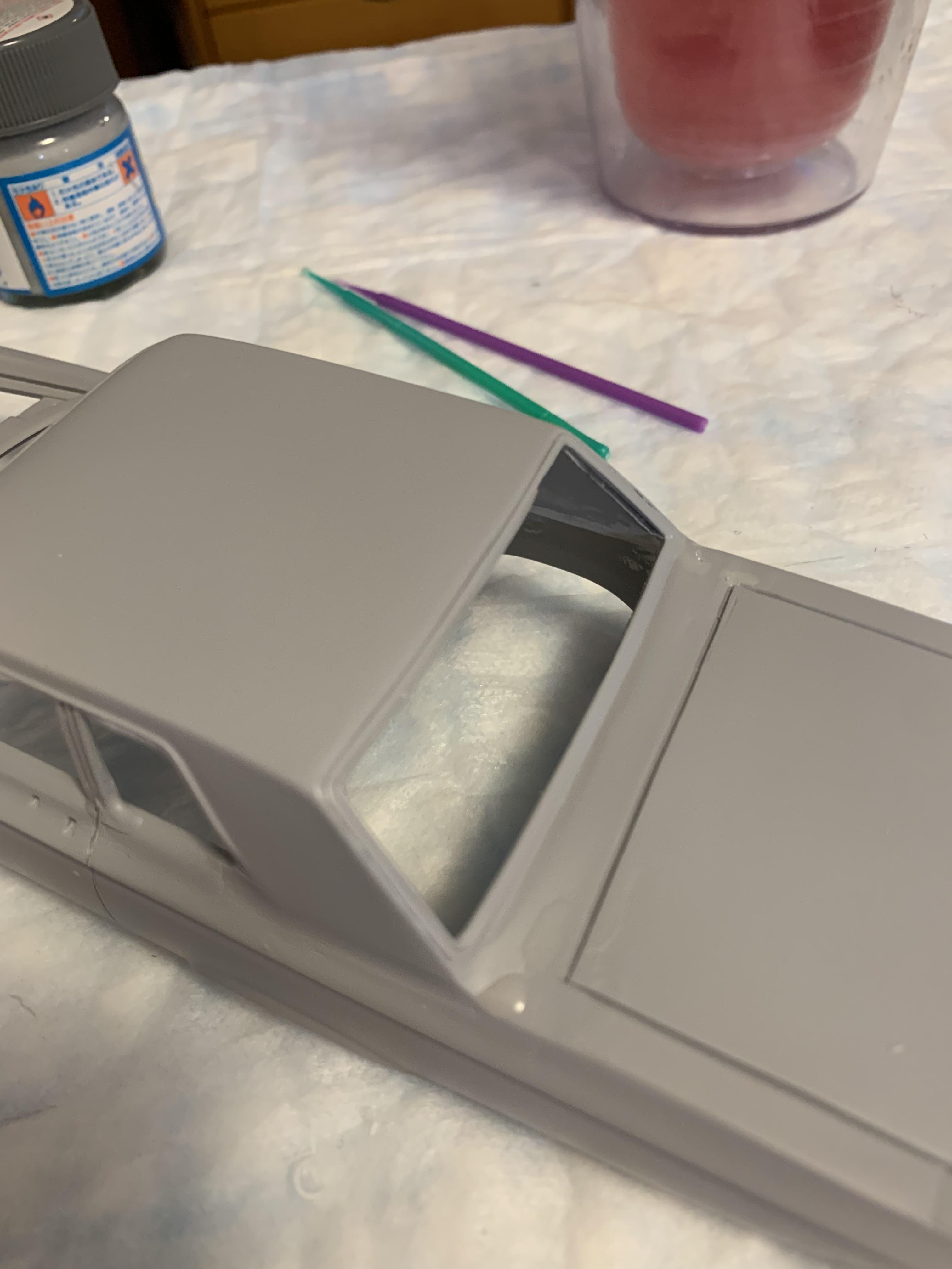5. Some more sanding, a failed attempt with vinyl tubing to extend the package tray, weakened the top of the sedan post by clipping part way through the post, then bending it into alignment, brushed on some ca glue (really like the brush on stuff). Then a touch of “kicker”. Missed it a little on the passenger side. Got to fill a hole (on the underneath side) with some putty.