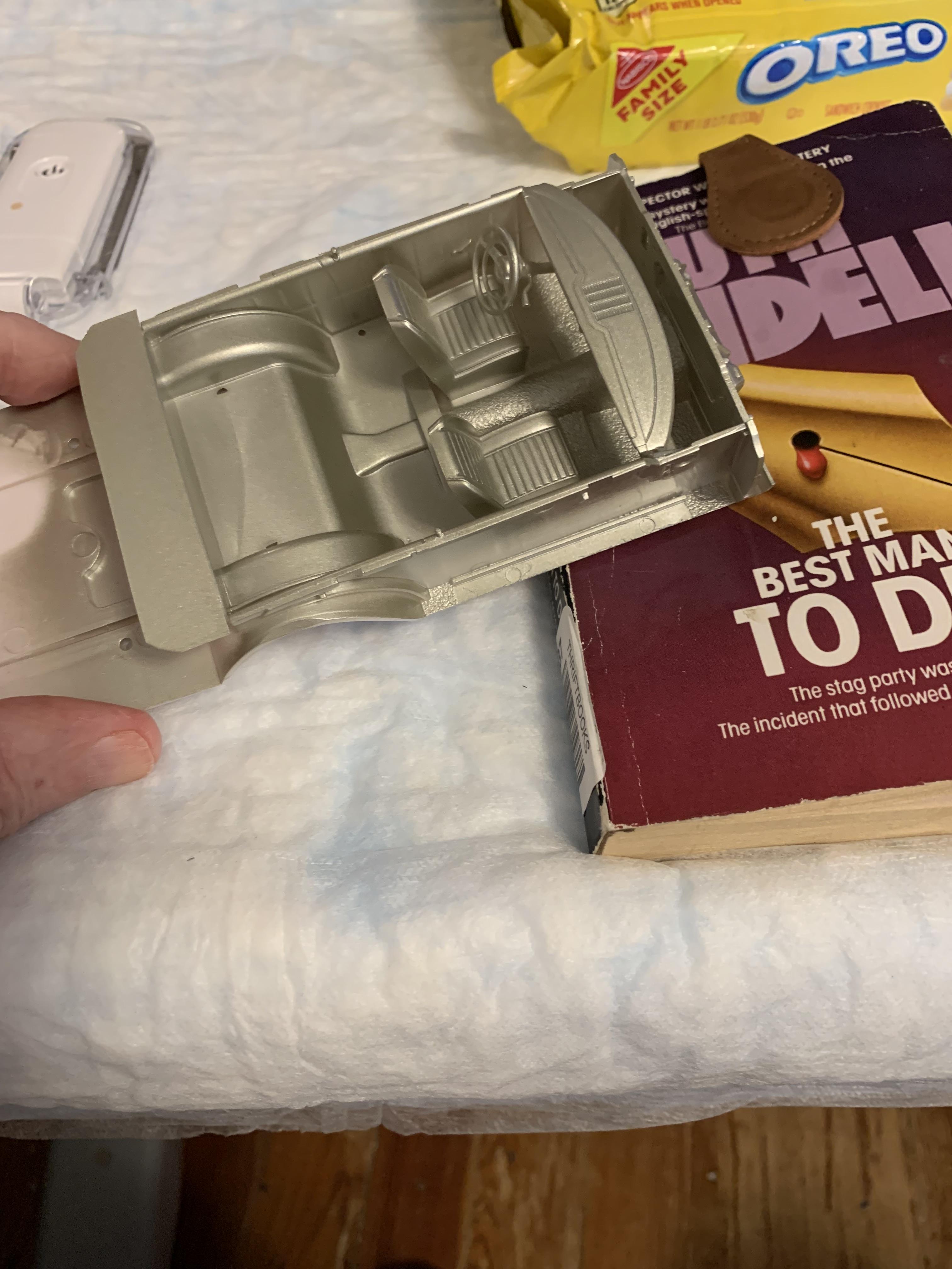 3. Thanks, Mike. Took a couple days off. Cut a new package tray from .015” styrene sheet and glued it on. Some more sanding (sigh!) , run some 3000 grit foam Tamiya over the whole body, then scribed the trunk. Washed it off for another coat of primer and paint the interior with some Tamiya Champagne gold.
