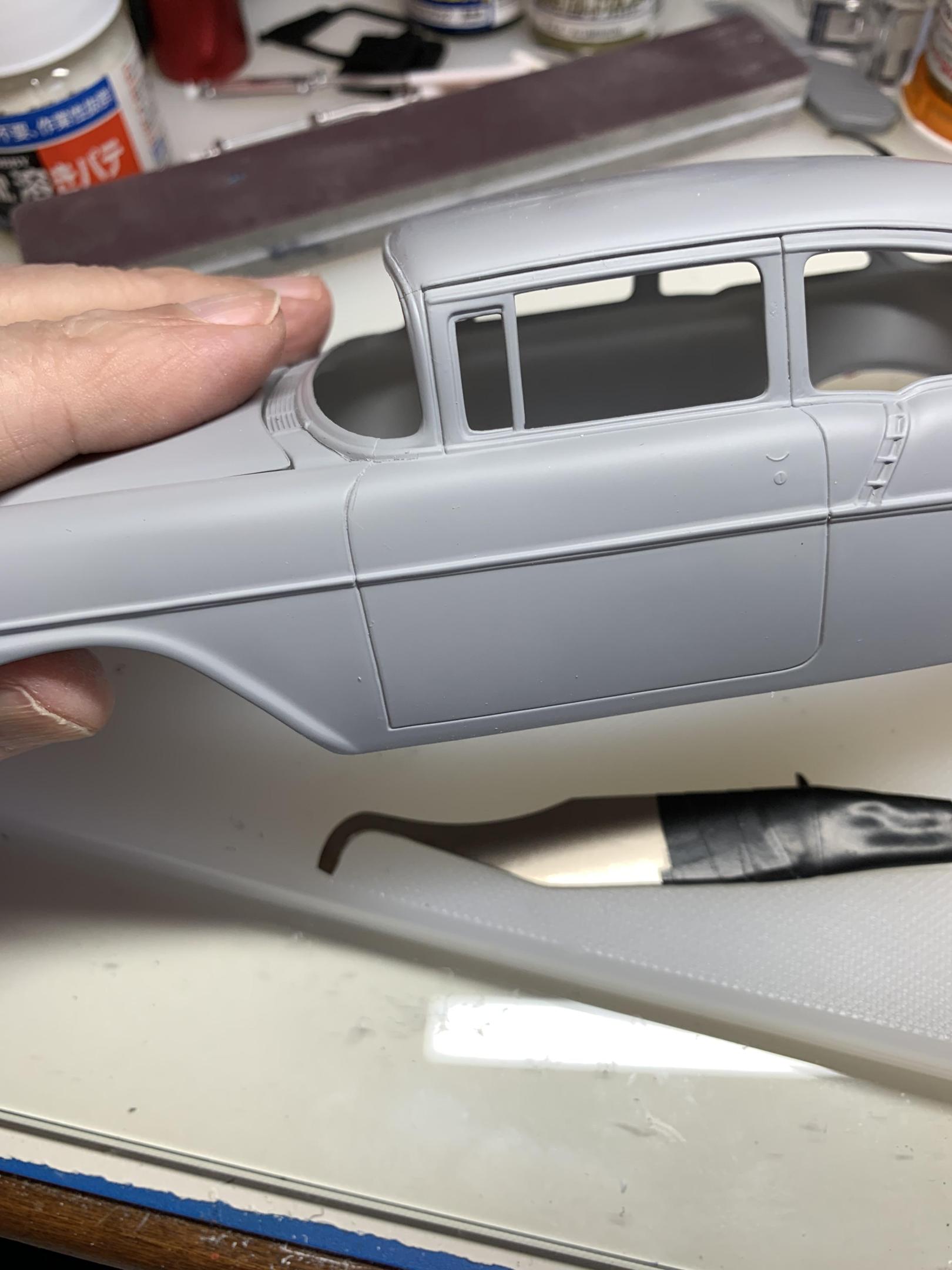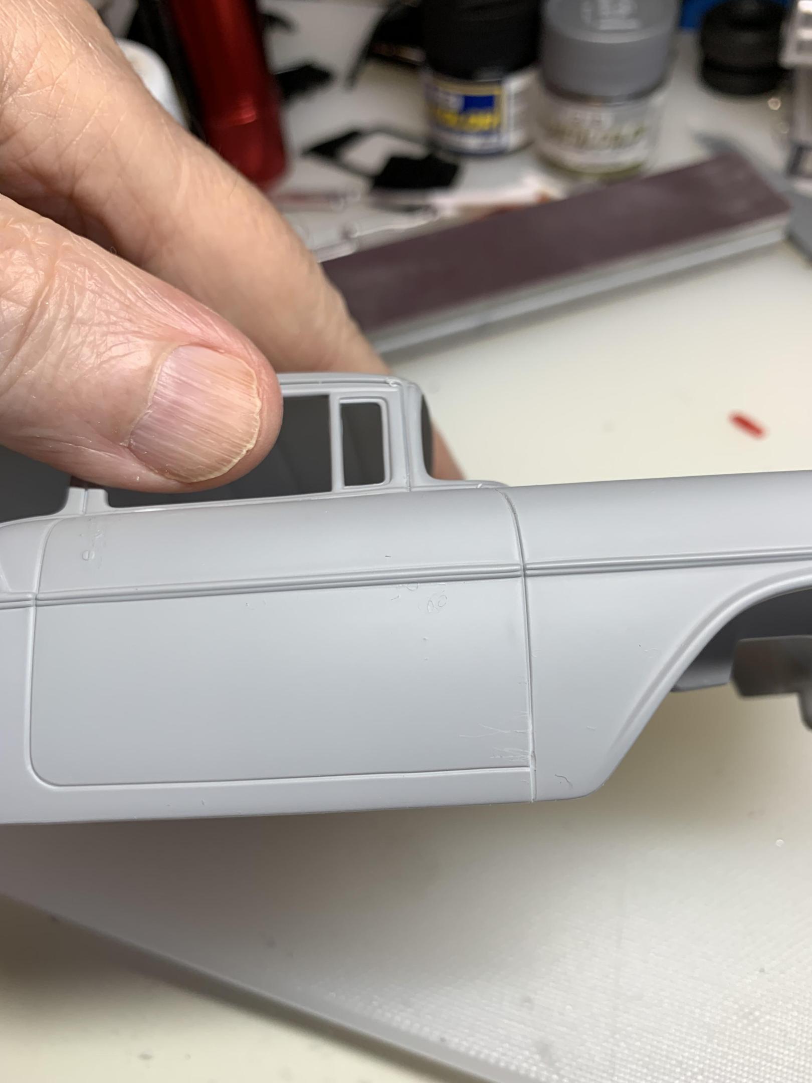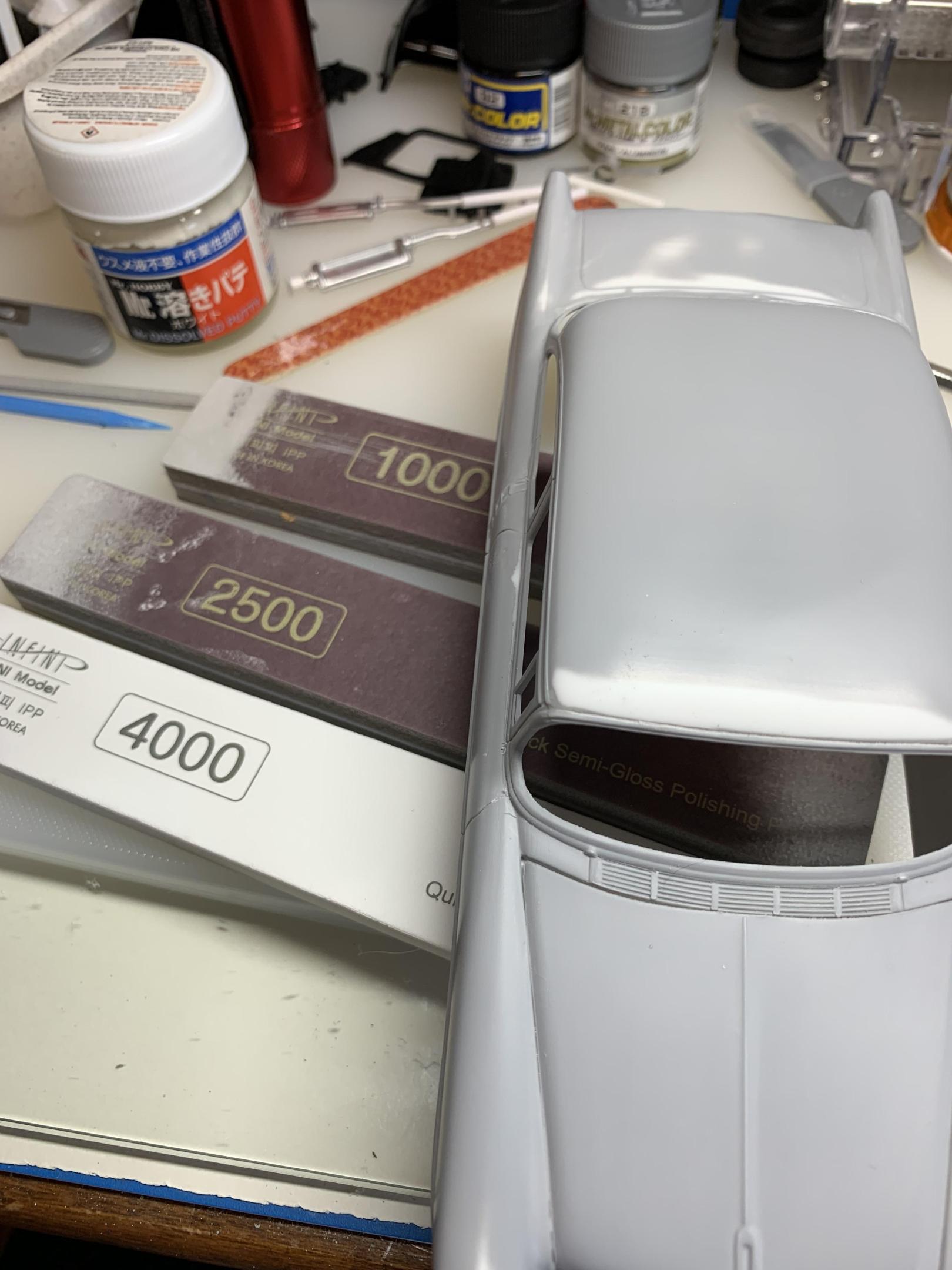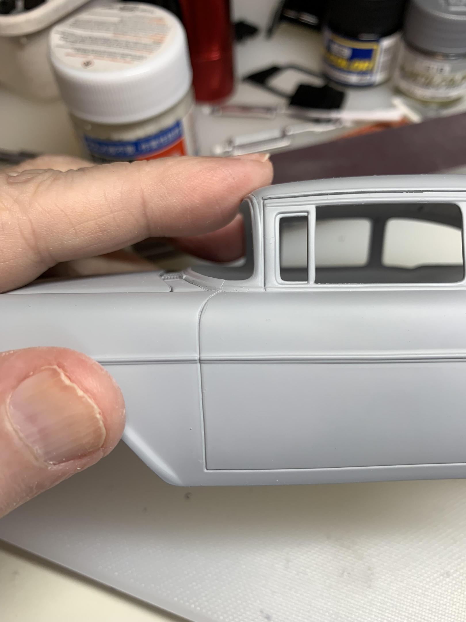 Yes, I like the ceramic scraper, and the infini soft back sanding sticks. Some pics after primer. Tried deepening the front and rear windshield with different scribing tools. Went ok, but, slipped off in the center of the back windshield. Then, I remembered I had purchased an adjustable Dspiae scriber specifically for this purpose. That’s pretty sad when you can’t remember all the tools you have. Anyway, it worked fine, and I put some putty on the gaffed up area and am letting it dry overnight. Gonna take a night off to watch the PBR (bull riding).