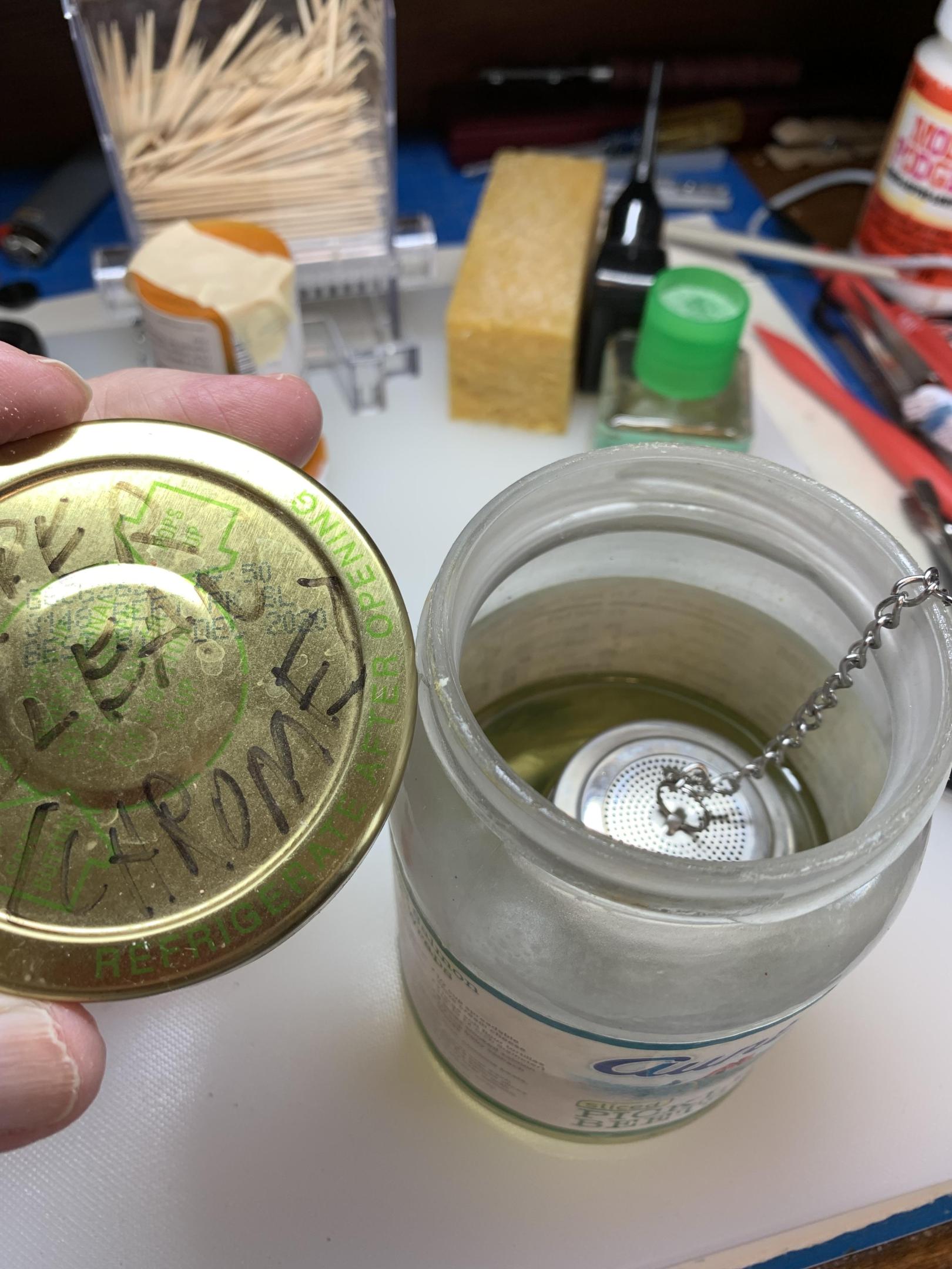 I fill mine half full with lead pellets and put a strip of masking tape on the top (actually the bottom of bottle) where the indentation is for a puddle of super glue. The next day I strip it off and replace with another strip of tape. I also use it as a resting place for my tooth pick that I often use for applying ca glue.