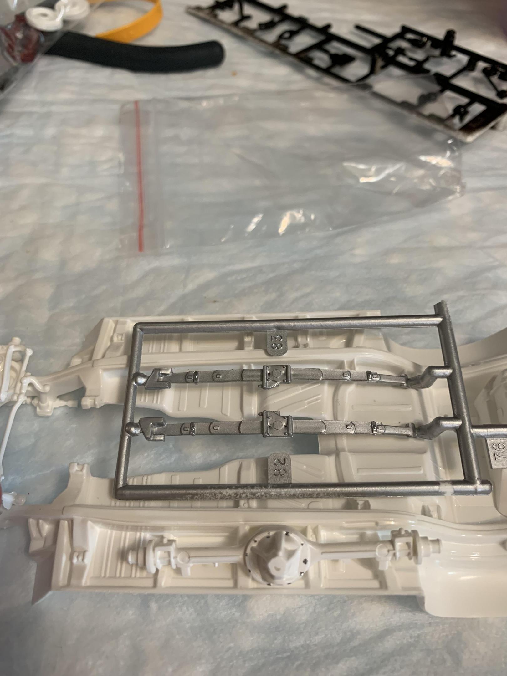 The rear end and leaf springs are ready to install and I painted the shocks yellow as Monroe shocks were the most commonly used. Forgot to paint the front bumper facia, so did that. Put some ts30 on the scattershield (to be finished with some orange) and trans. -