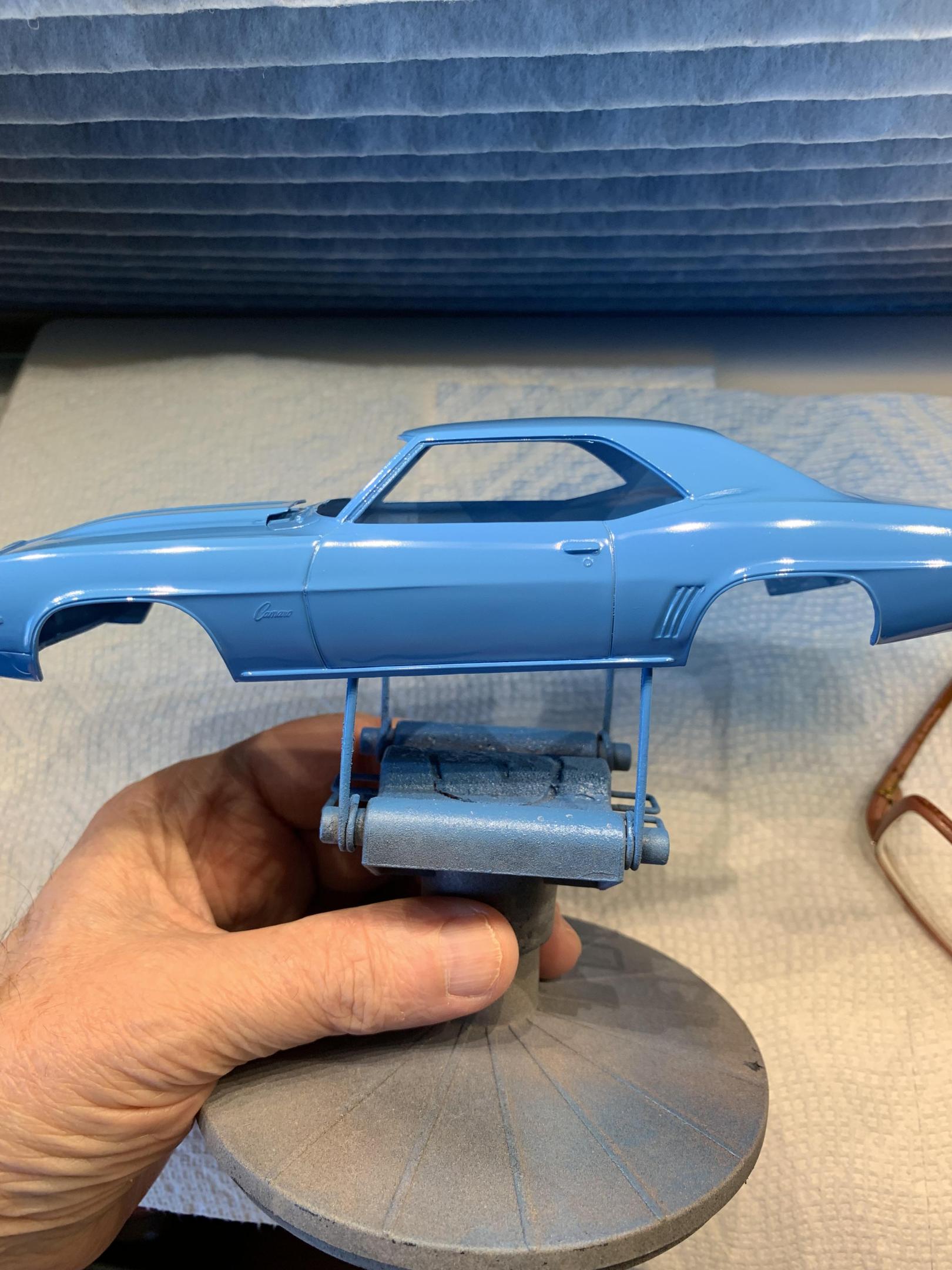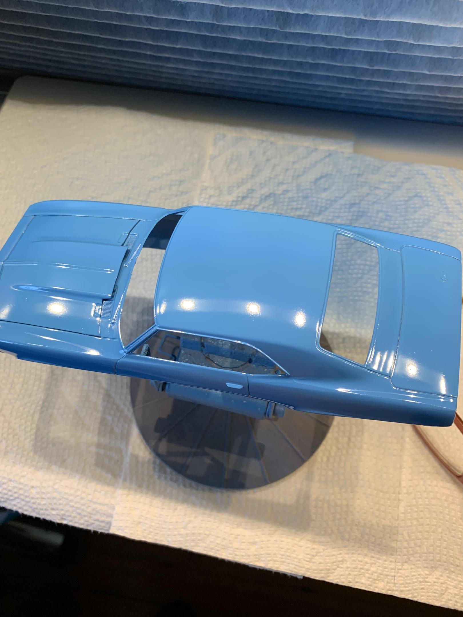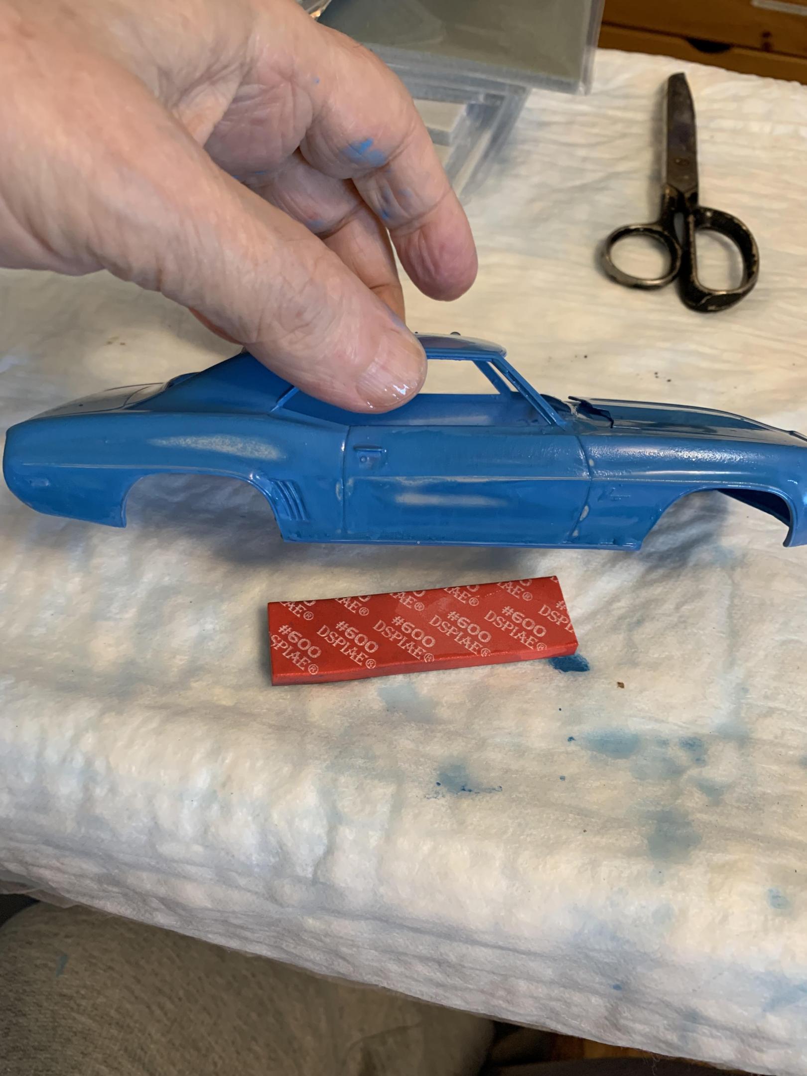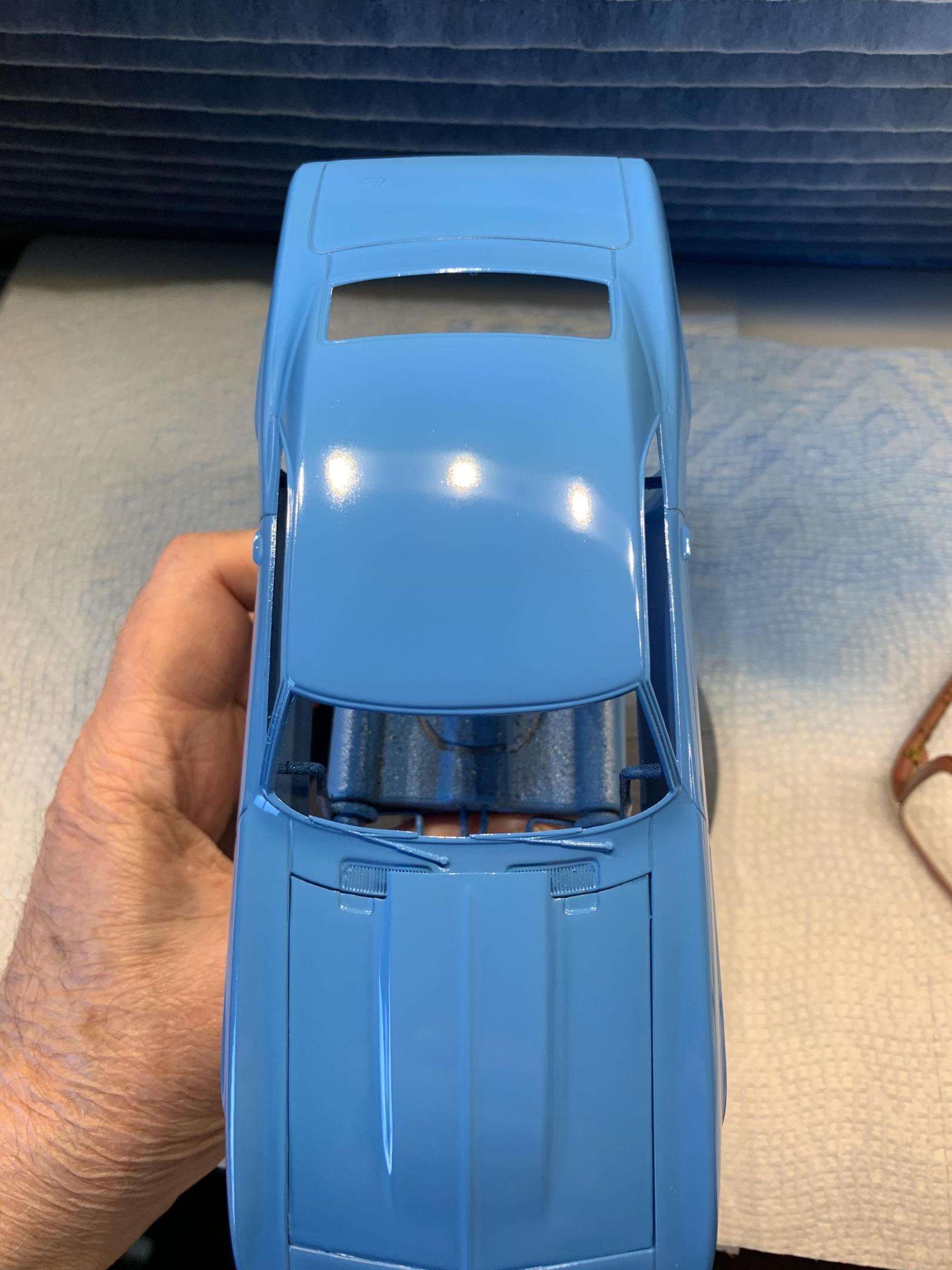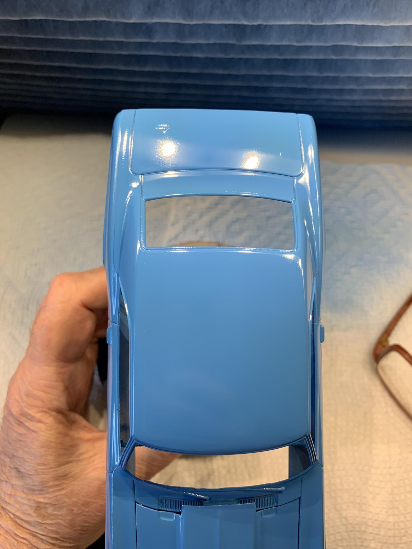 24. Another day, another paint job, on the same car (or so it seems). Some builds just fight you more than others. I ain’t quitting. Top of car turned out fine, but experienced runs on sides of car. Sanding down sides, mask off top, then another respray.