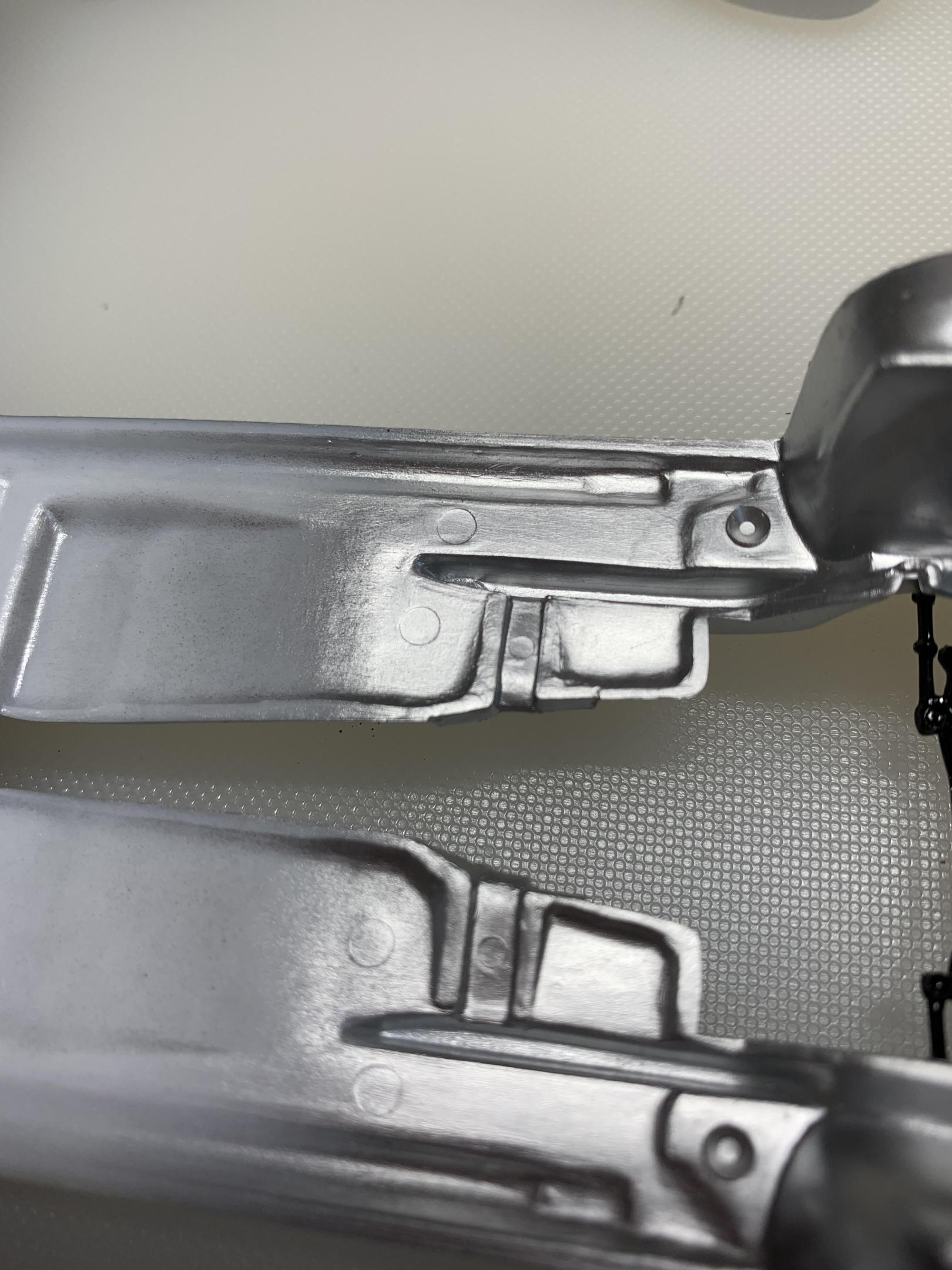 12. Thanks, James. Some slow progress. Put some flat clear on the trans, made it look like primer again. Was hoping for a flat aluminum look. Sanded leaf springs down to appear like mono or split leaf springs like most guys use. Painted them with some steel enamel.