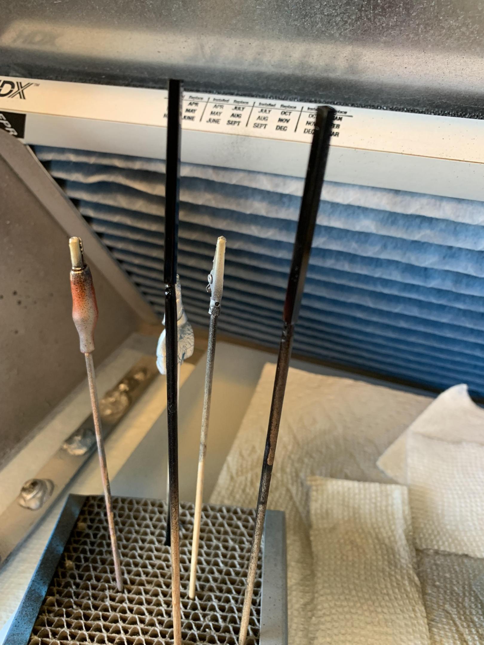 20. This came about when I noticed how much better I could see details and small pieces when viewing those things on a light background. Heretofore, I had used cutting mats of different colors with varying success usually ending up with magnifying glasses with additional lighting. I initially noticed this when wetting down white paper towels in the spray booth. I could make out details of the paint job better. Anyway, trying it on my work bench about 6 months ago has allowed me to work without any assistance from glasses, just decent lighting. First I used paper towels, then plain white sheet paper. About a month ago, I purchased some 12”x18”x1/2” cutting blocks. Easier to clean up and less trash to throw away. If I need to do some cutting or drilling, I pull out a small cutting mat or piece of 2”x4”. I also use a piece of glass with white paper under it.