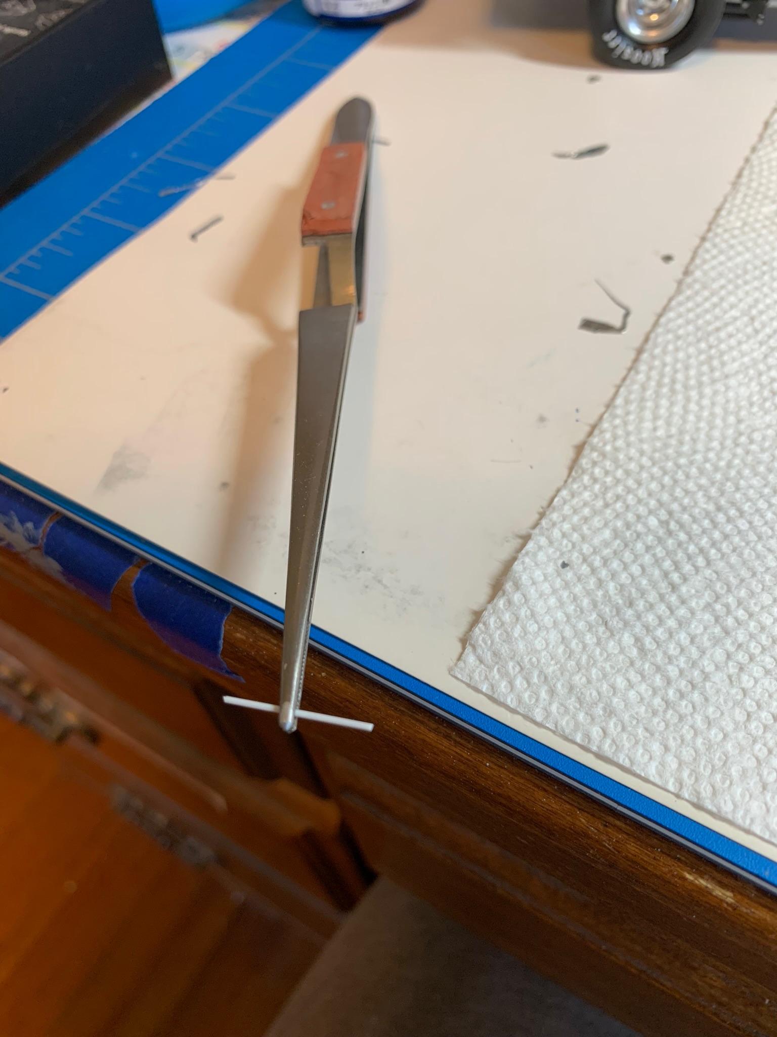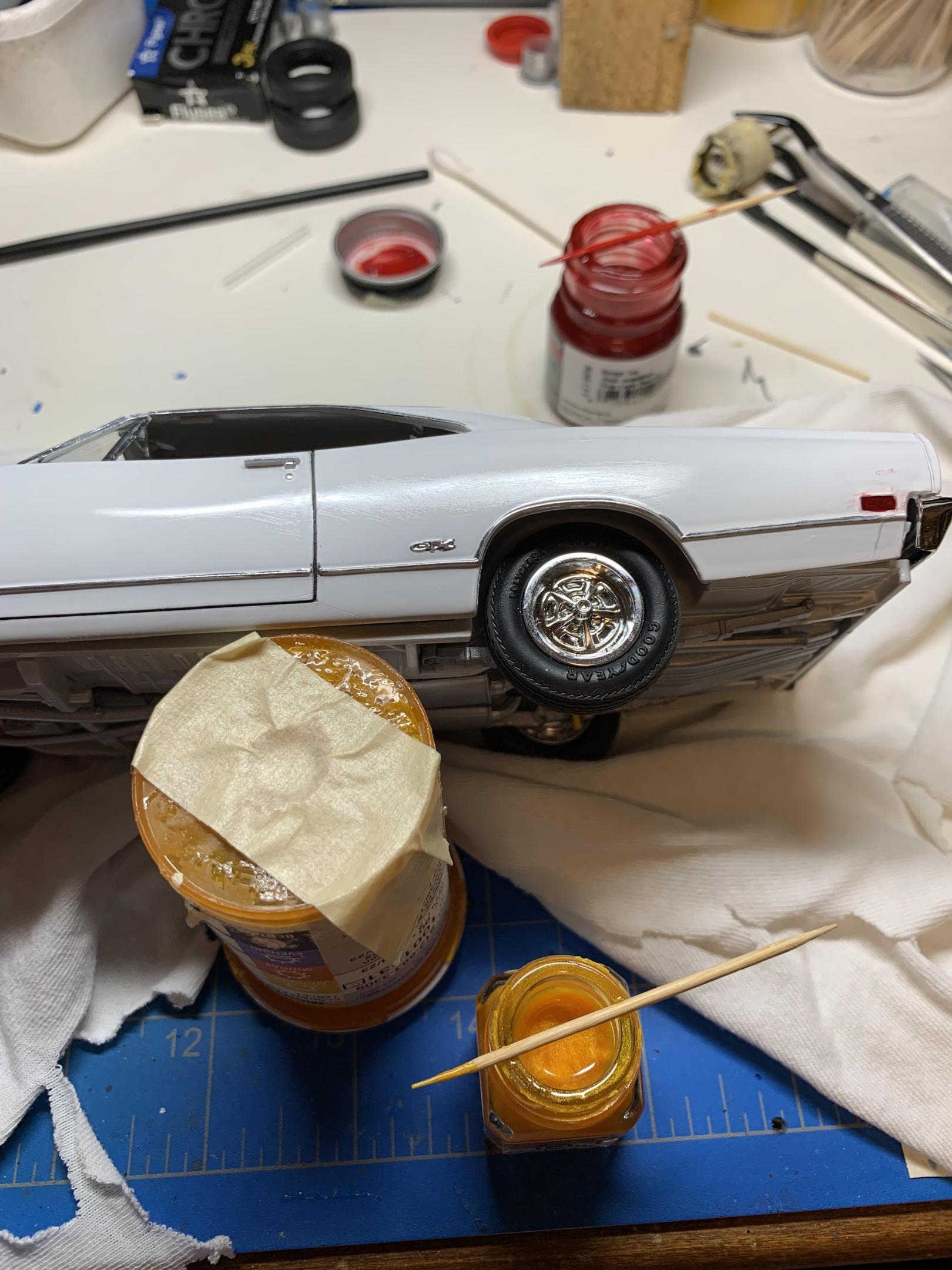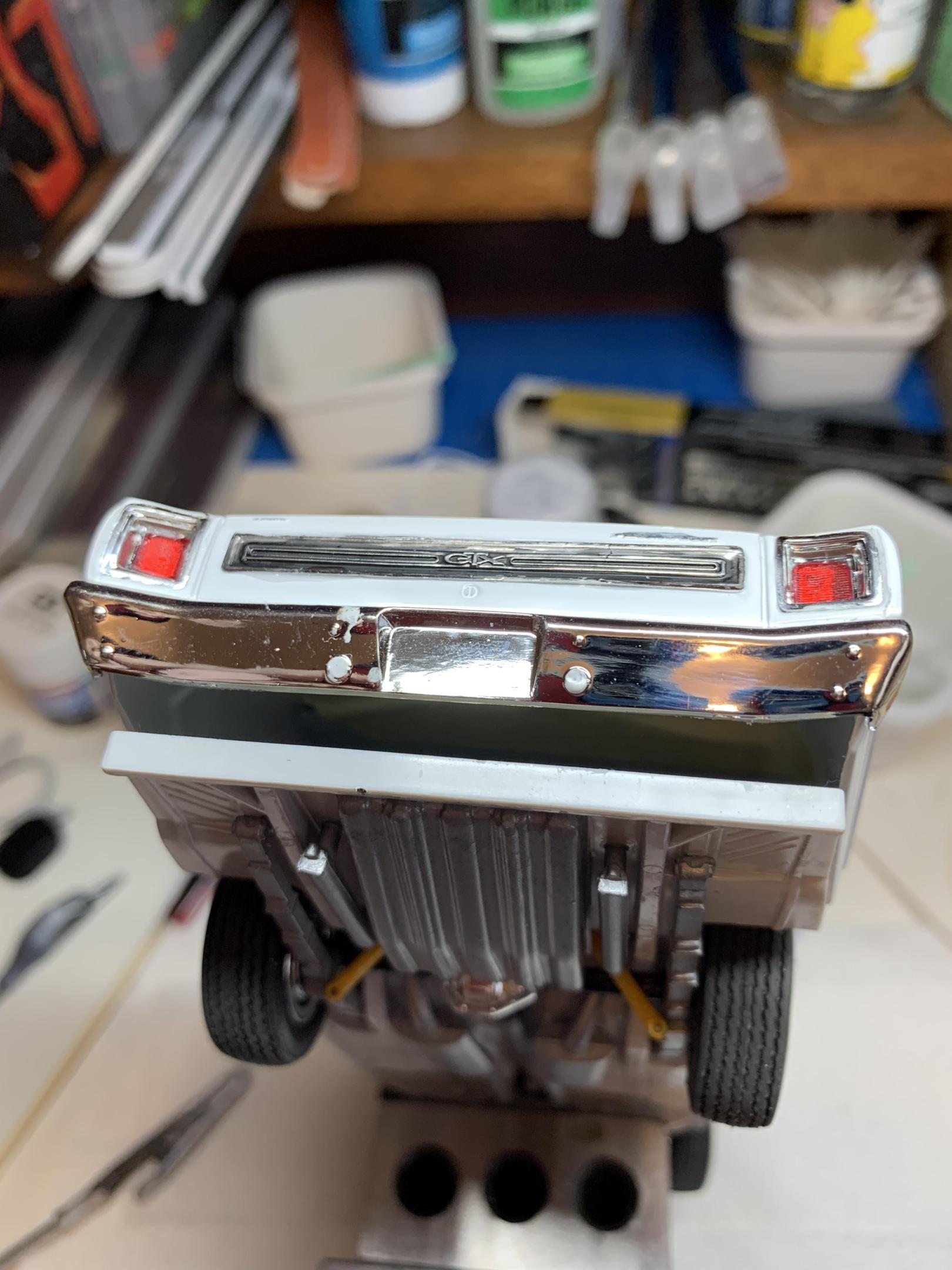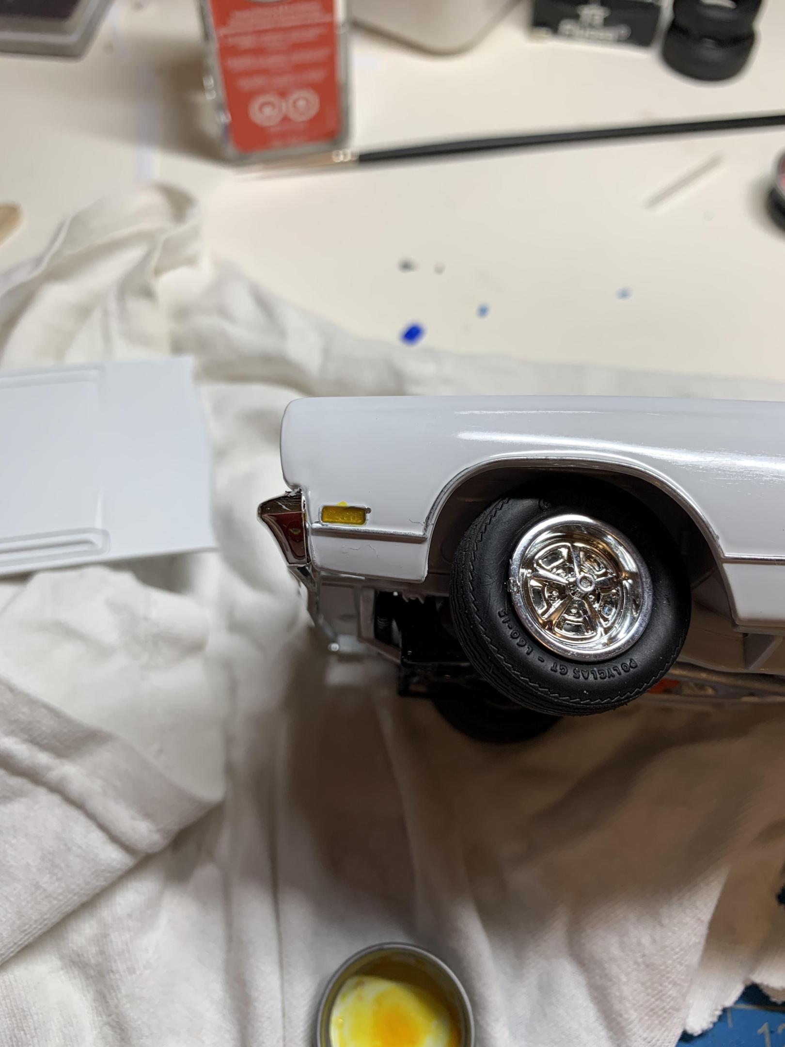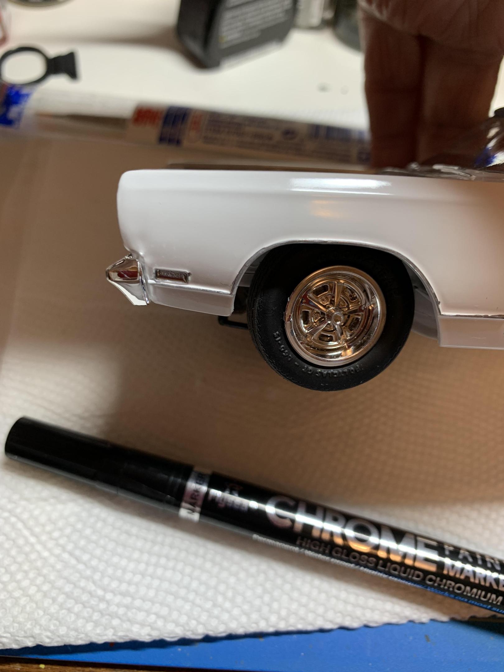 Made the mistake (there’s that word again) of not trial fitting the wheels on the axle stubs before installing the rear and front suspension. Took a lot more time fitting them on and finally glued them on with my high tech alignment jig (Testors bottles and finger nail files because the center of the wheel hit the side of the “jigs”). Dipped the windows in floor polish, used a chrome pen on the trim with less than spectacular results, installed master cylinder and wiper motor, Testors turn signal amber on front turn signals ( kinda redundant, huh?), some black wash on front and rear grill (will need another coat). Installed windows with Mod Podge (gonna let them sit overnight. Getting close to the finish line, that’s all tonight.