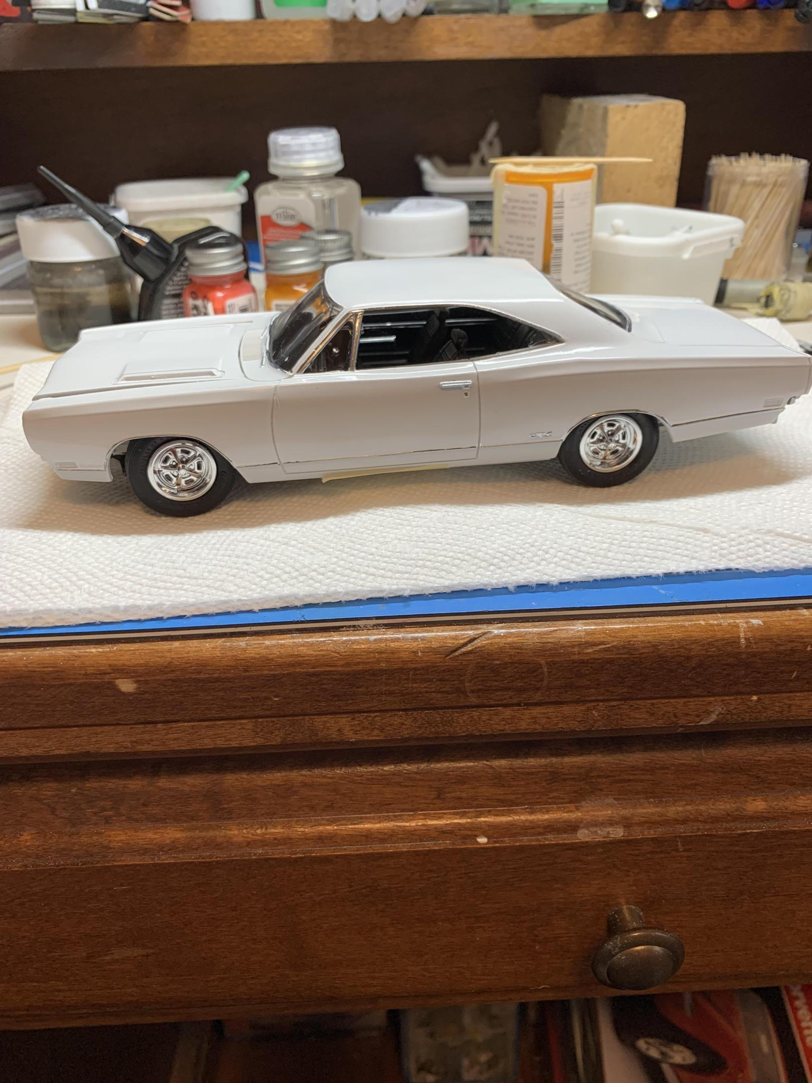 Tried some gray Tamiya panel line accent (too light), then black (too dark). Next time on a light car, perhaps a mixture of the two. Used my Dspiae fountain pen like tool to put it on instead of the Tamiya brush that comes with it. Works pretty good. The brush tends to flood it. I let it dry, then cleaned up the inevitable spots from old, shaky hands with the Testors enamel thinner/brush cleaner. I used the flat silicone nub instead of a q-tip as they tend to soak the accent color out of the panel line. Tried the air cleaner/under hood induction system. Would not shut all the way. Will try some stuff tomorrow to rectify that. Done for today and very close to the finish line for this one.
