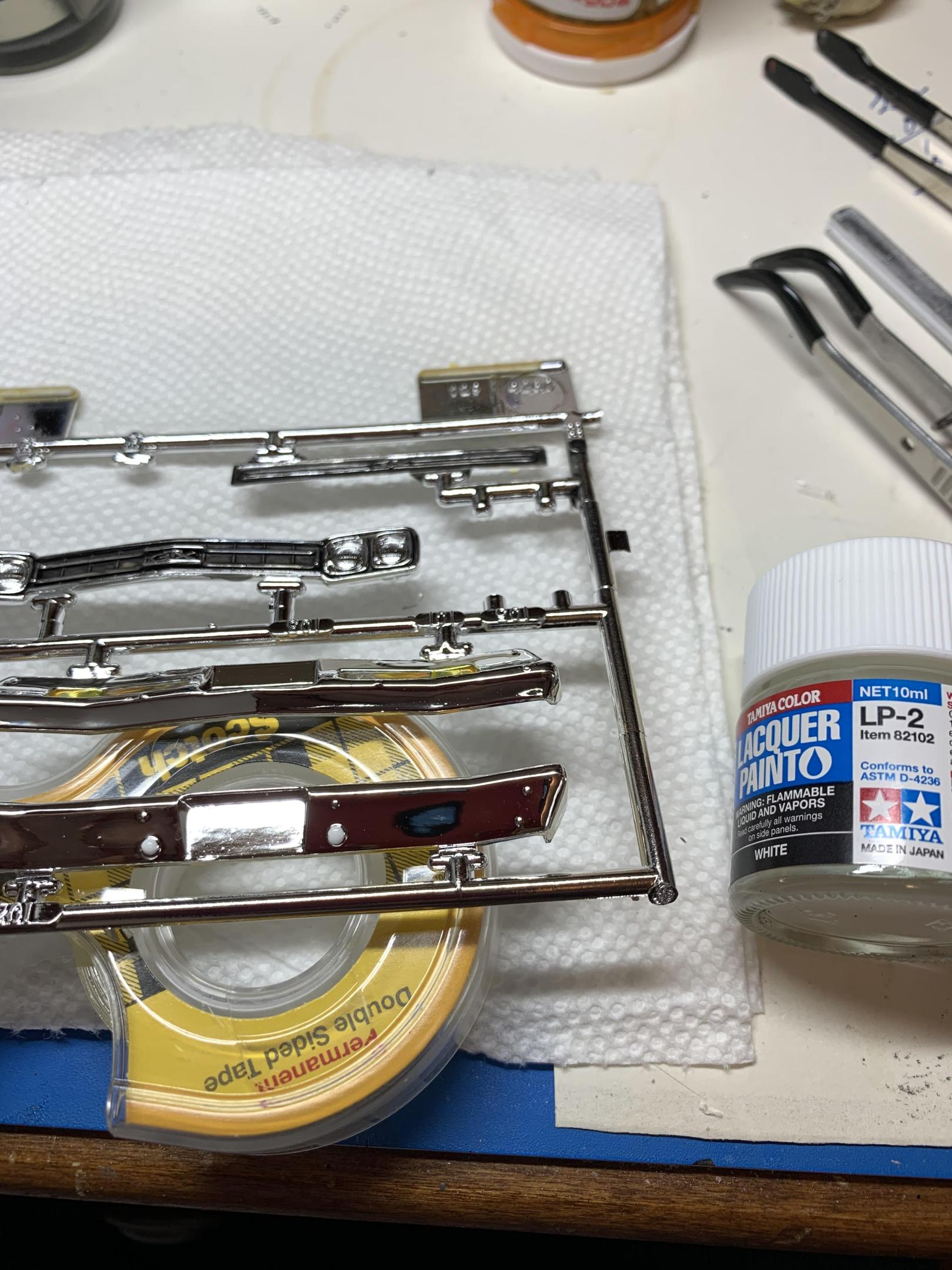 Trial body fit, painted on some license plate (or backup, not sure) lights, super glued rear taillights, rear grille, and bumper. Succeeded in touching wet white pain and smudging rear bumper (will remove later with lacquer thinner). Decided to walk away from bench for a while before I screw something else up.