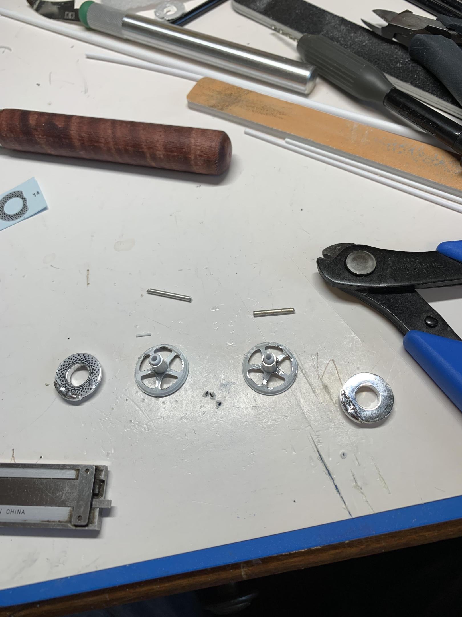 Thanks and I agree wholeheartedly. Made some wheel hubs out of aluminum and styrene tubing. A lot of tools and some head scratching later and I have 2 bushings inside 2 bushings which will have 2 more pins attached later to mount the wheels. Now I need another bushing to space the caliper back from the wheel. -