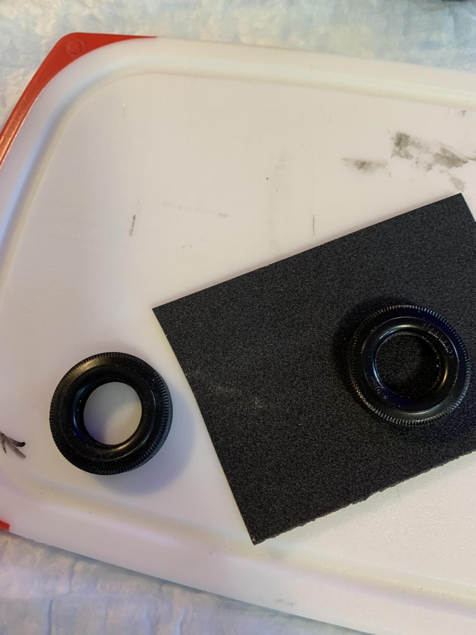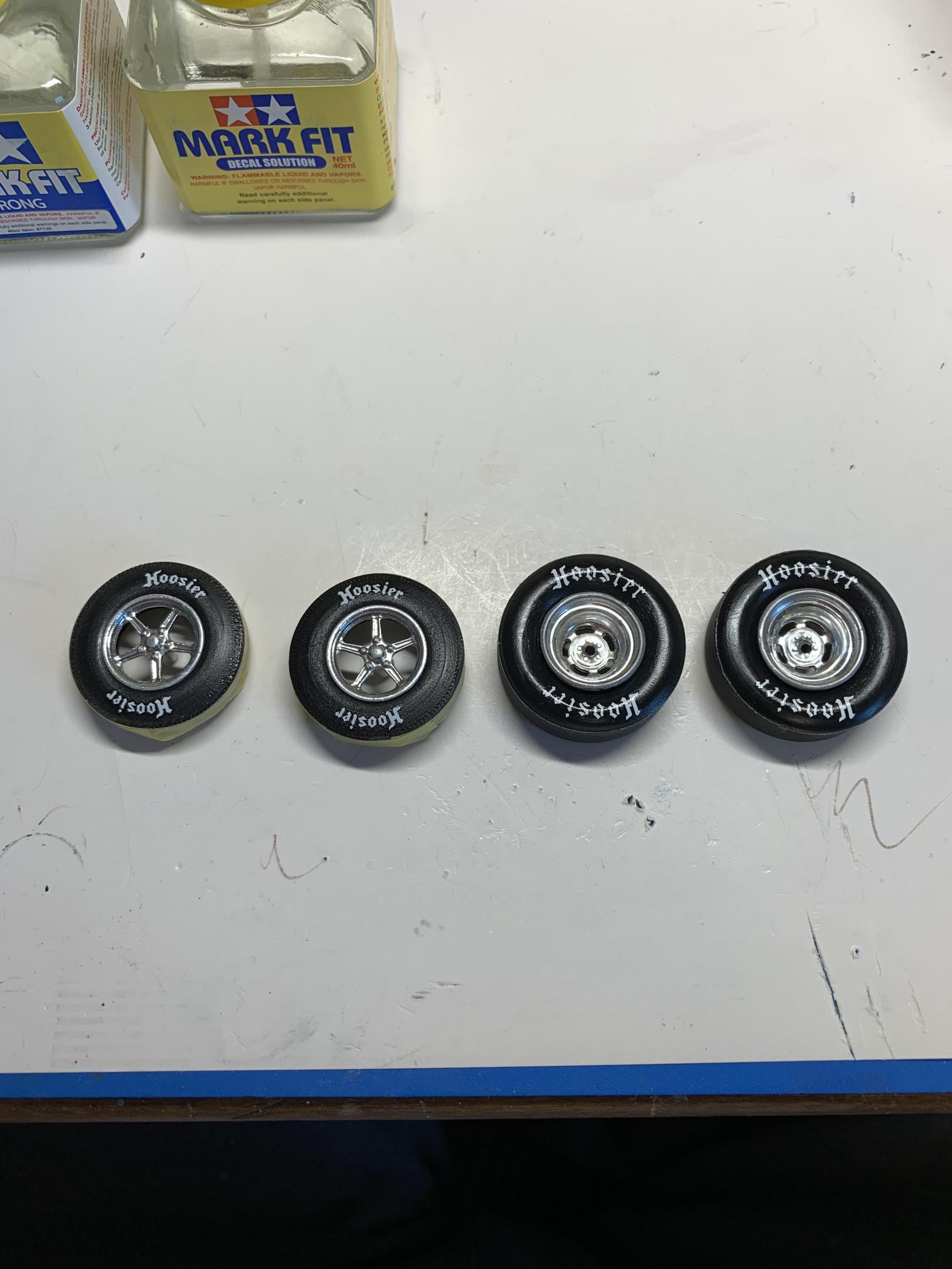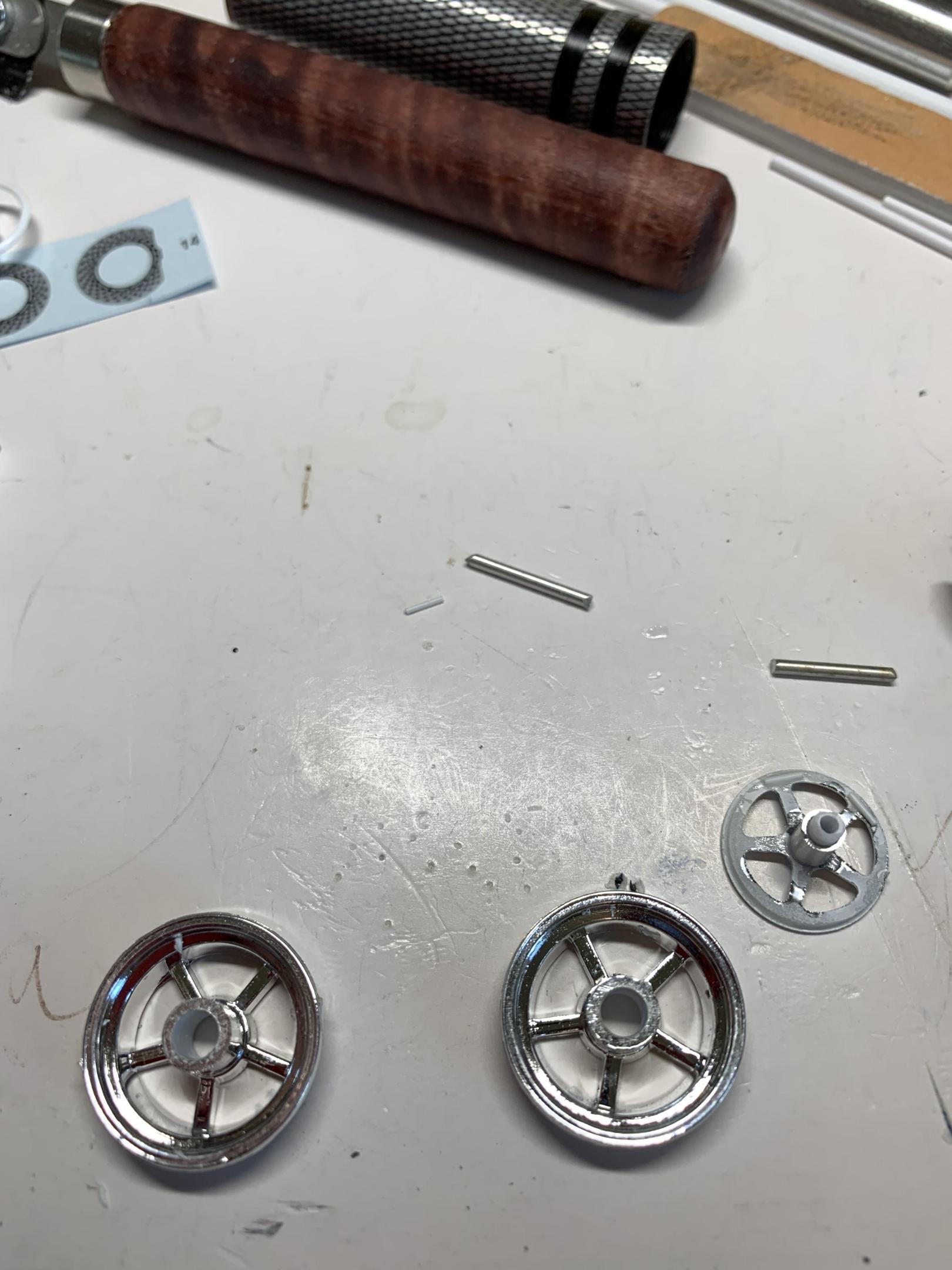 Again, thanks for the kind words, gentlemen. My “builder’s block” not withstanding, I am trying to keep moving on and not be so particular. I had some 3D printed shifters that I got a while back on eBay. Though not an exact match for the TurboAction SCS shifter in Mike’s car (one of the most popular shifters used in current Stock Eliminator drag cars) no one makes anything like them that I know of. So, I am modifying one with some square styrene. I started to scratch build one, but decided against it . The shoulder harness kit that I had is not designed for the 3” wide belts that have been required for some time. The ends will not accept .120” wide harness material so, I think I am going to leave them off. Oh yeah, started on the front wheel . -