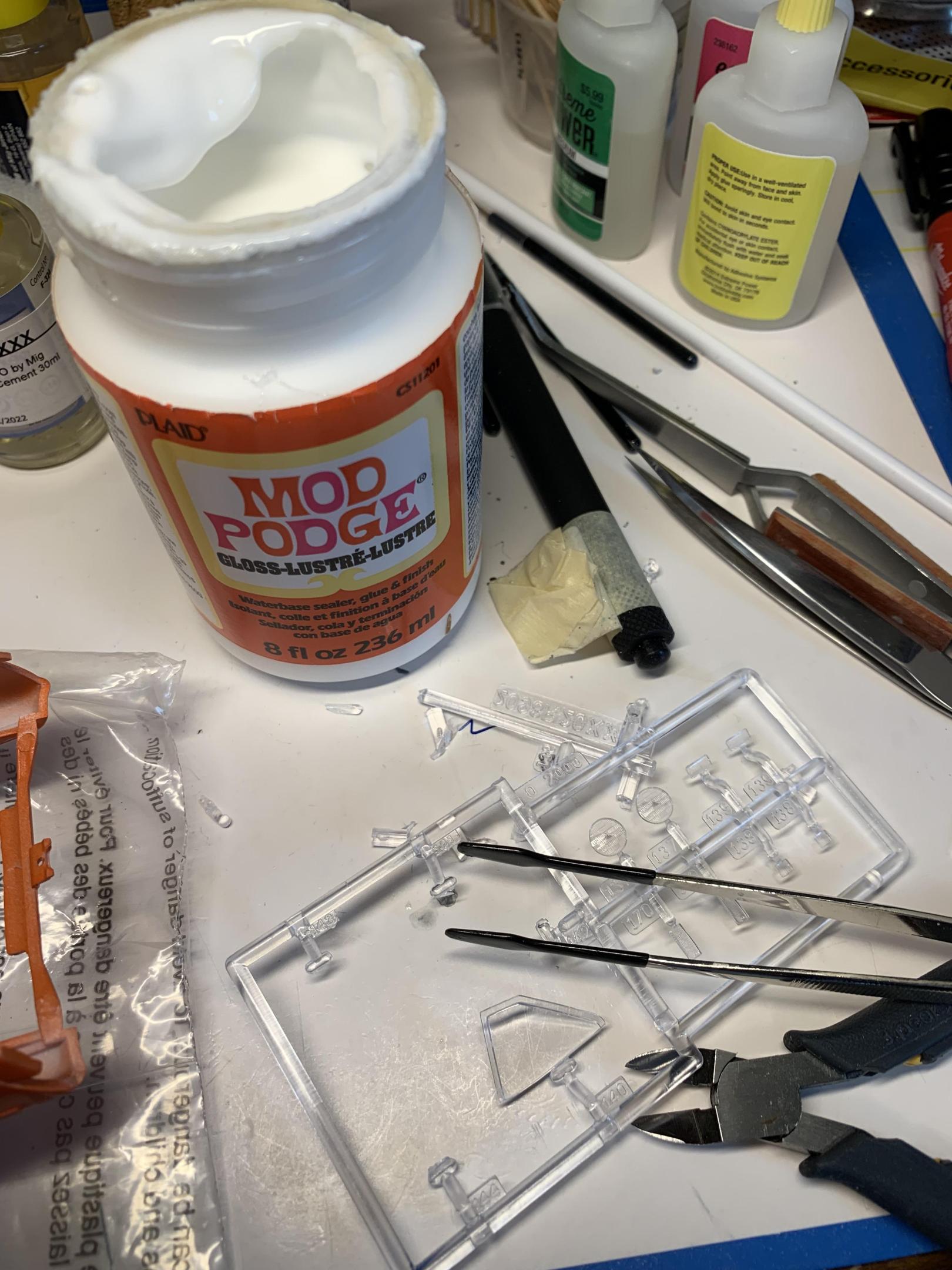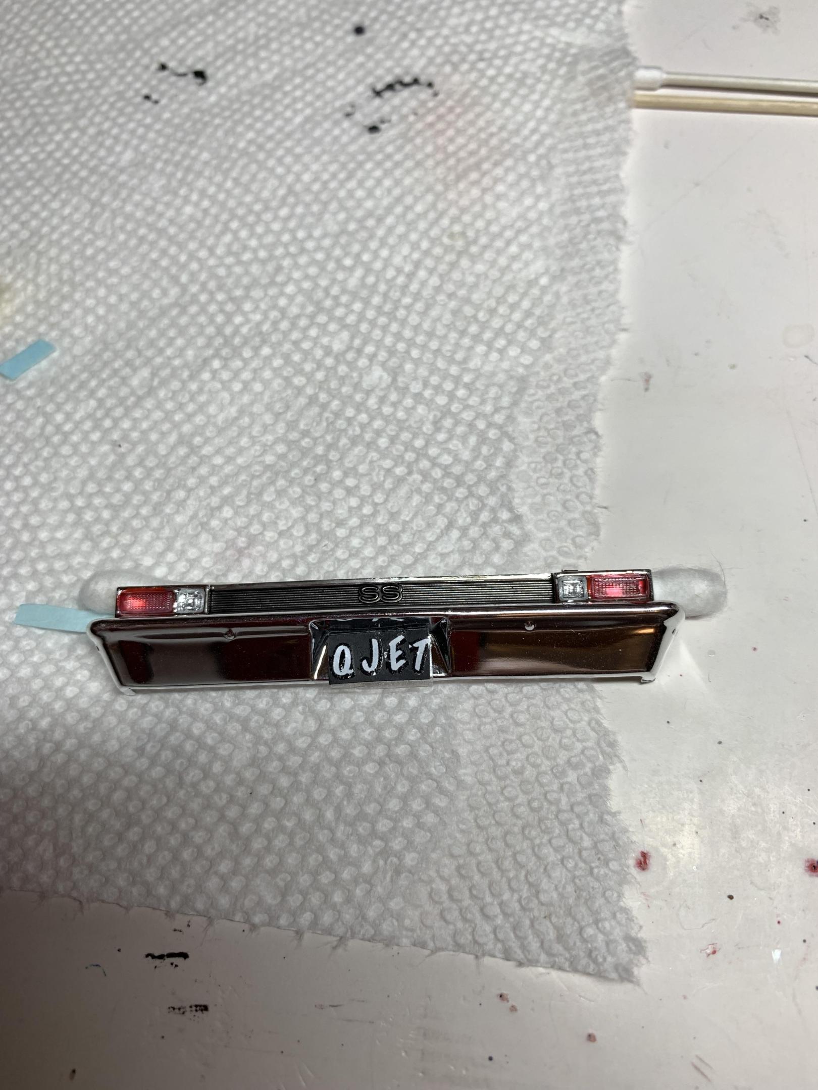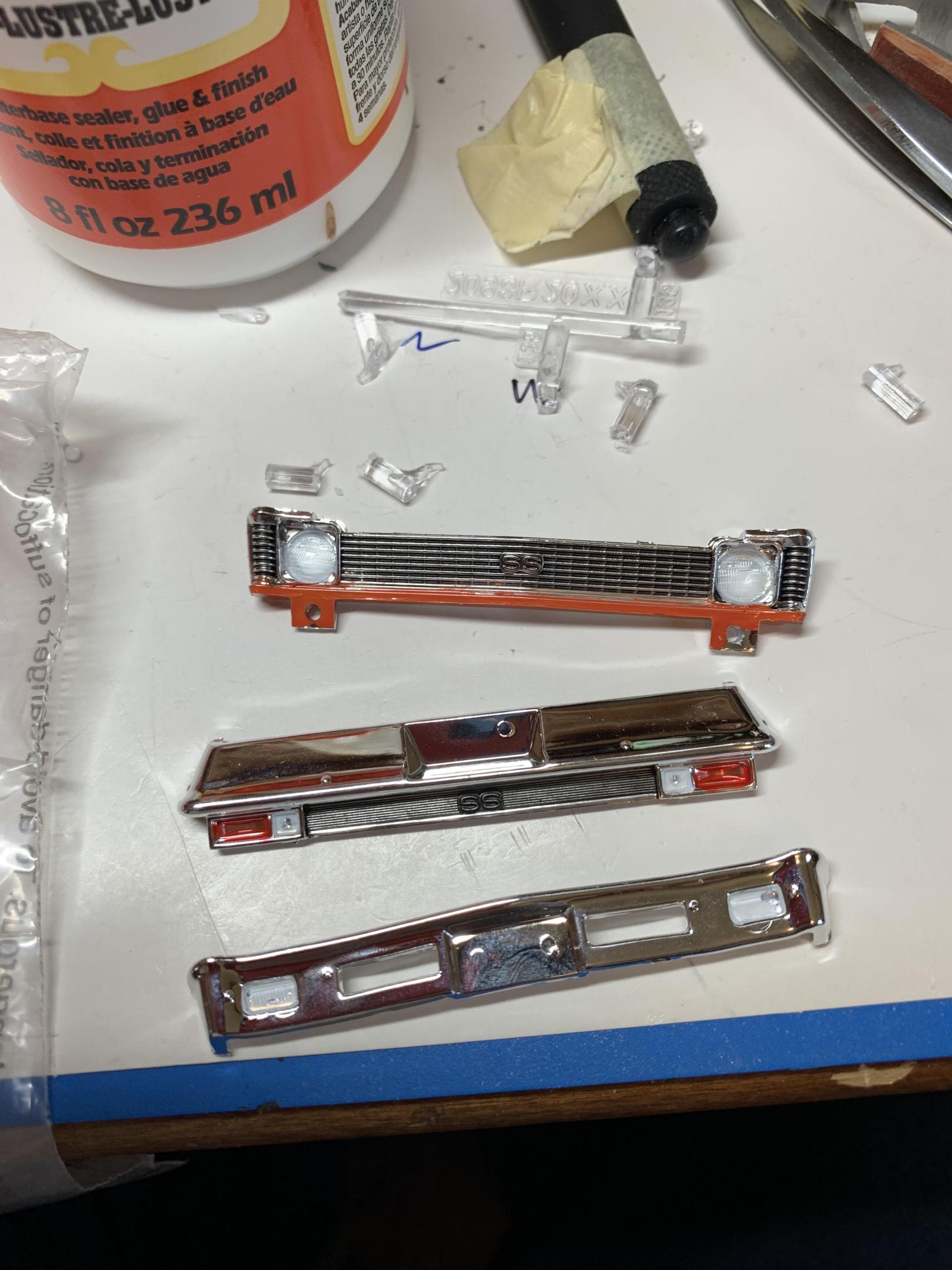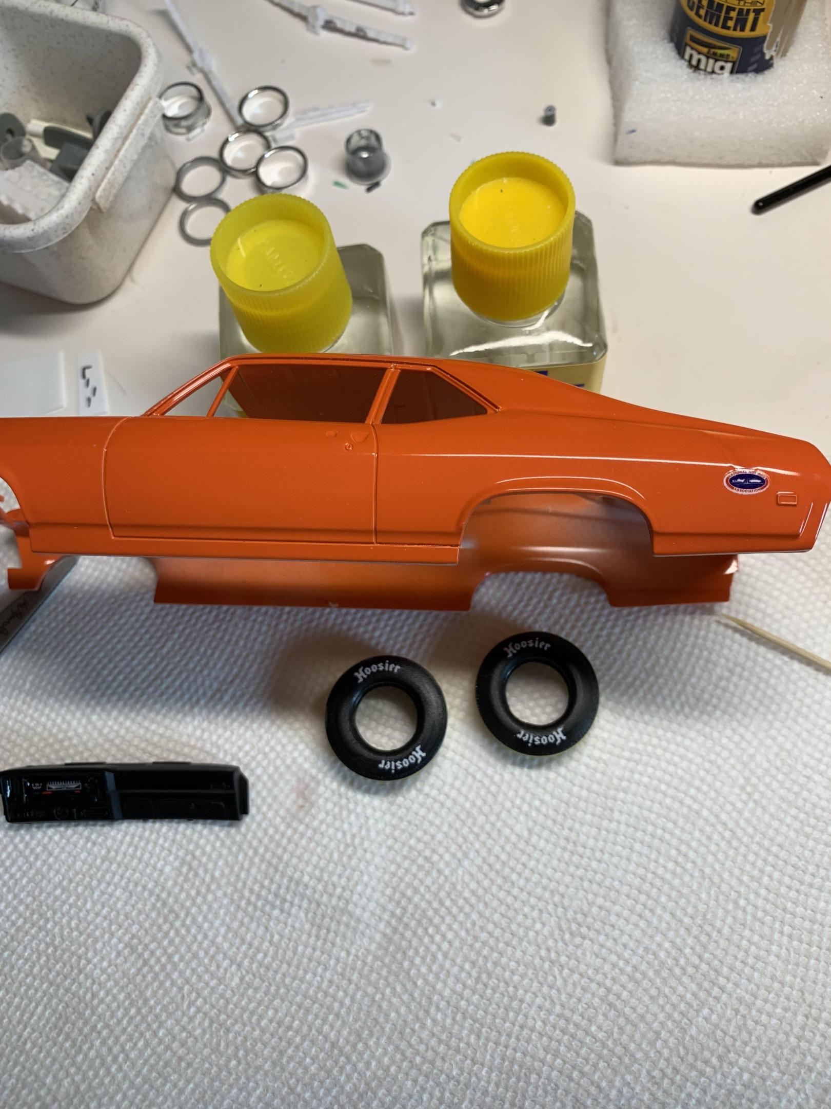 Thanks, guys. Well, I am not going to meet my goal of finishing today. Glued some windows in, superglued the front inner wheel halves on, painted the tailights bezels with modelmasters stop light red, some clear parts on the bumpers. Don’t know what I would do without my excellent sprue cutters on the clear parts that leave essentially no nubs protruding. Also, the rubber coated tweezers are great. -